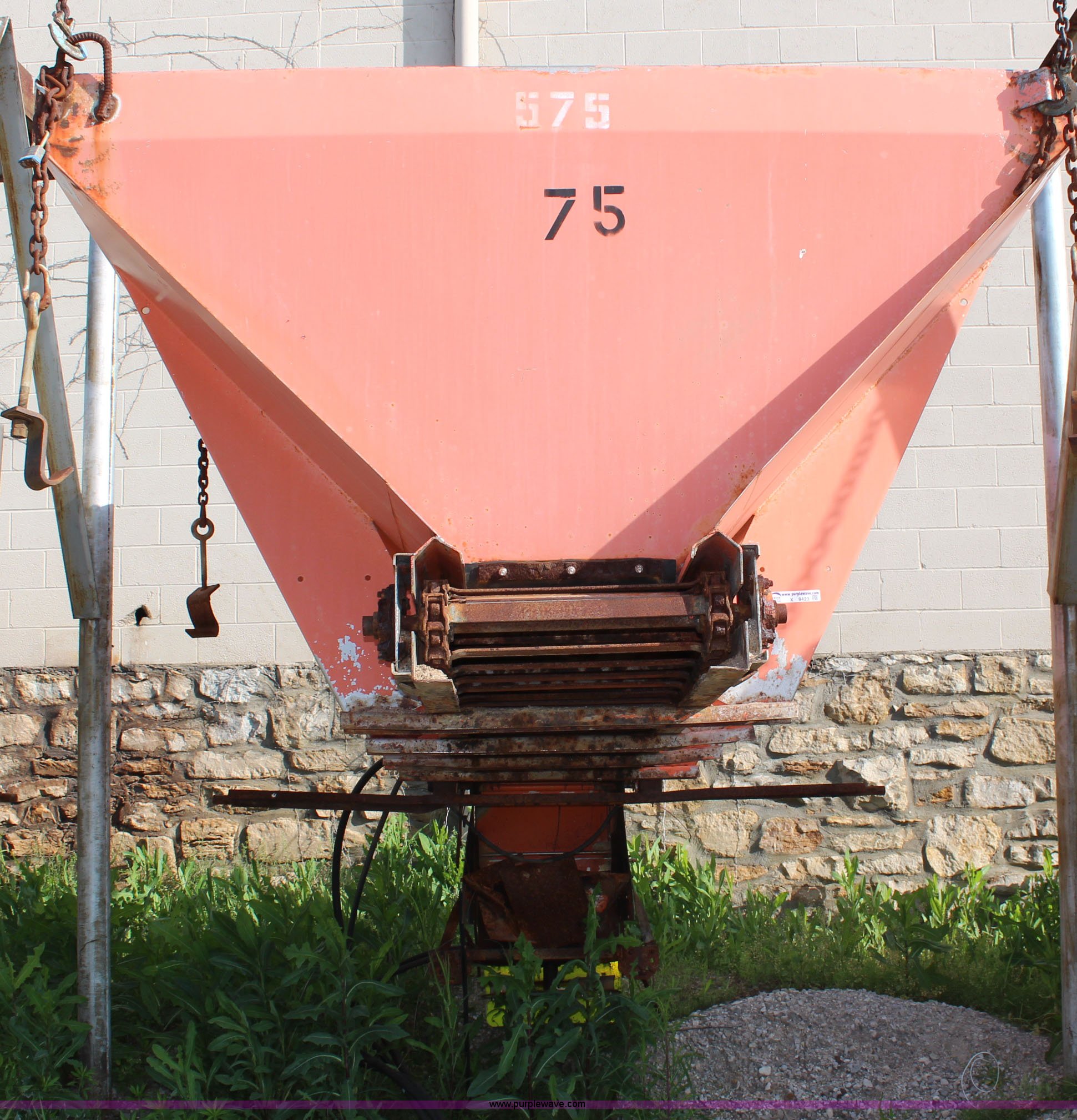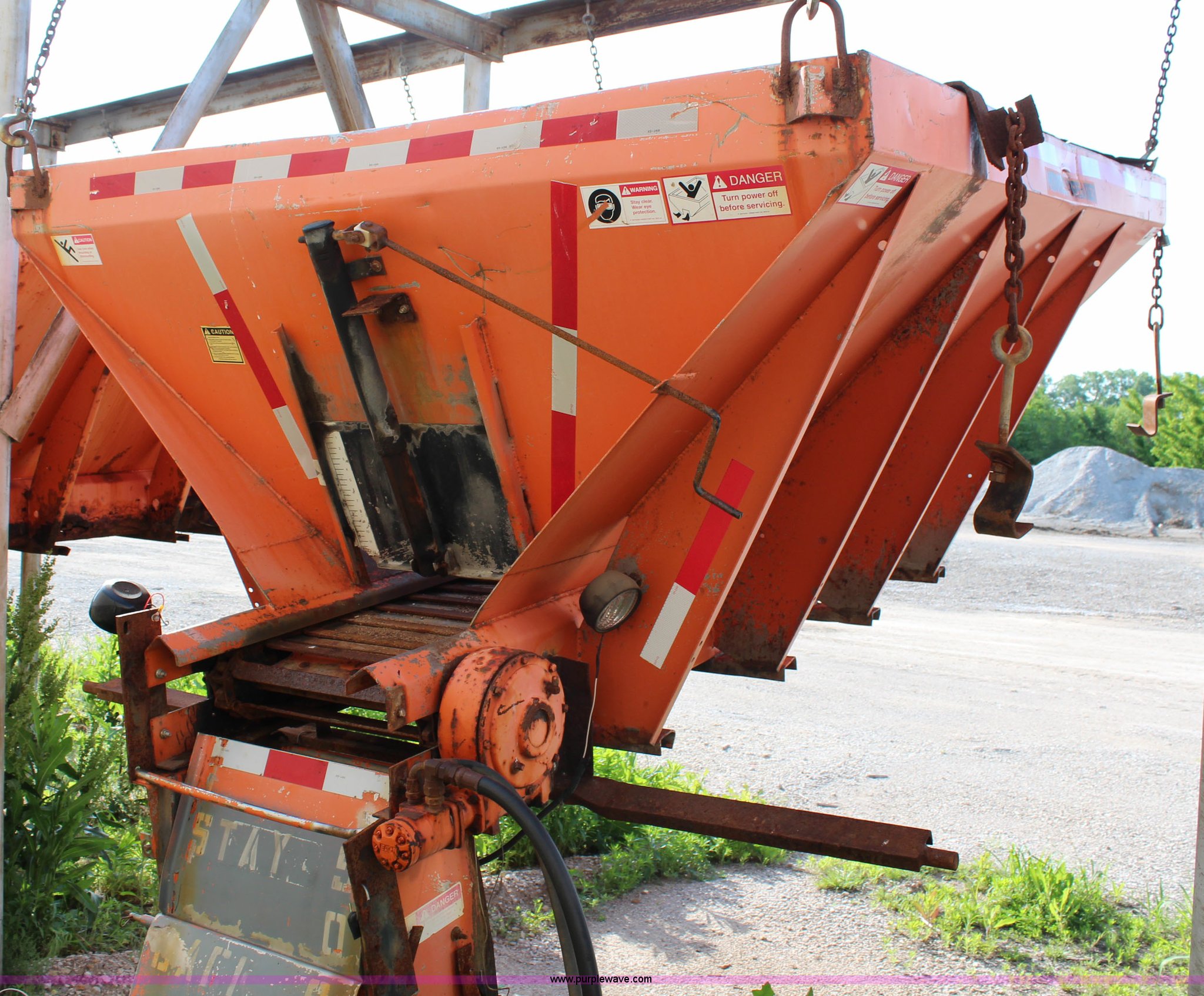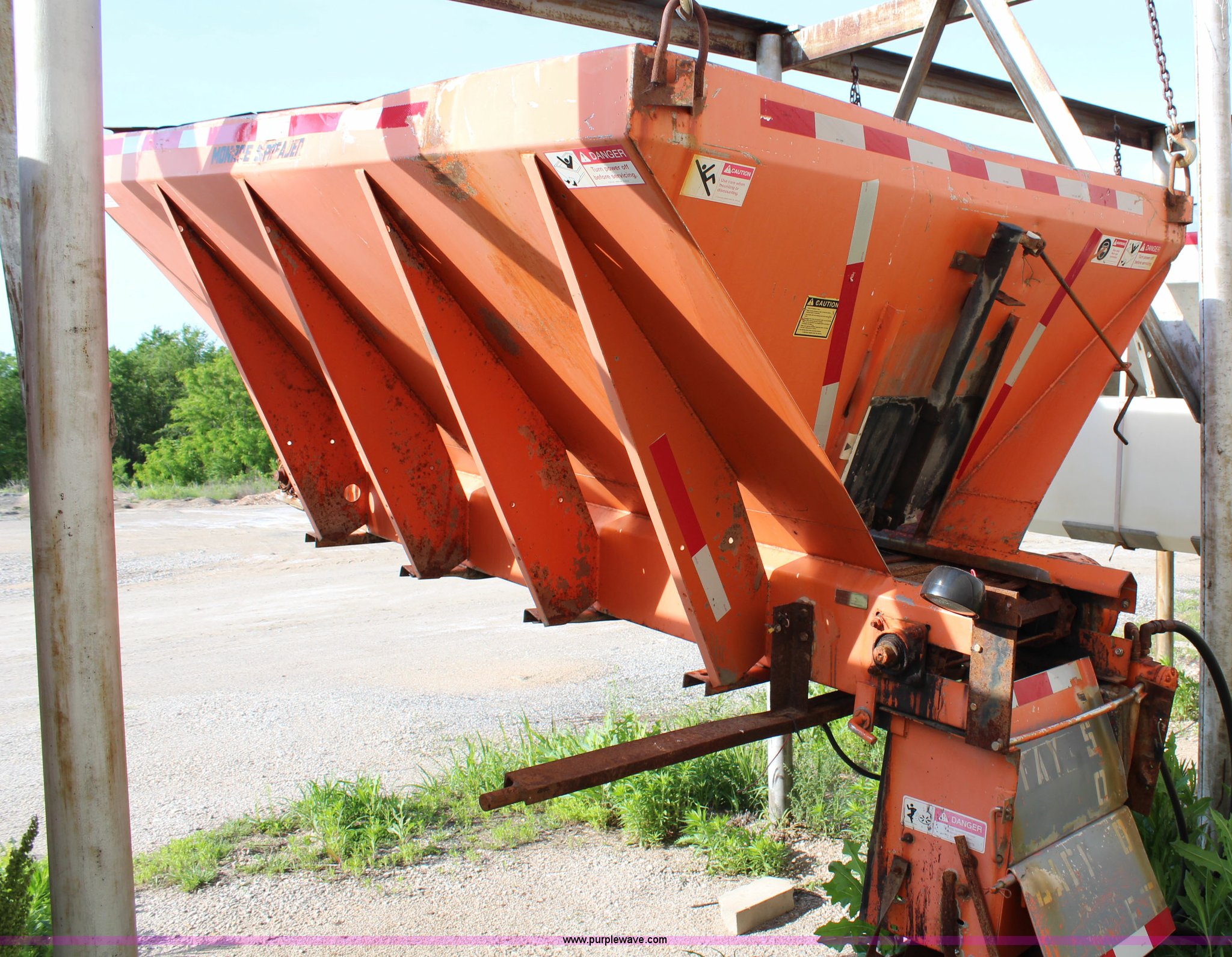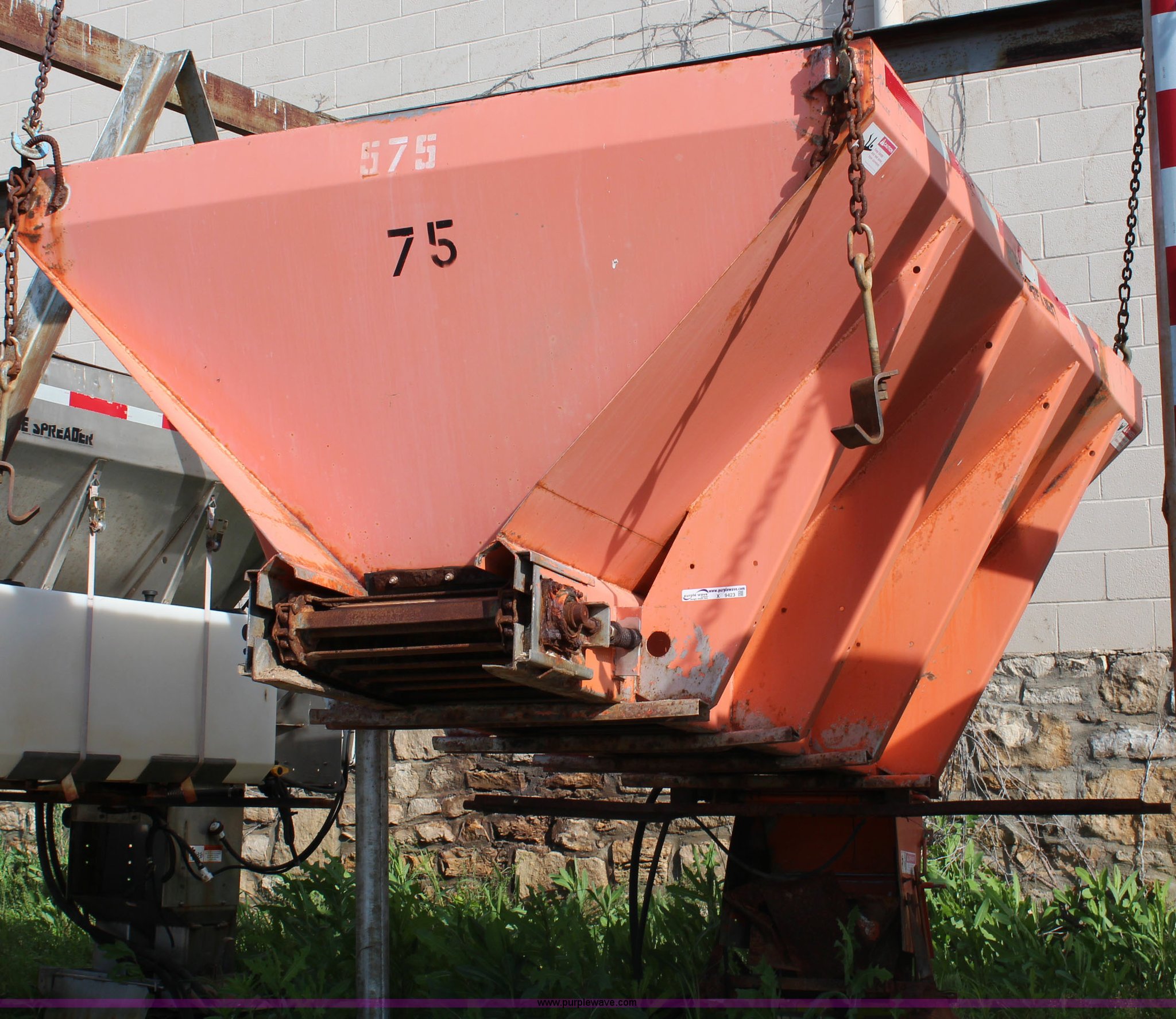 Purple Wave is selling a used Truck Part and Attach. in Kansas. This item is a Monroe stainless steel sand spreader with the following: 9'L, 22"W chain, Model 10884-50/4091007, Single spinner, Serial 95-17-6063