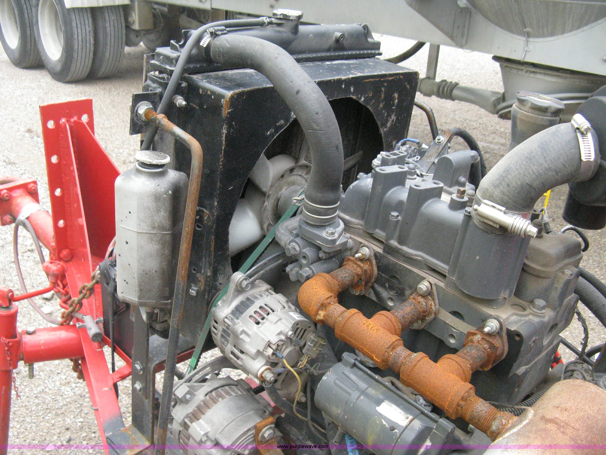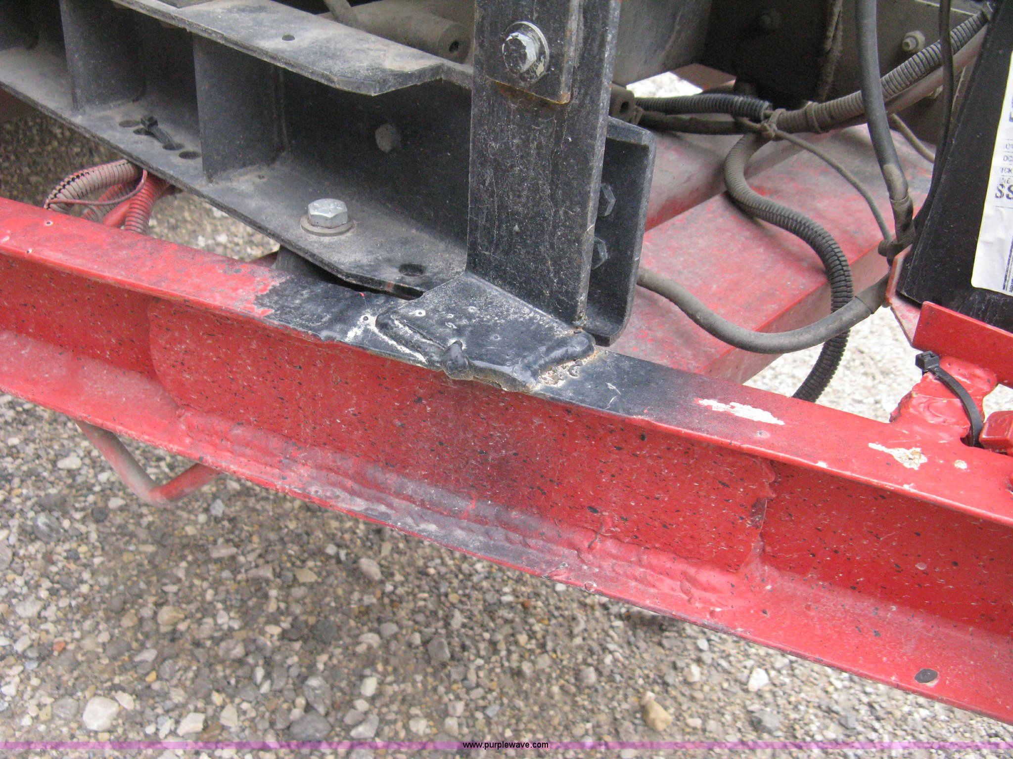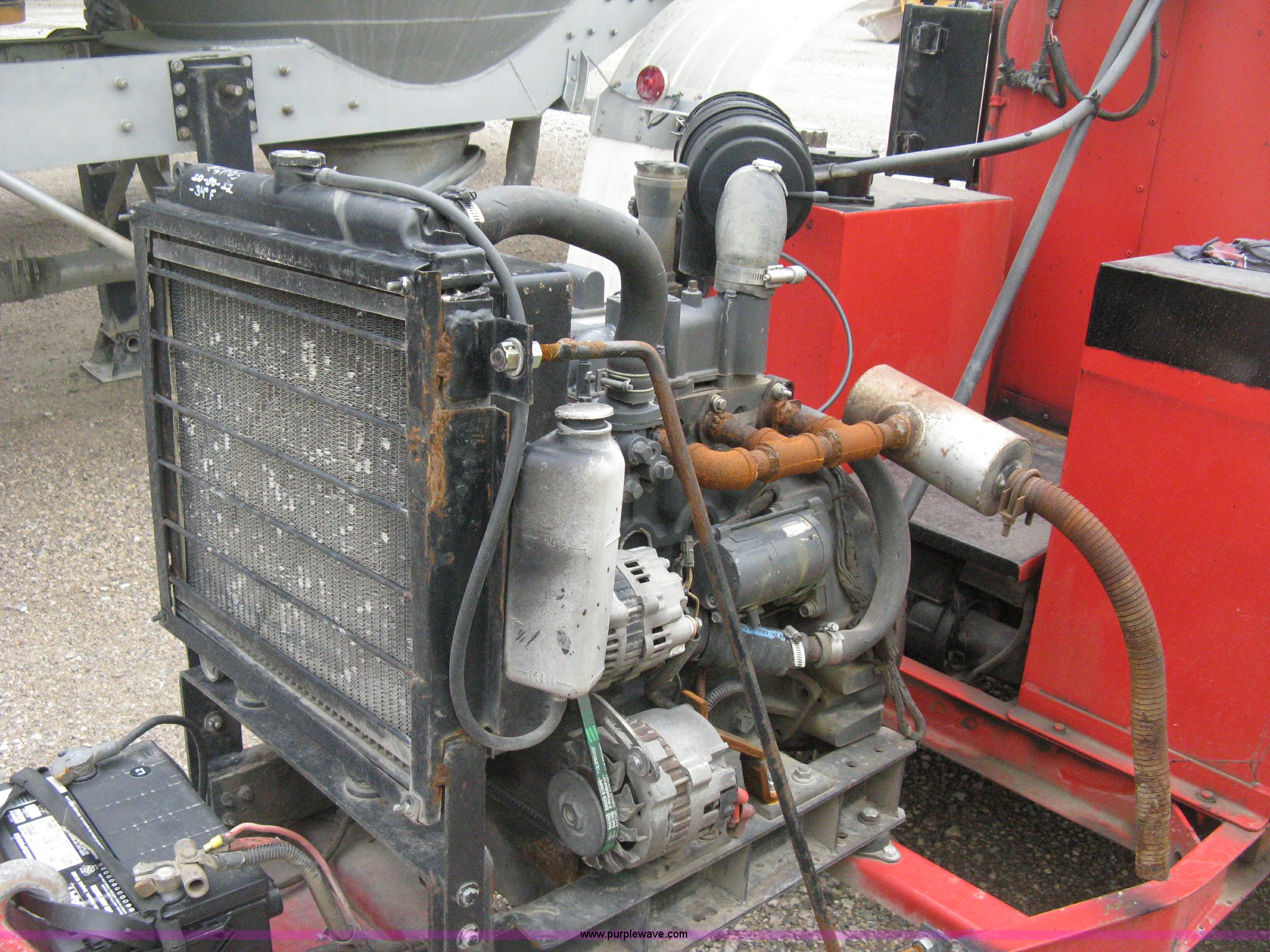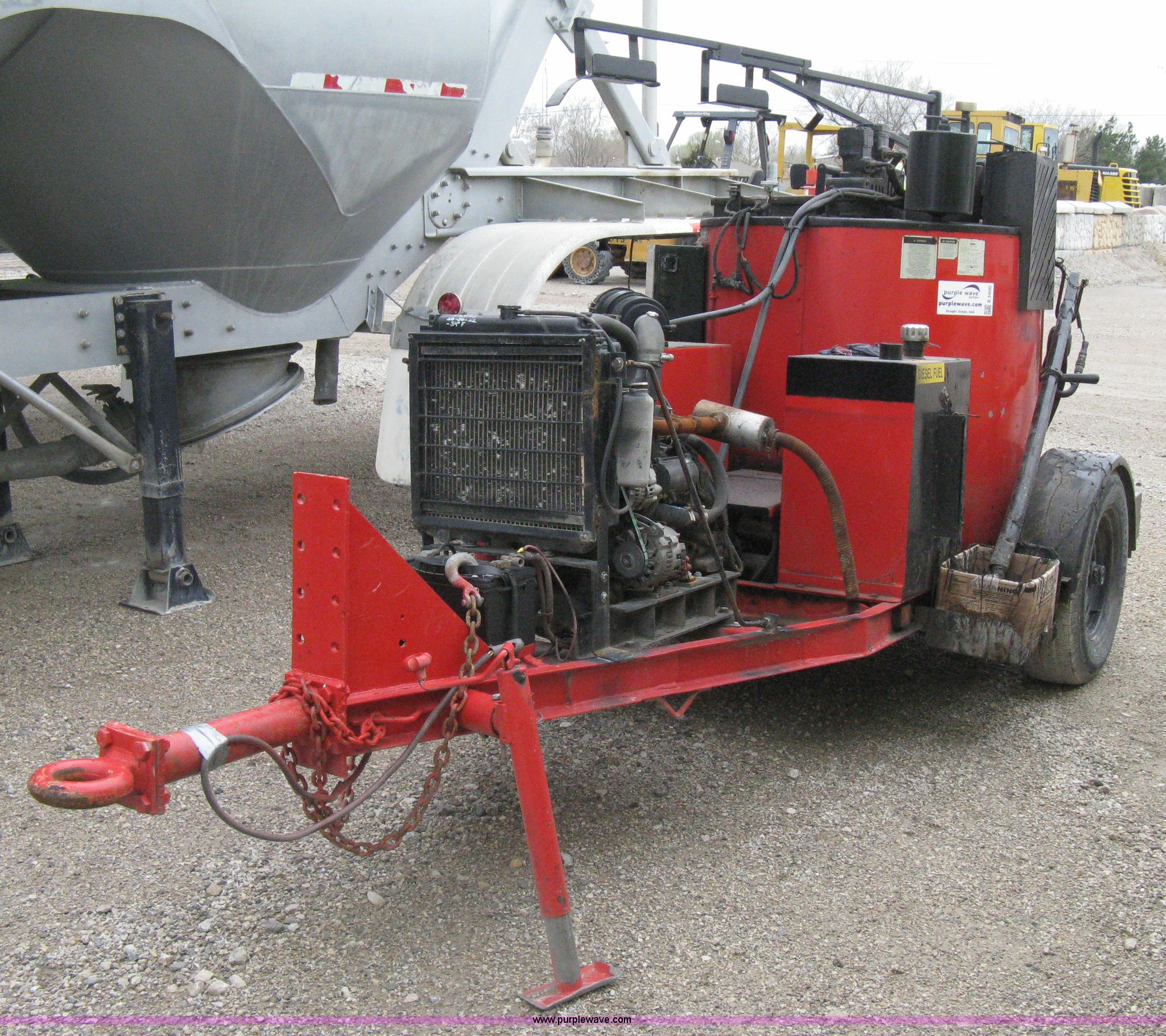 Purple Wave is selling a used Pot Hole Patcher in Kansas. This item is a 2003 Crafco SS125 hot melter applicator with the following: 7,357 hours on meter, New Holland three cylinder diesel engine, Key start, Hose and application wand, 1,250 lb product capacity, Trailer mounted, Pintle hitch, Six lug wheels, ST225/75R15 tires, Weld repairs to trailer frame body, Serial 109SY101831418297