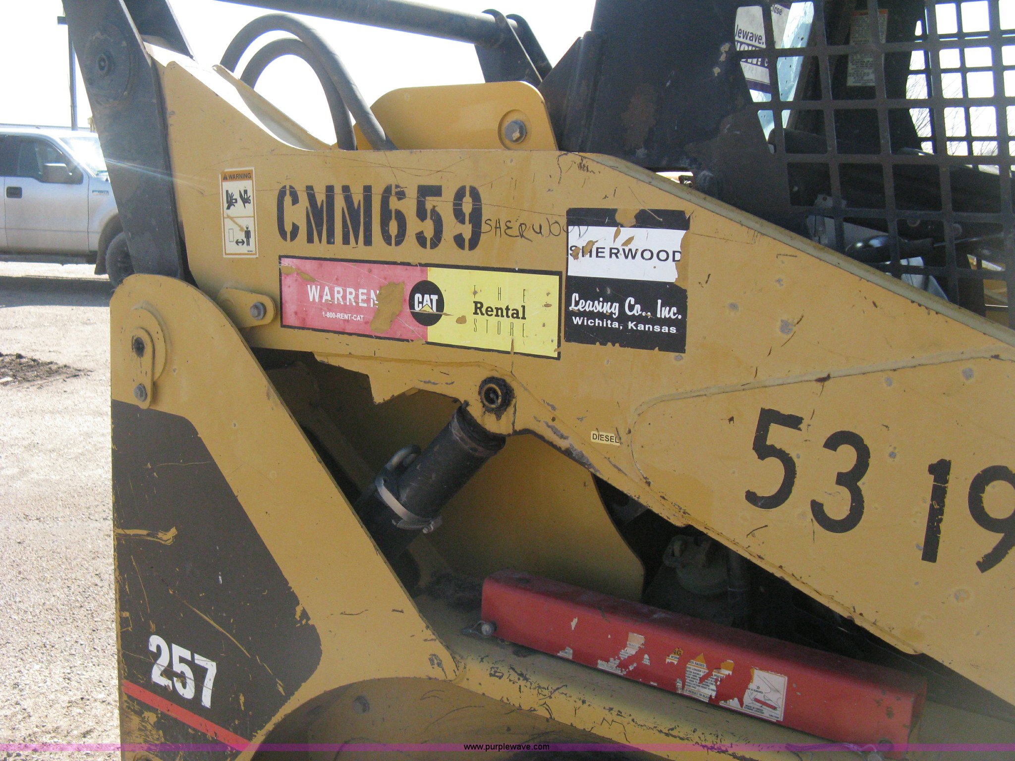 Purple Wave is selling a used Tracked Skid Steer Loader in Kansas. This item is a 2002 Caterpillar 257 skid steer with the following: 1,473 hours on meter, Hour meter replaced in 2009 at approx 5,000 hours, Caterpillar four cylinder diesel engine, OROPS, Joystick loader control, Auxiliary hydraulics, Caterpillar 67" quick attach bucket, Recently replaced bolt-on edge, ASV undercarriage, 15" rubber tracks, Service records on file, One owner, Fuel pump recently replaced, Serial CAT00257ACMM00659, Unit# 53.19L