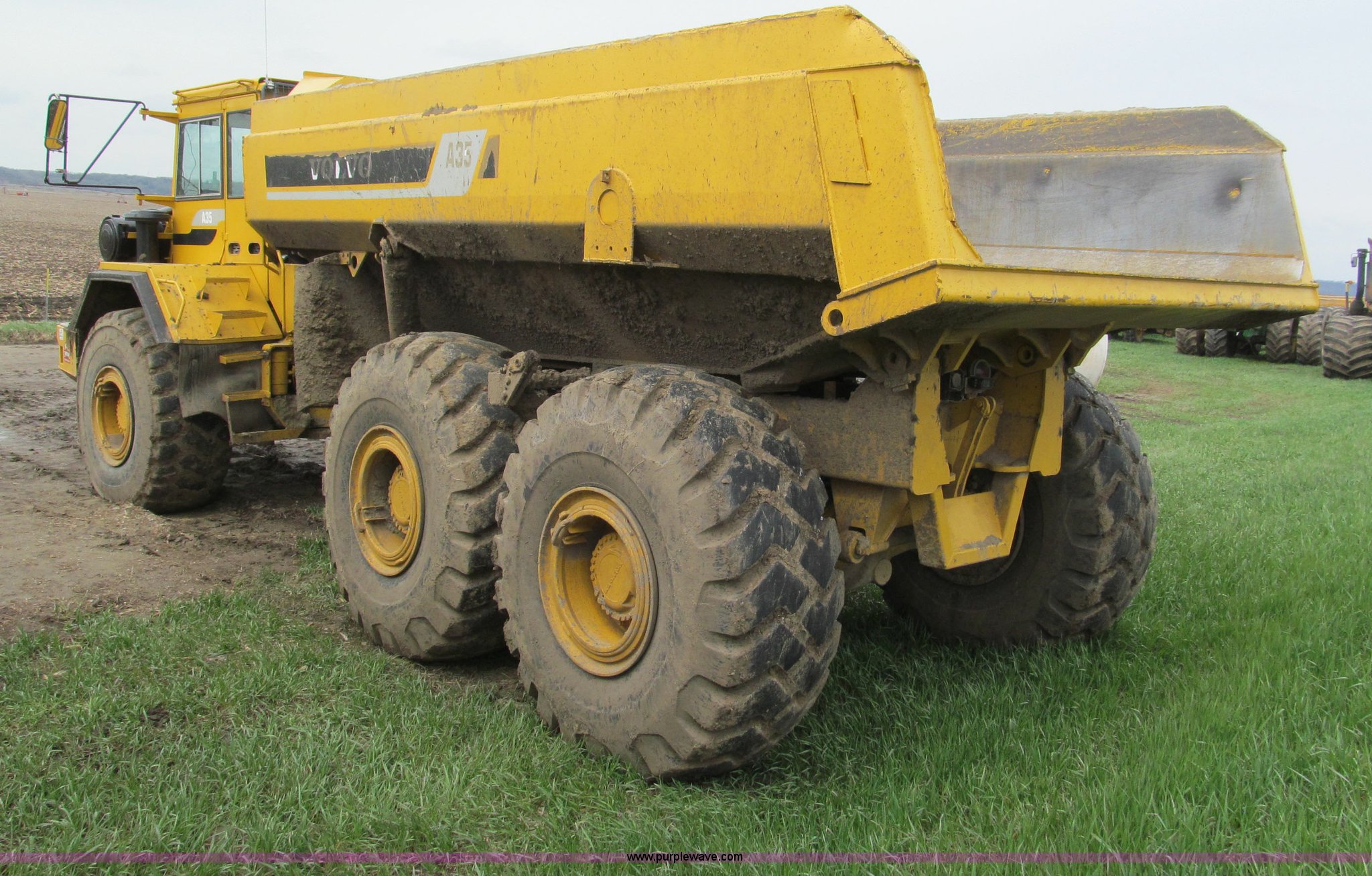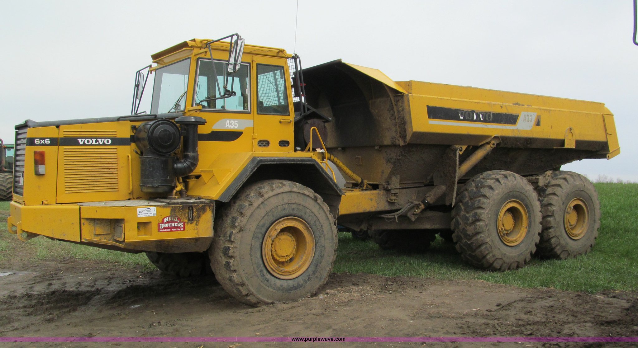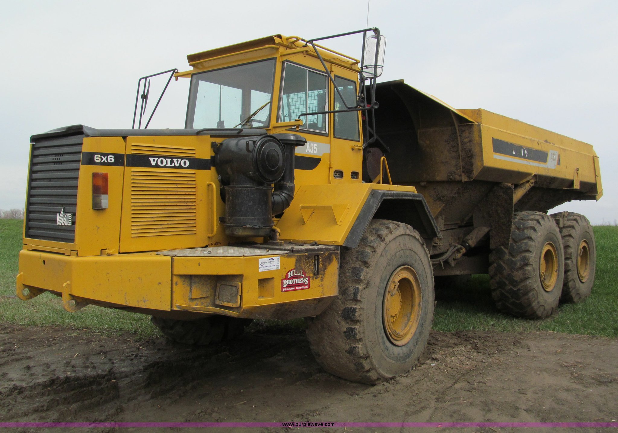 Purple Wave is selling a used Articulated Haul Truck in Nebraska. This item is a 1995 Volvo A35 haul truck with the following: 10,060 hours on meter, Volvo TD122GA 12L six cylinder diesel engine, Six speed automatic transmission, (2) reverse gears, AC and heat, 35' x 10.5' x 11.5' overall dimensions, 18.8 cu. yd. struck capacity, 24.9 cu. yd. heaped capacity, 73 degree maximum dump angle, 70,548 lbs payload capacity, 17'7" wheelbase, 26.5R25 tires, Serial A35V2853