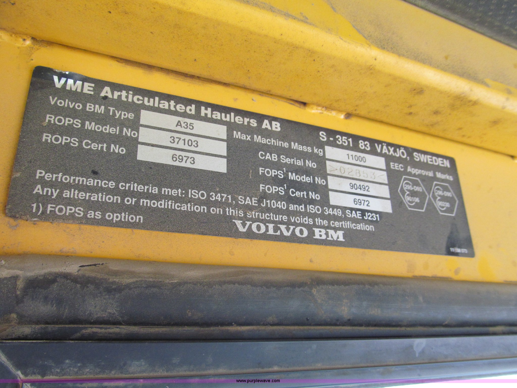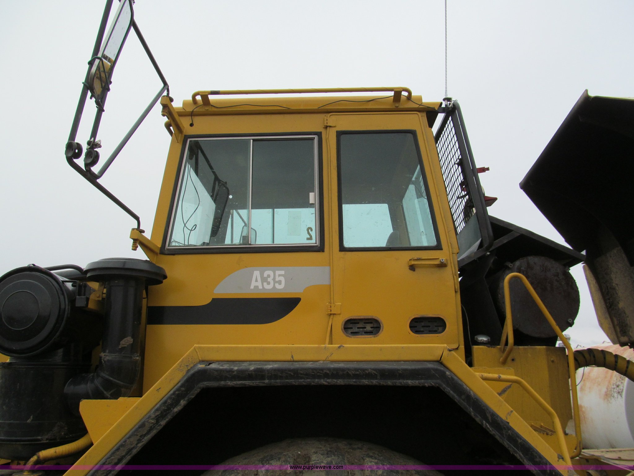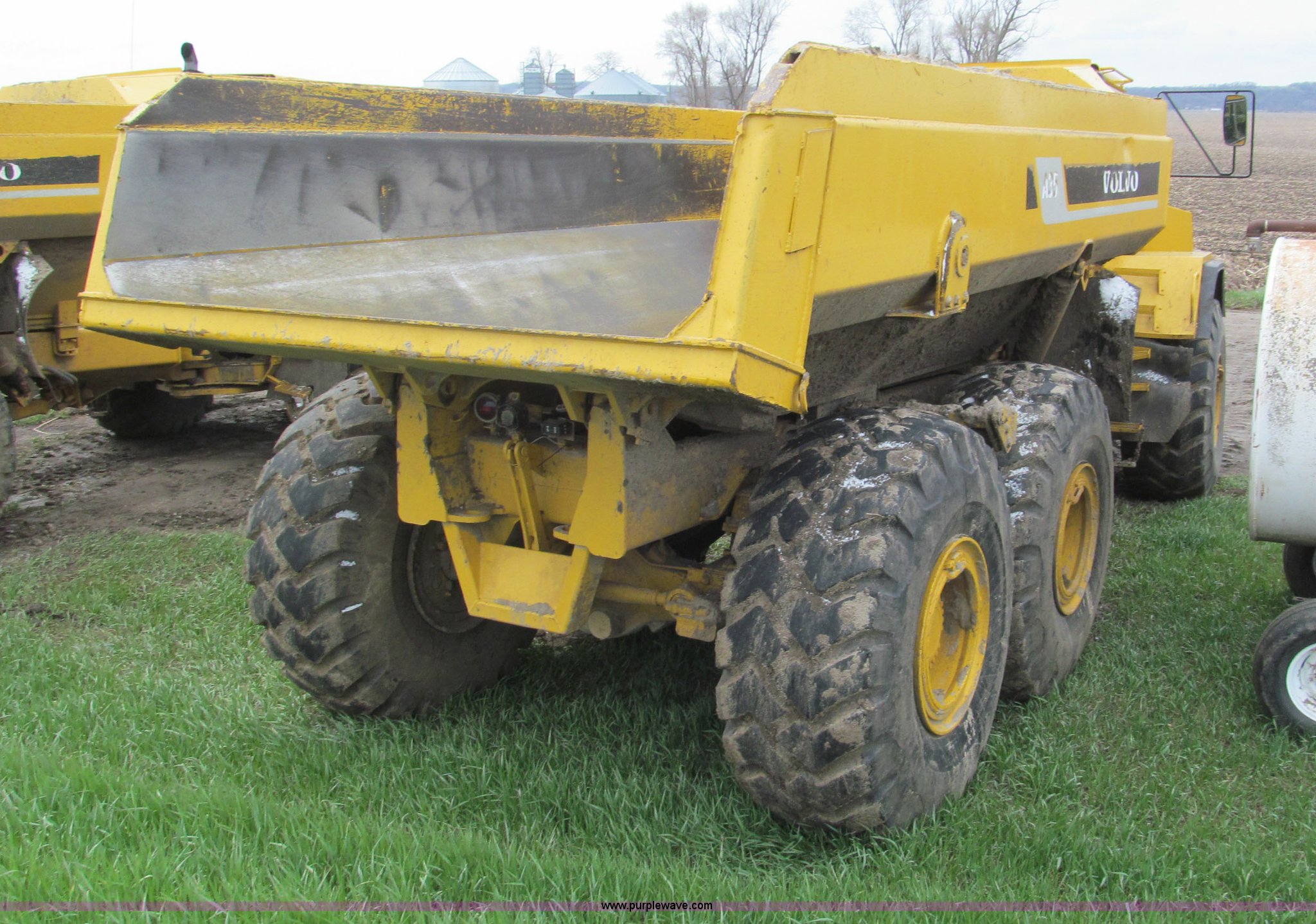 Purple Wave is selling a used Articulated Haul Truck in Nebraska. This item is a 1995 Volvo A35 haul truck with the following: 10,060 hours on meter, Volvo TD122GA 12L six cylinder diesel engine, Six speed automatic transmission, (2) reverse gears, AC and heat, 35' x 10.5' x 11.5' overall dimensions, 18.8 cu. yd. struck capacity, 24.9 cu. yd. heaped capacity, 73 degree maximum dump angle, 70,548 lbs payload capacity, 17'7" wheelbase, 26.5R25 tires, Serial A35V2853
