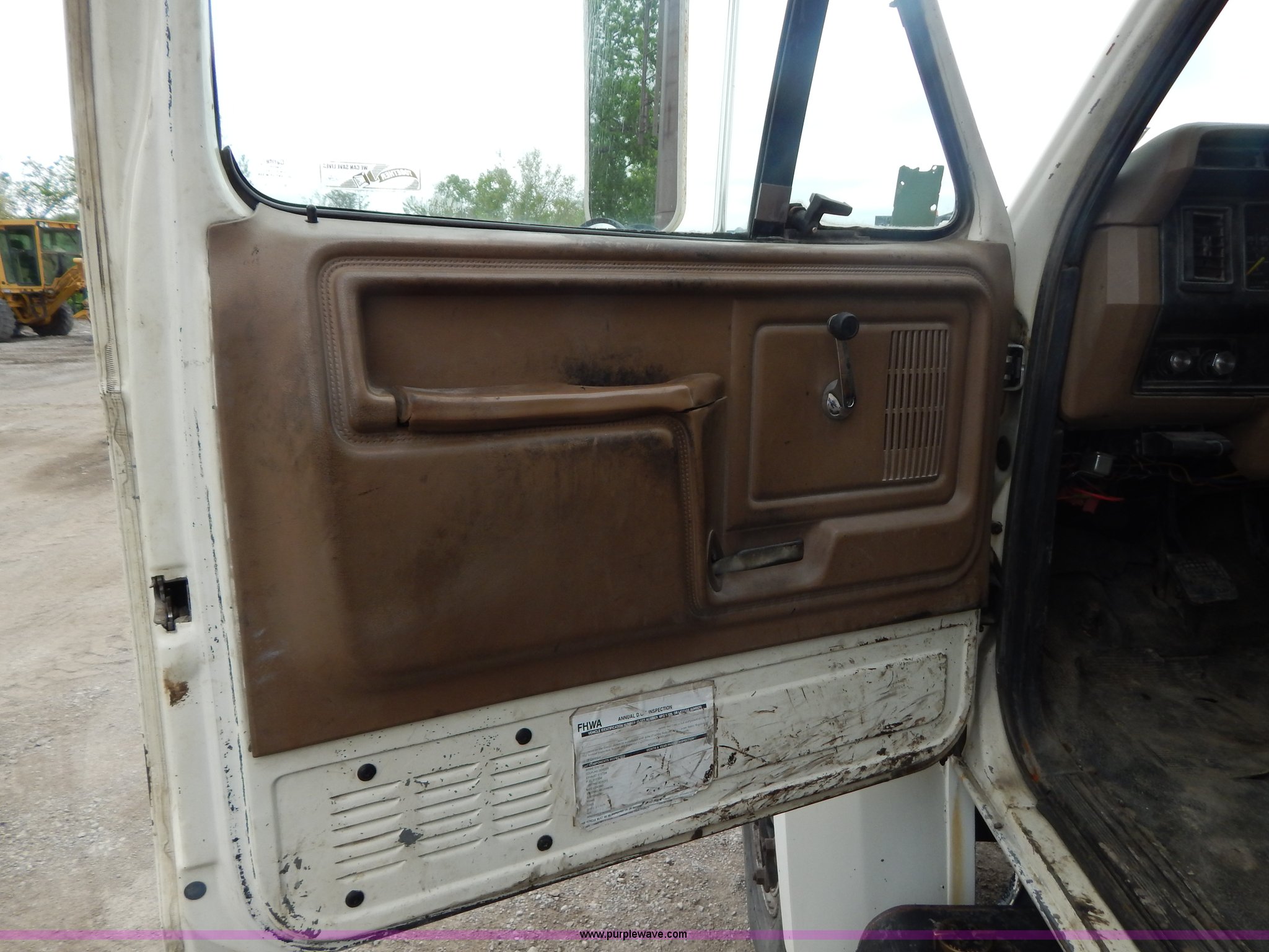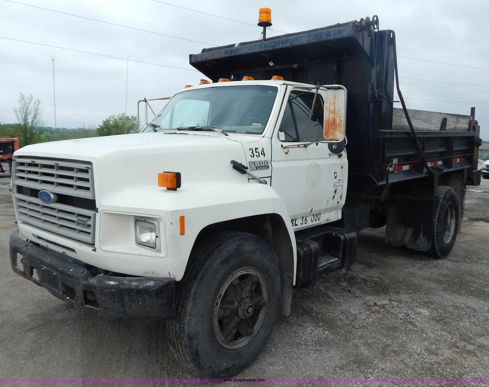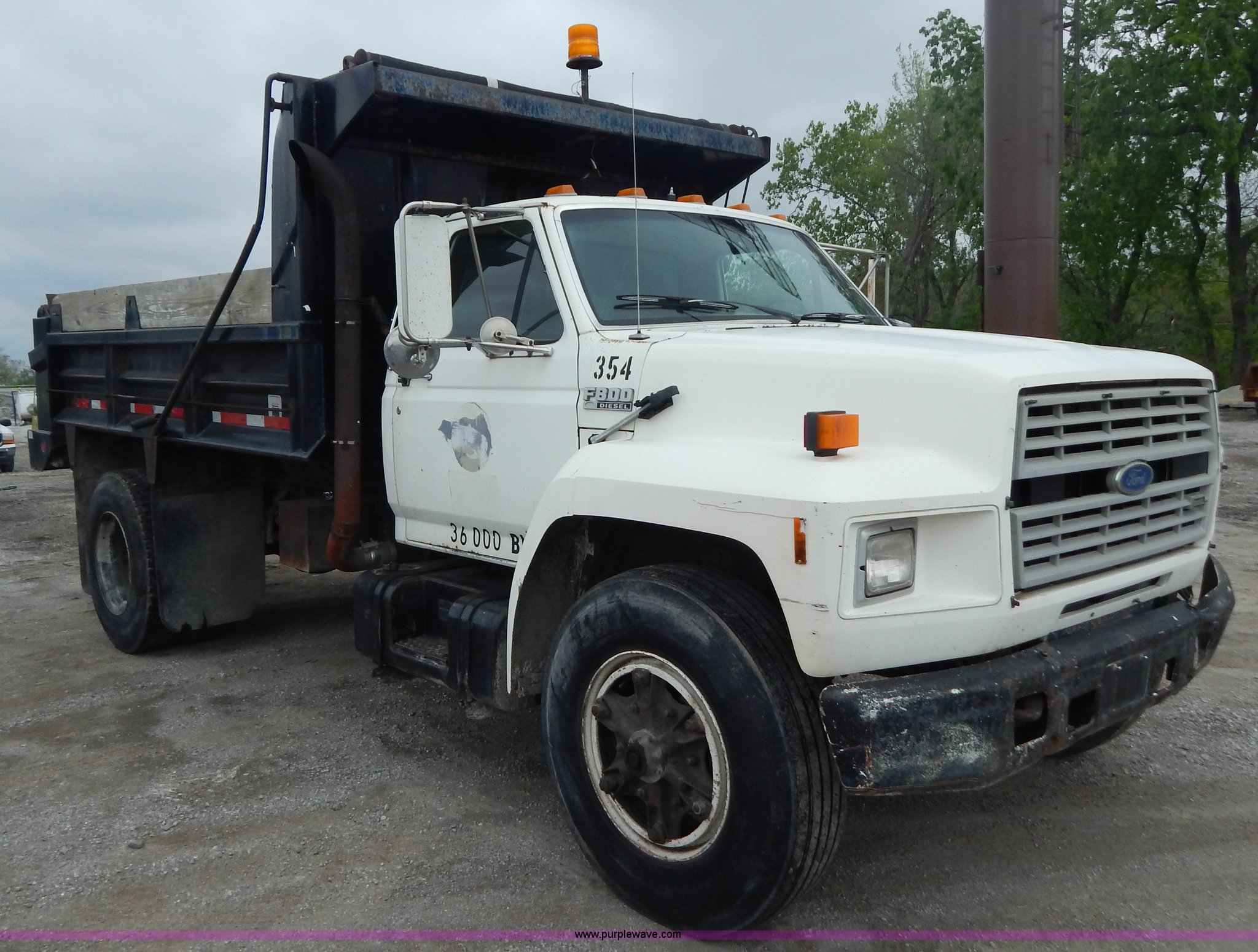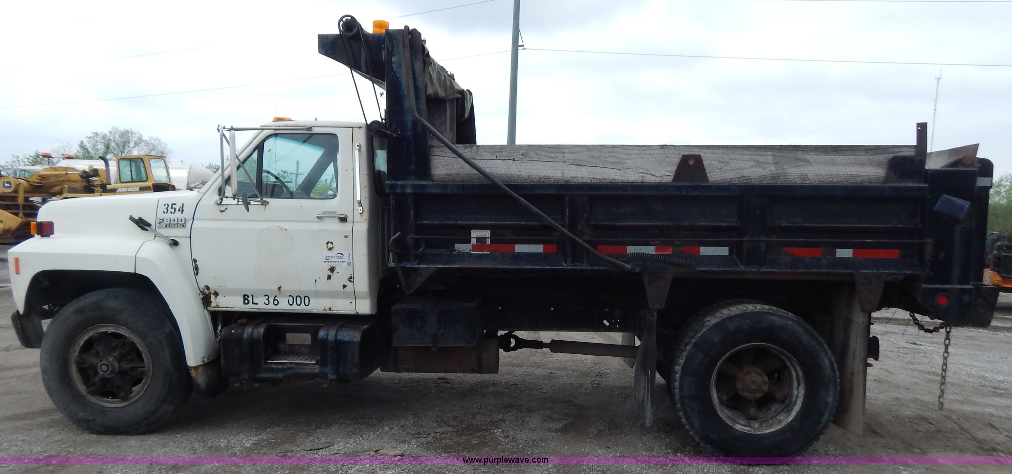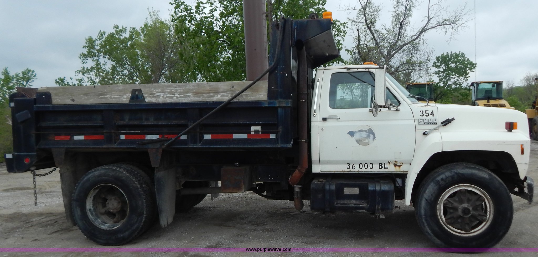 Purple Wave is selling a used Construction Dump Truck in Missouri. This item is a 1989 Ford F800 dump truck with the following: 212,768 miles on odometer, 7.8L L6 turbo diesel engine, Manual transmission, AM/FM, Electric brake controller, 12'L x 8'W dump bed, 3'H sides, PTO, 10.00R20 tires, Unit# 354