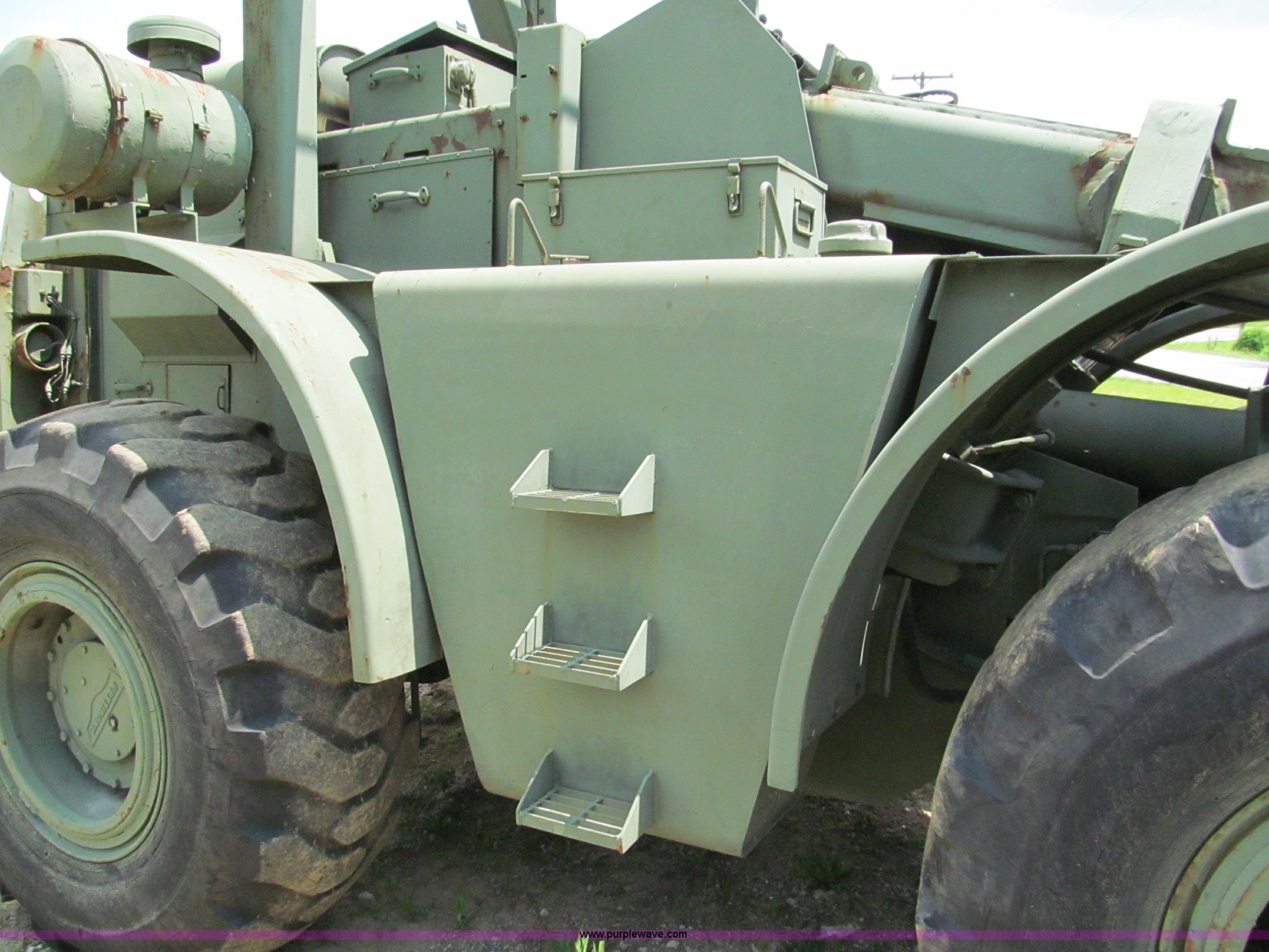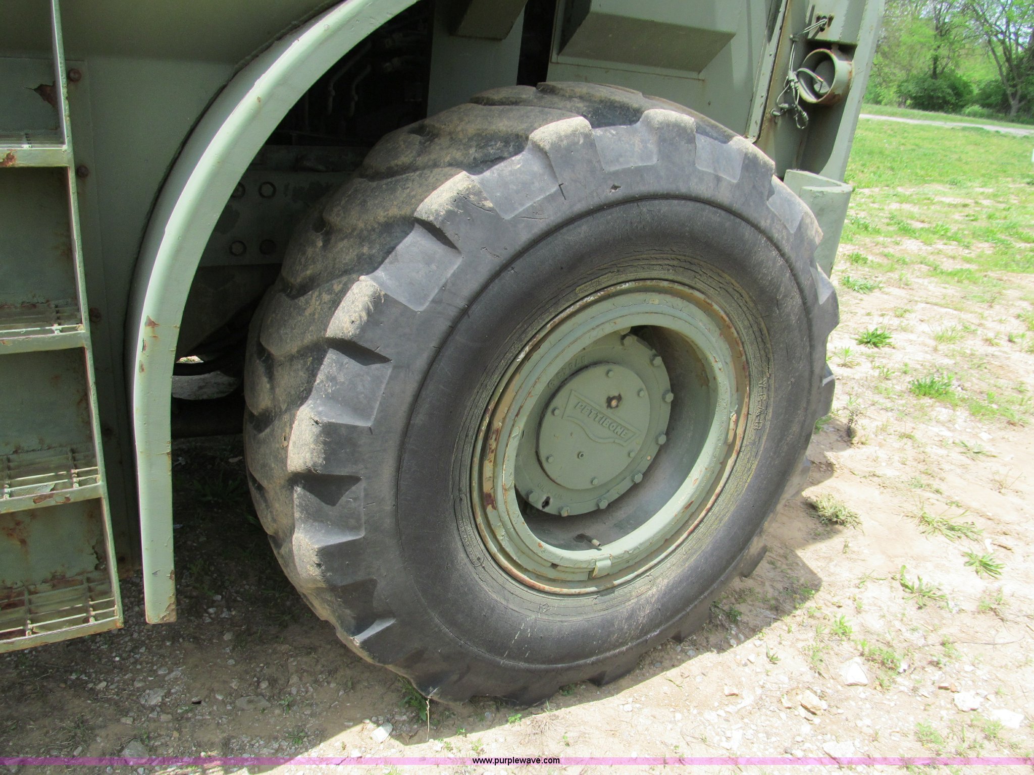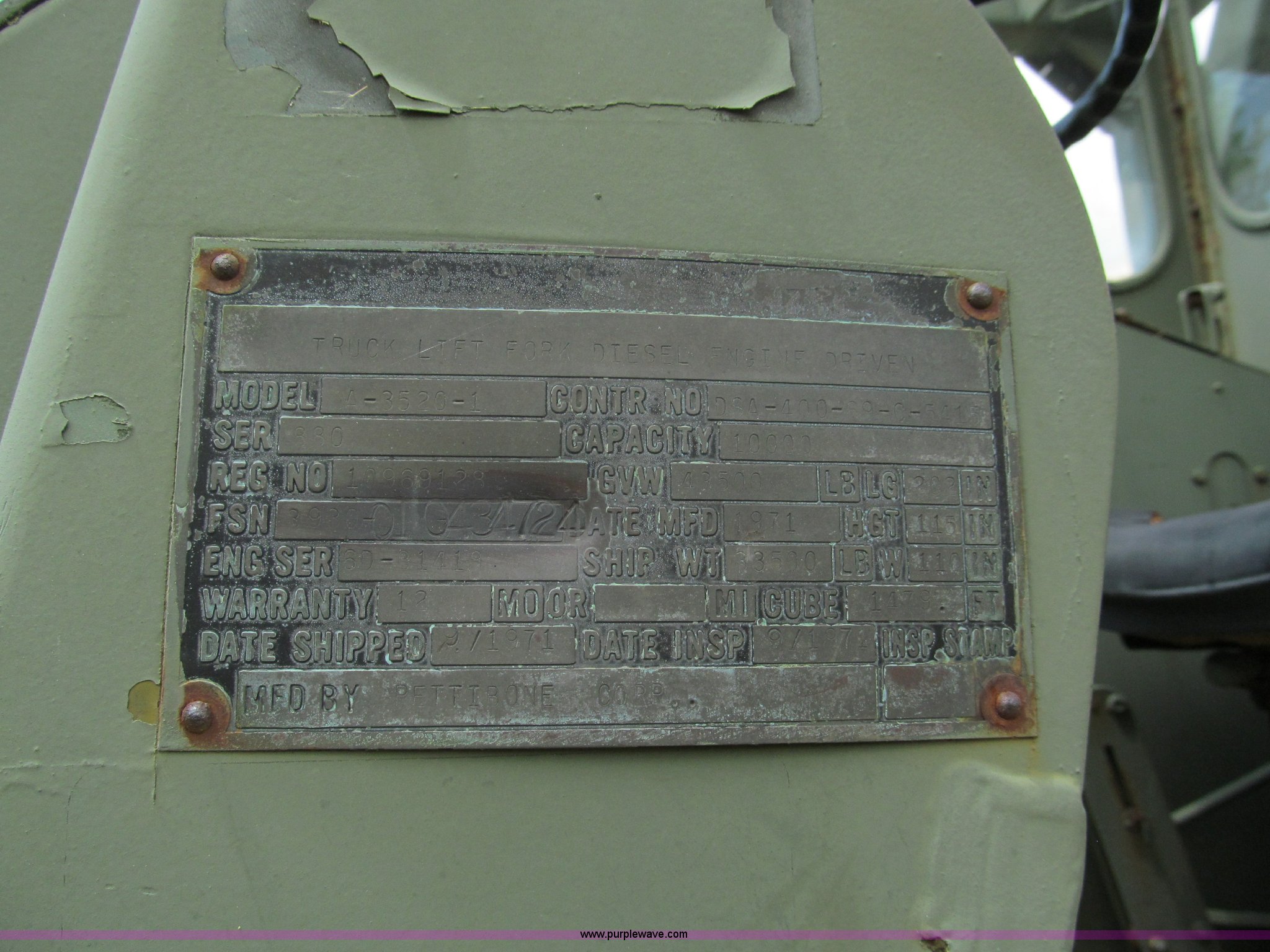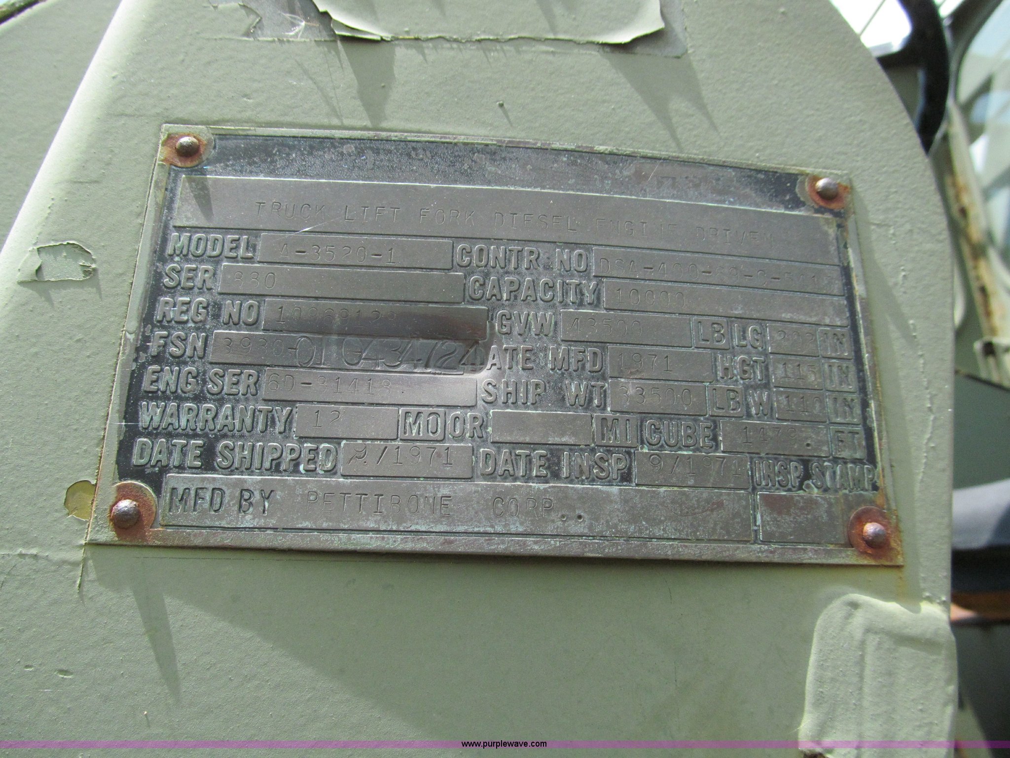 Purple Wave is selling a used Cushion Tire or Pneumatic Forklift in Missouri. This item is a Pettibone Rough Terrain military forklift with the following: 3,453 hours on meter, Model A3520-1, Detroit Diesel 671 engine, High, Mid, and low range transmission, Four wheel drive, ROPS, Three way steering, Tilt, 60"L x 8"W forks, 105" carriage, PowerFork slide, 110 gallon fuel tank, 38 gallon hydraulic oil tank, 20.5-25 tires, 33,500 lbs. base operating weight, GVWR 43,500 lbs, Serial 880