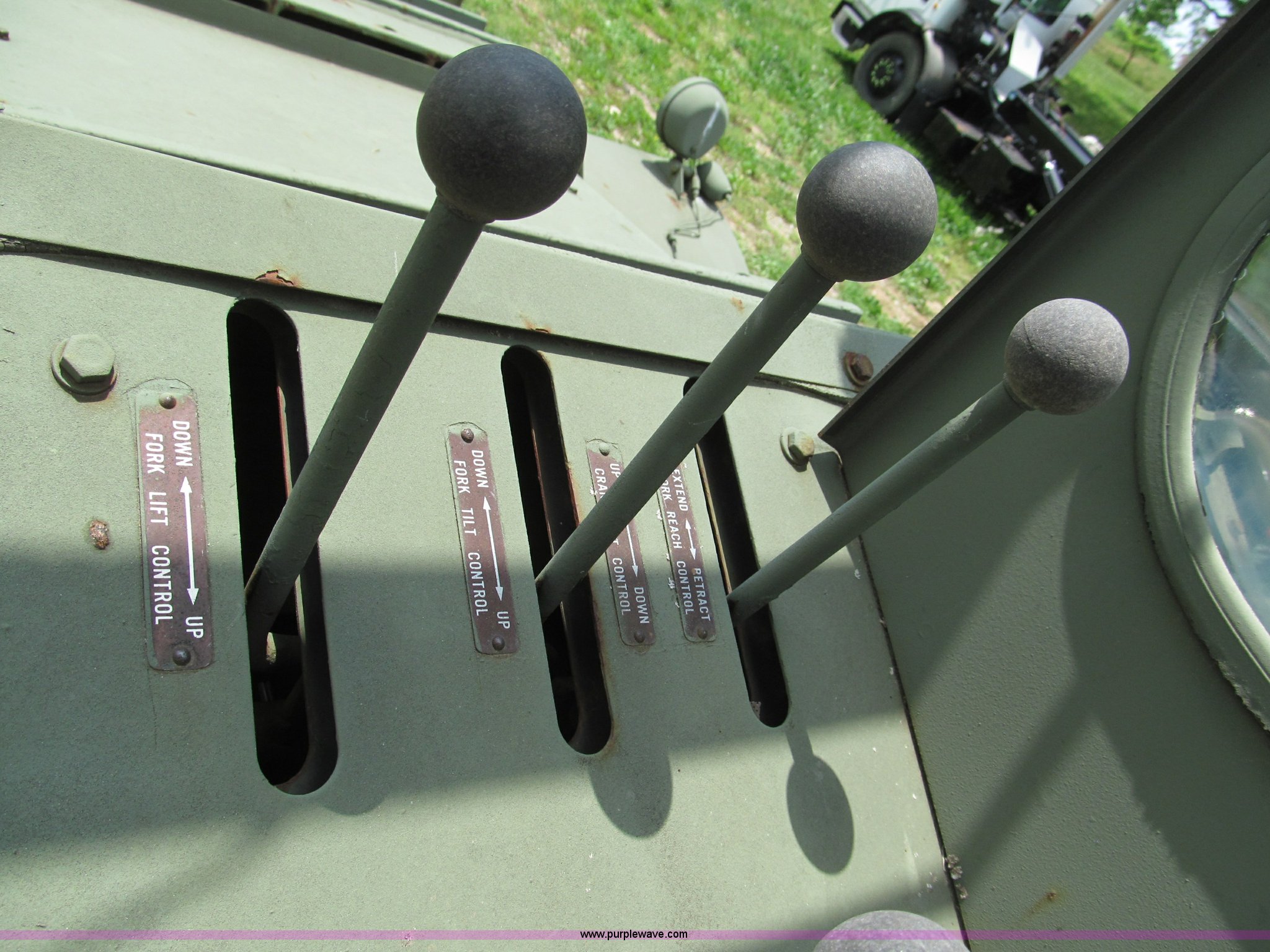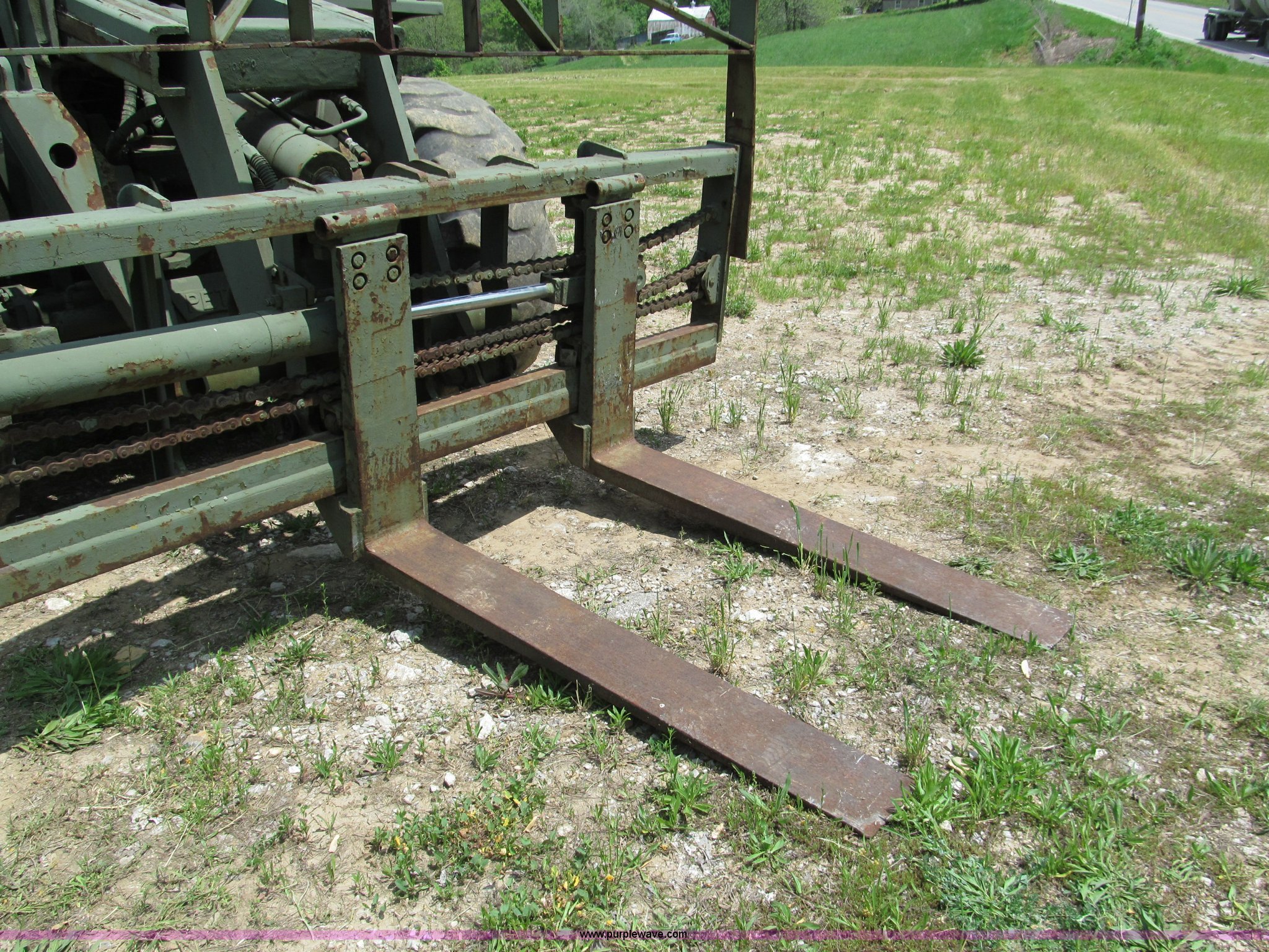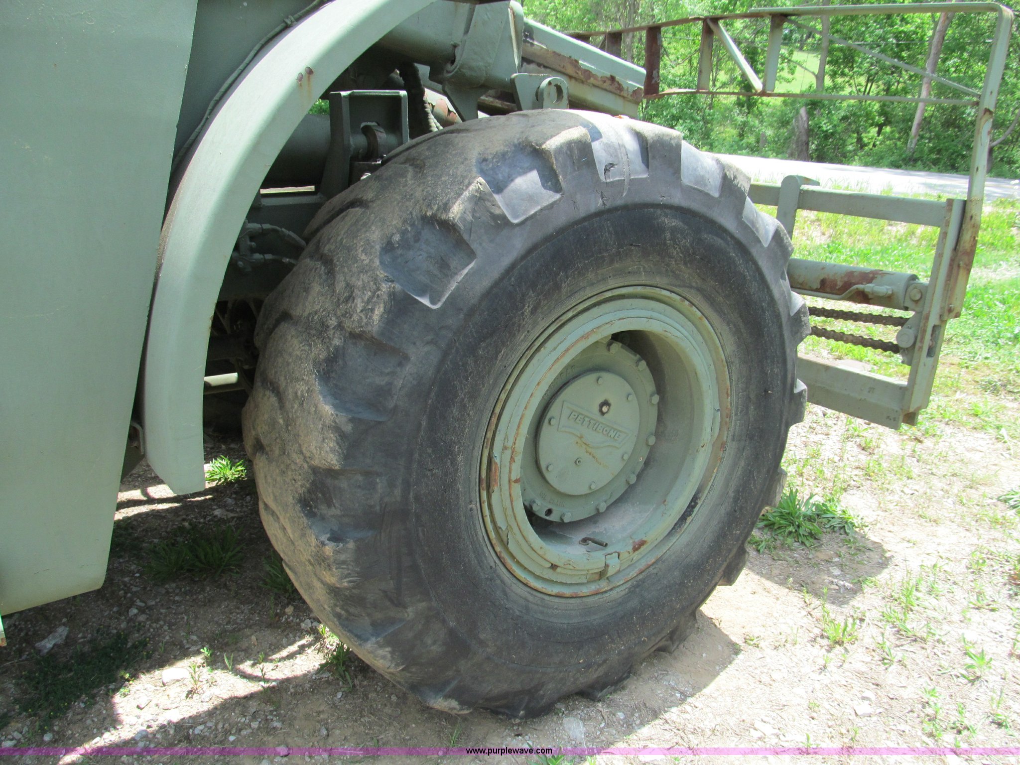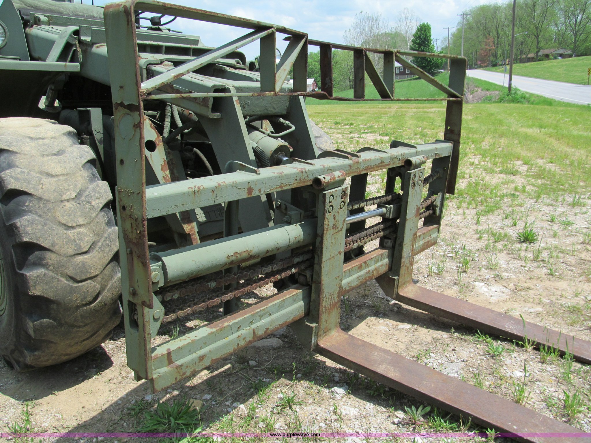 Purple Wave is selling a used Cushion Tire or Pneumatic Forklift in Missouri. This item is a Pettibone Rough Terrain military forklift with the following: 3,453 hours on meter, Model A3520-1, Detroit Diesel 671 engine, High, Mid, and low range transmission, Four wheel drive, ROPS, Three way steering, Tilt, 60"L x 8"W forks, 105" carriage, PowerFork slide, 110 gallon fuel tank, 38 gallon hydraulic oil tank, 20.5-25 tires, 33,500 lbs. base operating weight, GVWR 43,500 lbs, Serial 880
