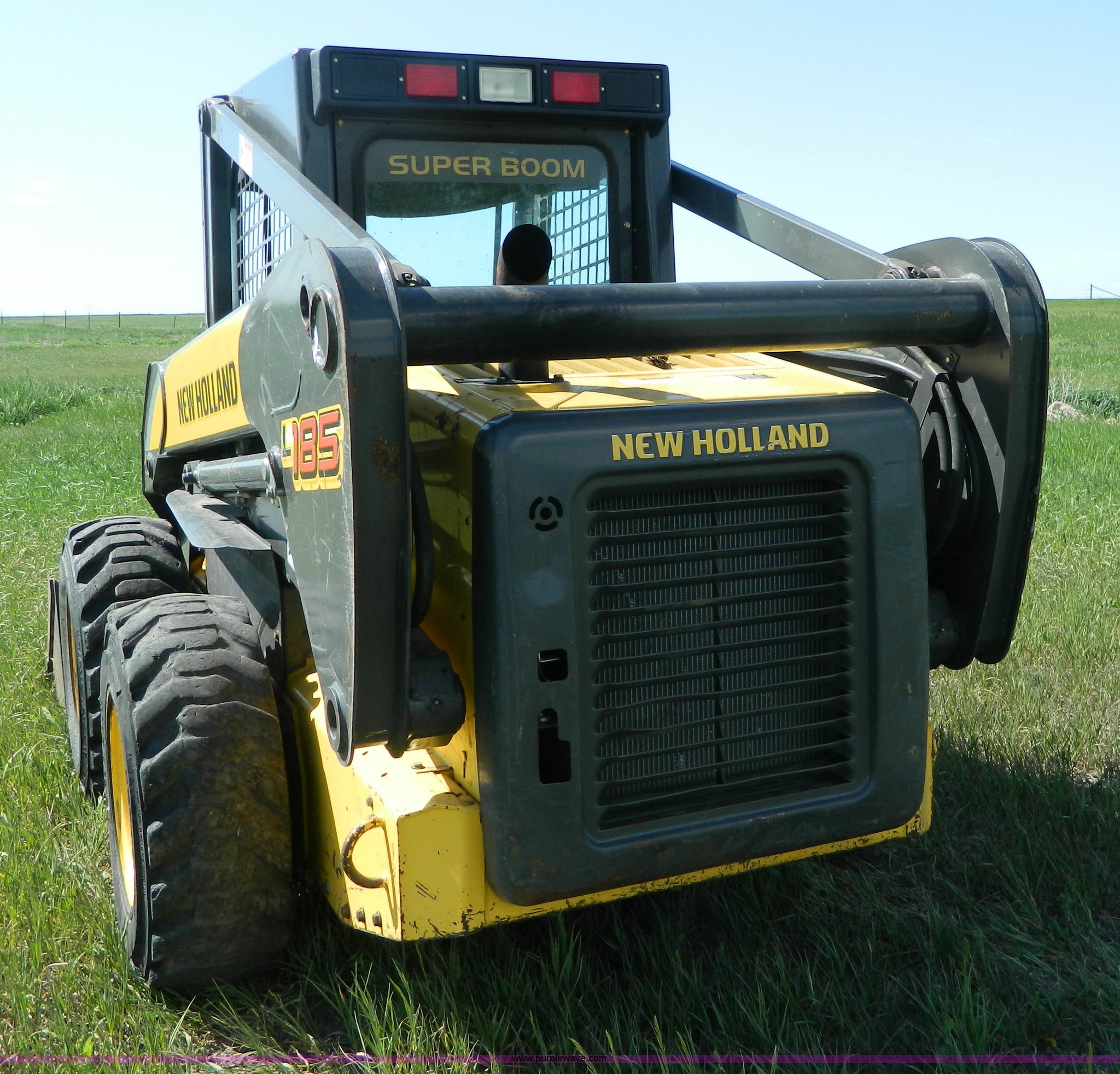Purple Wave is selling a used Skid Steer Loader in Kansas. This item is a 2007 New Holland L185 skid steer with the following: 958 hours on meter, Four cylinder turbo diesel engine, 78 HP, Hand and foot controls, Super Boom, Auxiliary hydraulics, 71" six tooth bucket, 12 x 16.5 tires, 2,500 lbs rated operating load, 7,098 lbs. base operating weight, Cab headliner loose, Serial N6M44644