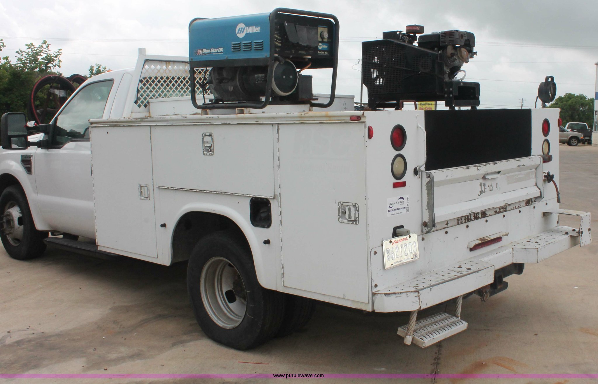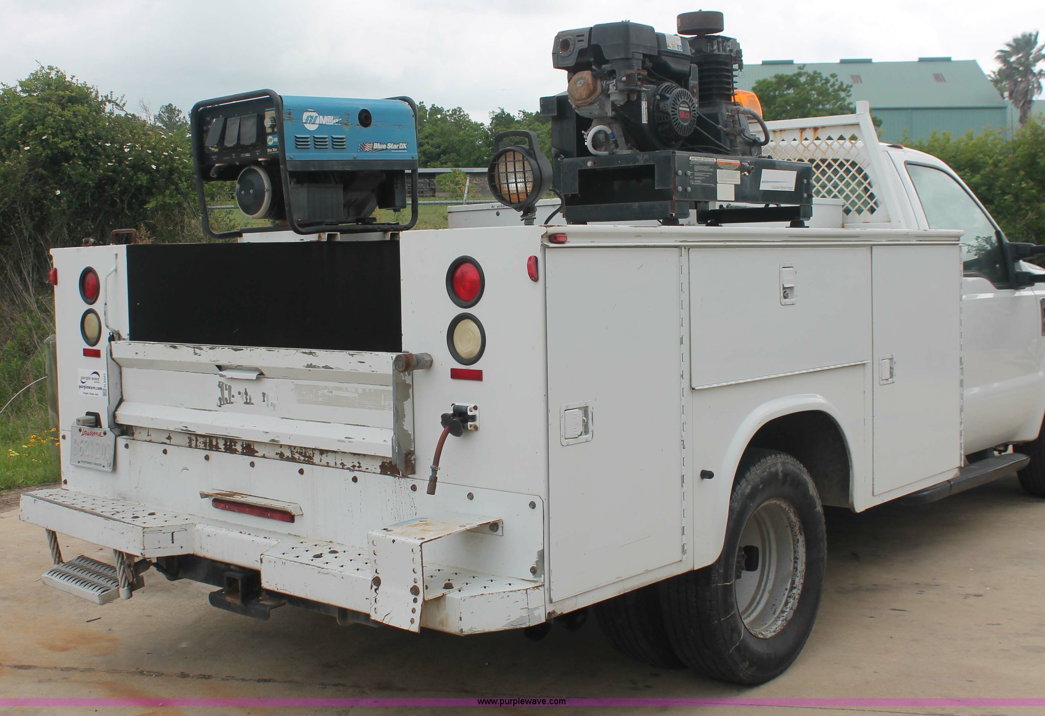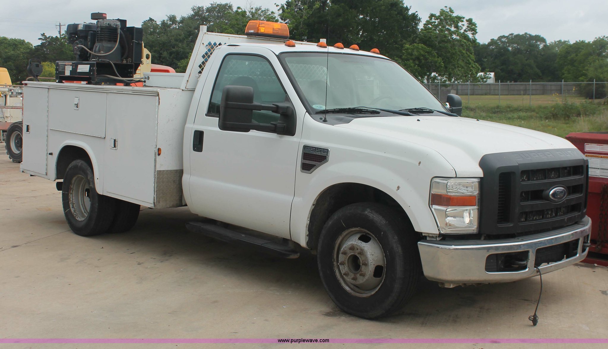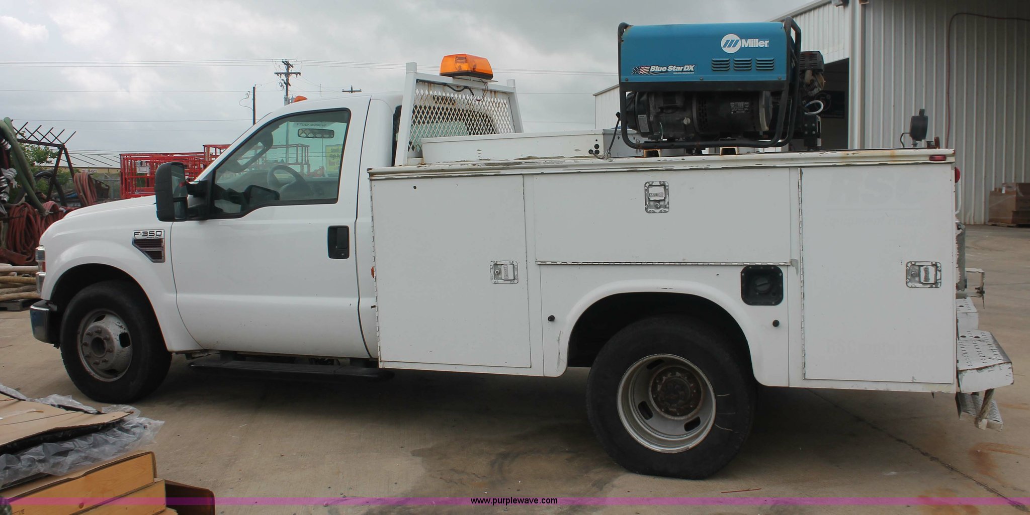 Purple Wave is selling a used Service Truck in Texas. This item is a 2008 Ford F350 XL Super Duty service truck with the following: 115,842 miles on odometer, 6.4L V8 OHV 32V turbo diesel engine, Engine is bad, Automatic transmission, AC and heat, Tilt, Cruise, AM/FM/CD, Manual windows and locks, Vinyl interior, Brake controller, Auxiliary control panel, Knapheide 9' service service, (6) storage compartments, American Eagle toolbox, Internal shelving, Spray-in bed liner, Miller Blue Star DX185 welder/generator, 3 hours on meter, Kohler Welder 12.75 HP gas engine, 6,000 watt, (4) 120V outlets, 240V outlet, CC/DC welder, Weld output control, Champion air compressor, Honda GX270 9.0 HP gas engine, Hose, Hose reel, Graco oil, lube, and recovery system, Motor, hydraulic, waste, and grease reservoirs, Graco Fire-Ball pumps, Reelcraft nozzle, hose, and reel assemblies,, Backup alarm, Amber beacon, Running boards, Receiver hitch, Trailer wiring, LT245/75R17 tires, Engine is bad, EIN 709519RA