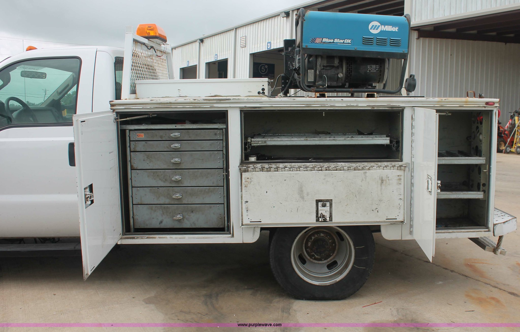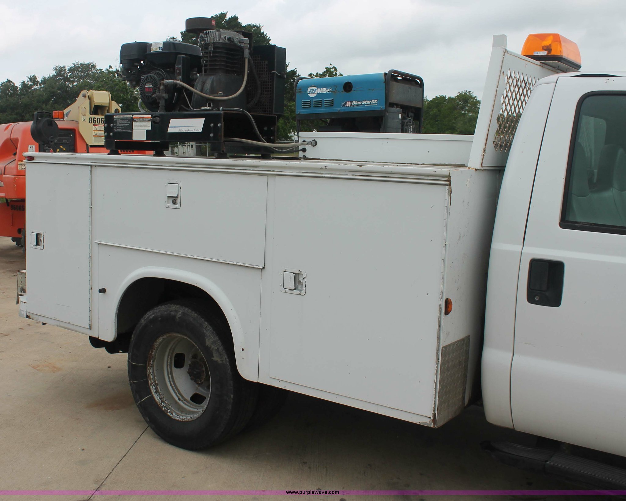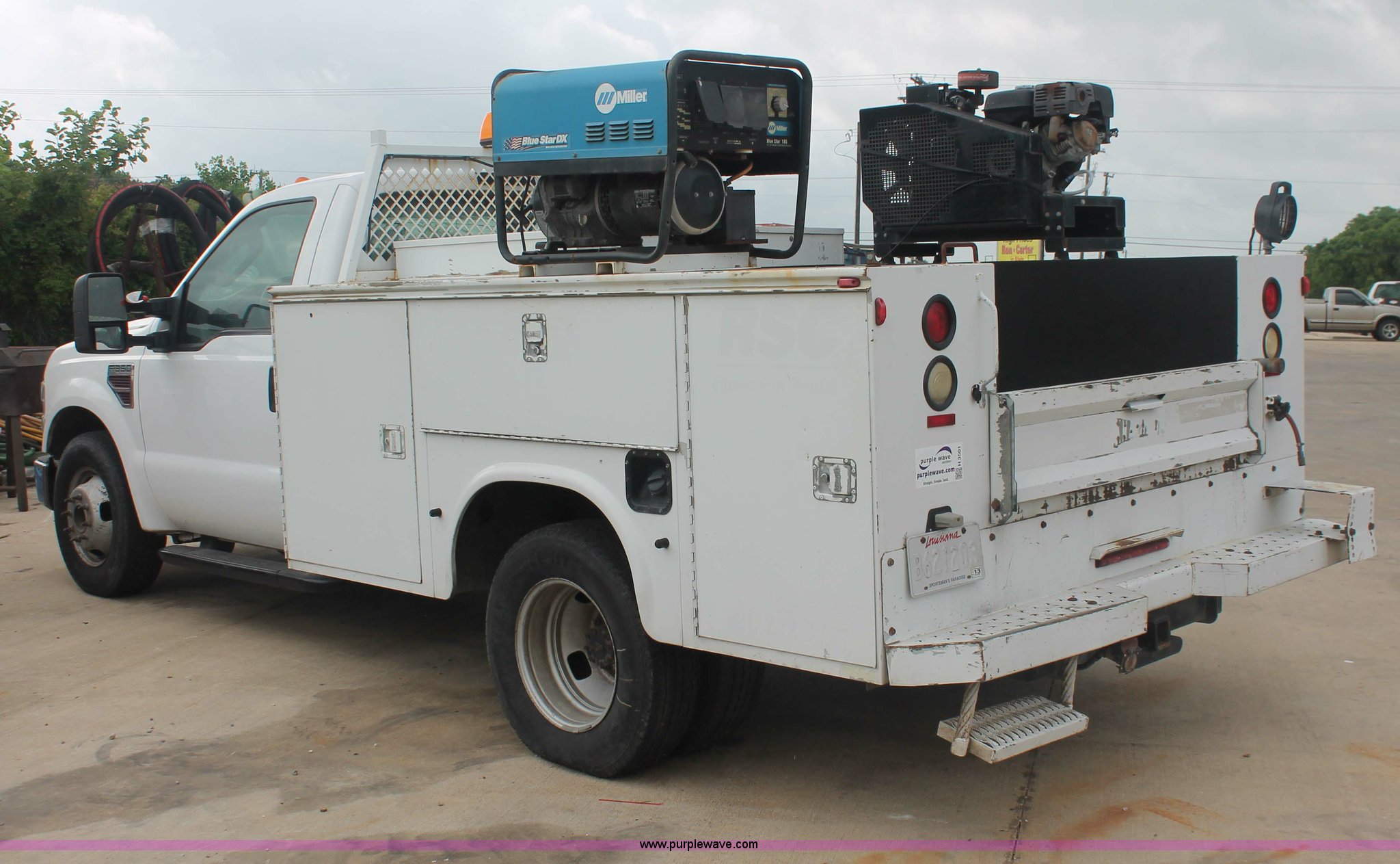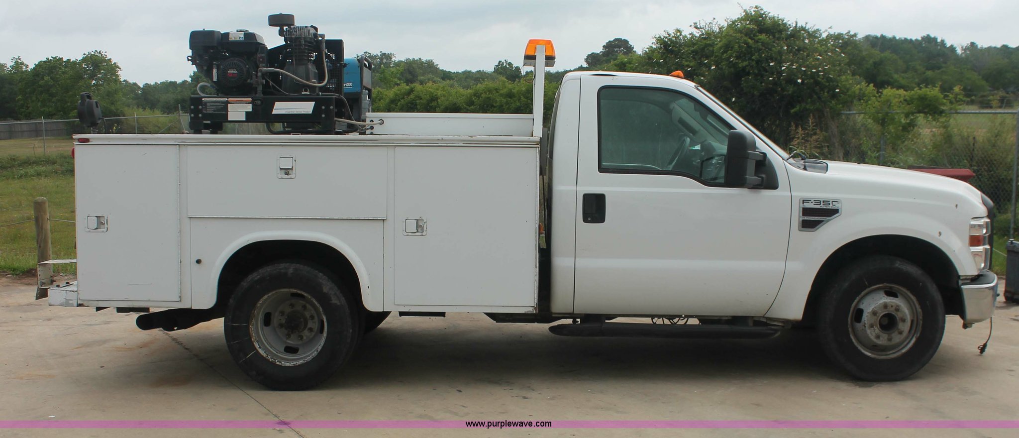 Purple Wave is selling a used Service Truck in Texas. This item is a 2008 Ford F350 XL Super Duty service truck with the following: 115,842 miles on odometer, 6.4L V8 OHV 32V turbo diesel engine, Engine is bad, Automatic transmission, AC and heat, Tilt, Cruise, AM/FM/CD, Manual windows and locks, Vinyl interior, Brake controller, Auxiliary control panel, Knapheide 9' service service, (6) storage compartments, American Eagle toolbox, Internal shelving, Spray-in bed liner, Miller Blue Star DX185 welder/generator, 3 hours on meter, Kohler Welder 12.75 HP gas engine, 6,000 watt, (4) 120V outlets, 240V outlet, CC/DC welder, Weld output control, Champion air compressor, Honda GX270 9.0 HP gas engine, Hose, Hose reel, Graco oil, lube, and recovery system, Motor, hydraulic, waste, and grease reservoirs, Graco Fire-Ball pumps, Reelcraft nozzle, hose, and reel assemblies,, Backup alarm, Amber beacon, Running boards, Receiver hitch, Trailer wiring, LT245/75R17 tires, Engine is bad, EIN 709519RA