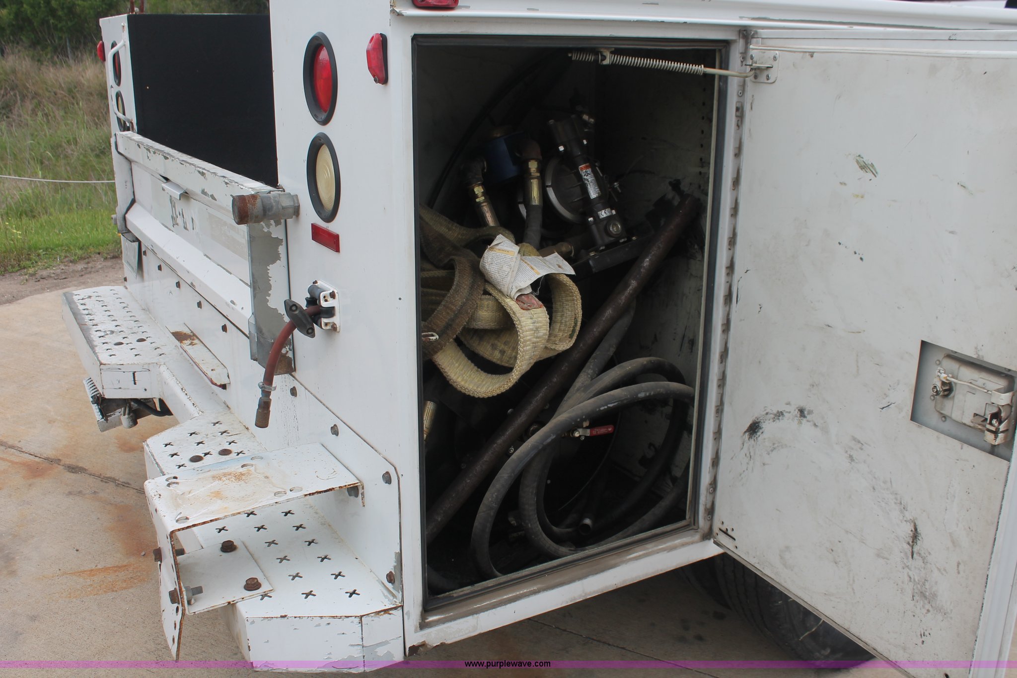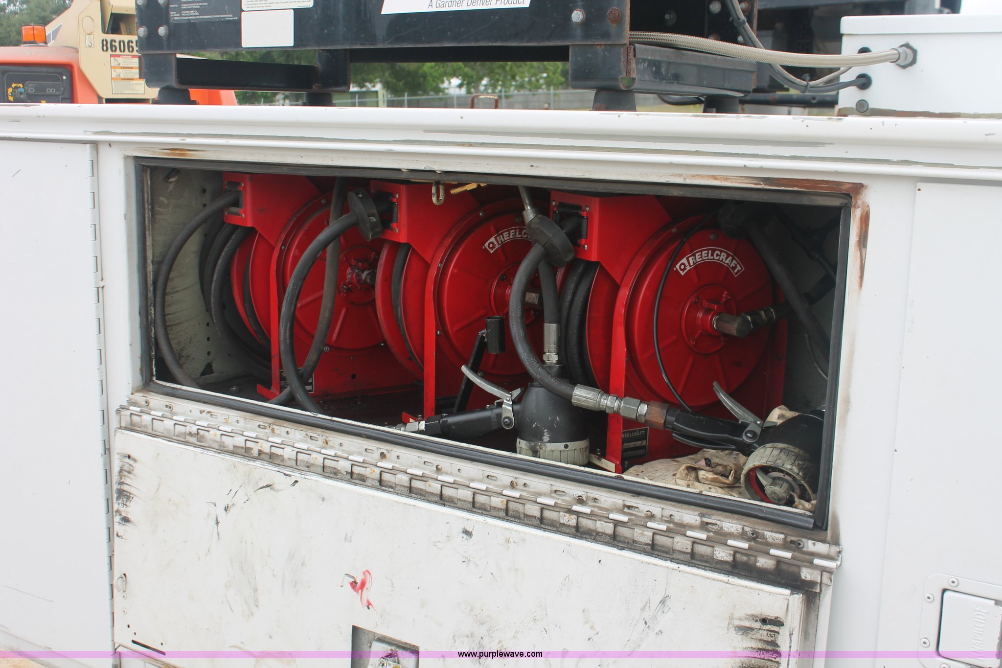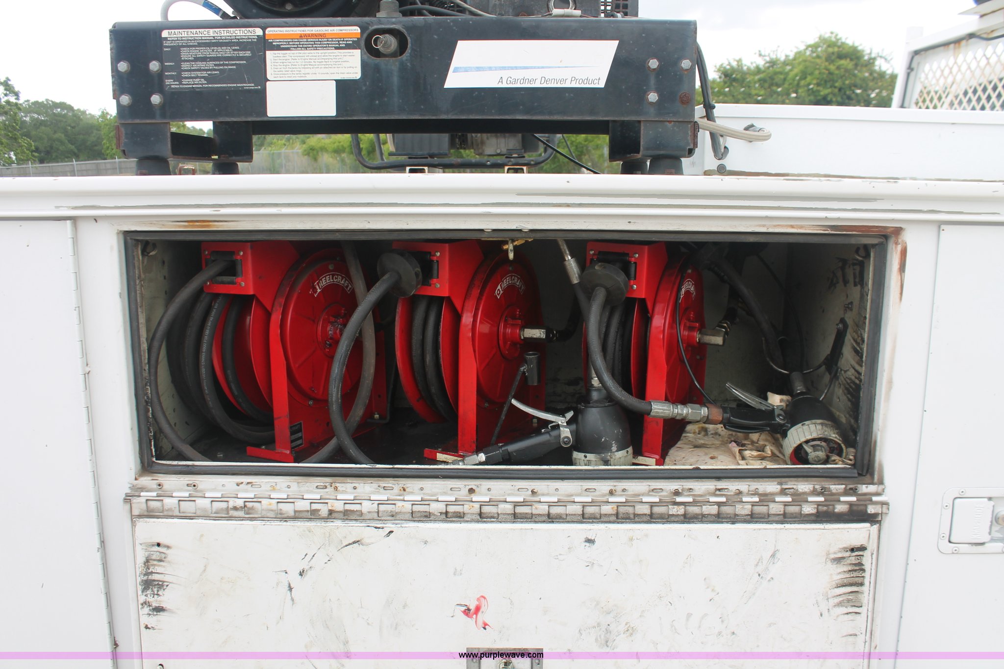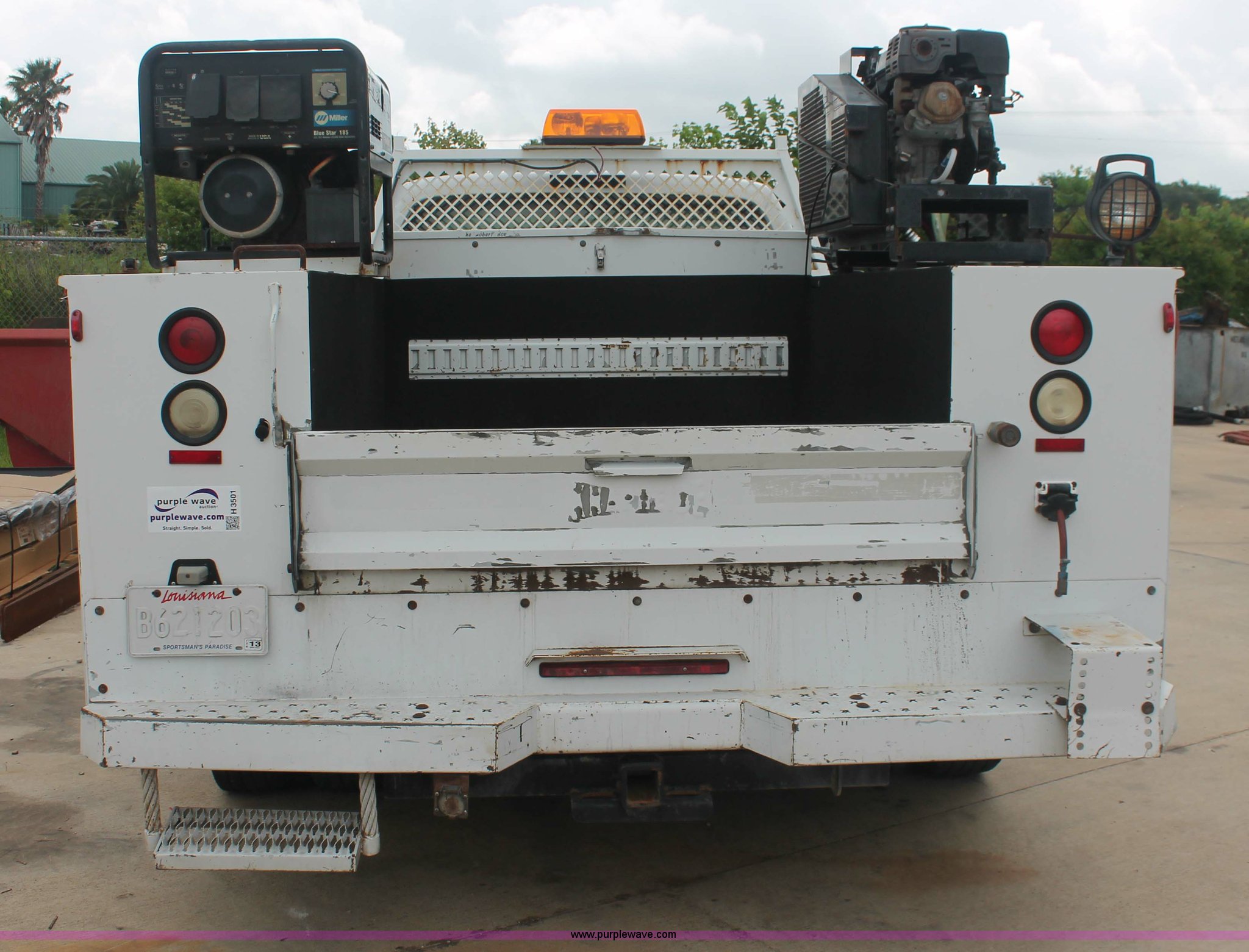 Purple Wave is selling a used Service Truck in Texas. This item is a 2008 Ford F350 XL Super Duty service truck with the following: 115,842 miles on odometer, 6.4L V8 OHV 32V turbo diesel engine, Engine is bad, Automatic transmission, AC and heat, Tilt, Cruise, AM/FM/CD, Manual windows and locks, Vinyl interior, Brake controller, Auxiliary control panel, Knapheide 9' service service, (6) storage compartments, American Eagle toolbox, Internal shelving, Spray-in bed liner, Miller Blue Star DX185 welder/generator, 3 hours on meter, Kohler Welder 12.75 HP gas engine, 6,000 watt, (4) 120V outlets, 240V outlet, CC/DC welder, Weld output control, Champion air compressor, Honda GX270 9.0 HP gas engine, Hose, Hose reel, Graco oil, lube, and recovery system, Motor, hydraulic, waste, and grease reservoirs, Graco Fire-Ball pumps, Reelcraft nozzle, hose, and reel assemblies,, Backup alarm, Amber beacon, Running boards, Receiver hitch, Trailer wiring, LT245/75R17 tires, Engine is bad, EIN 709519RA