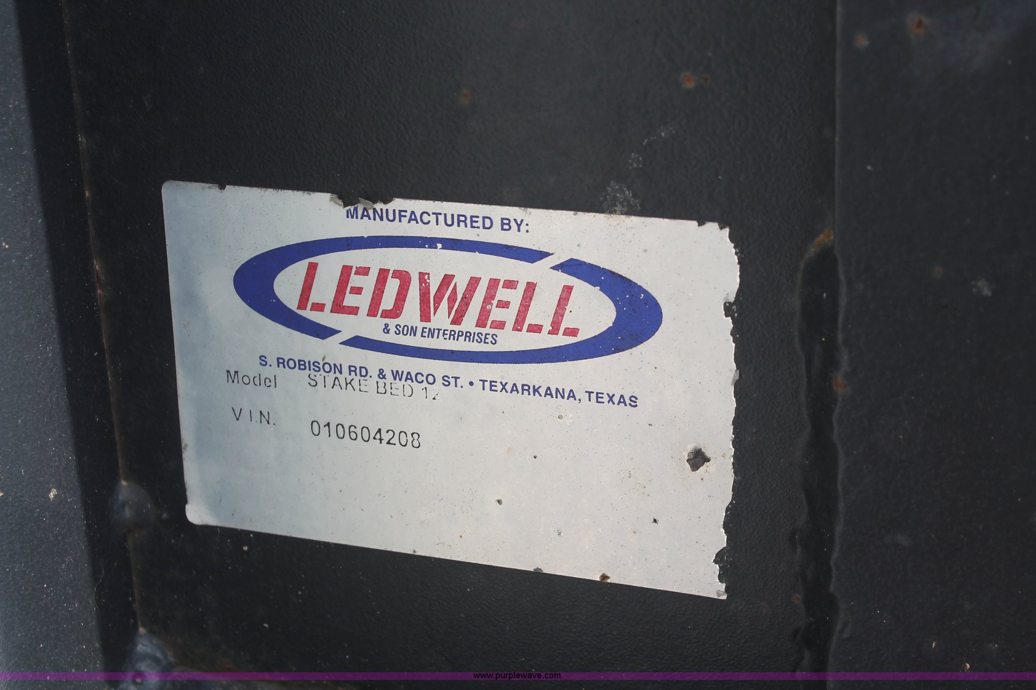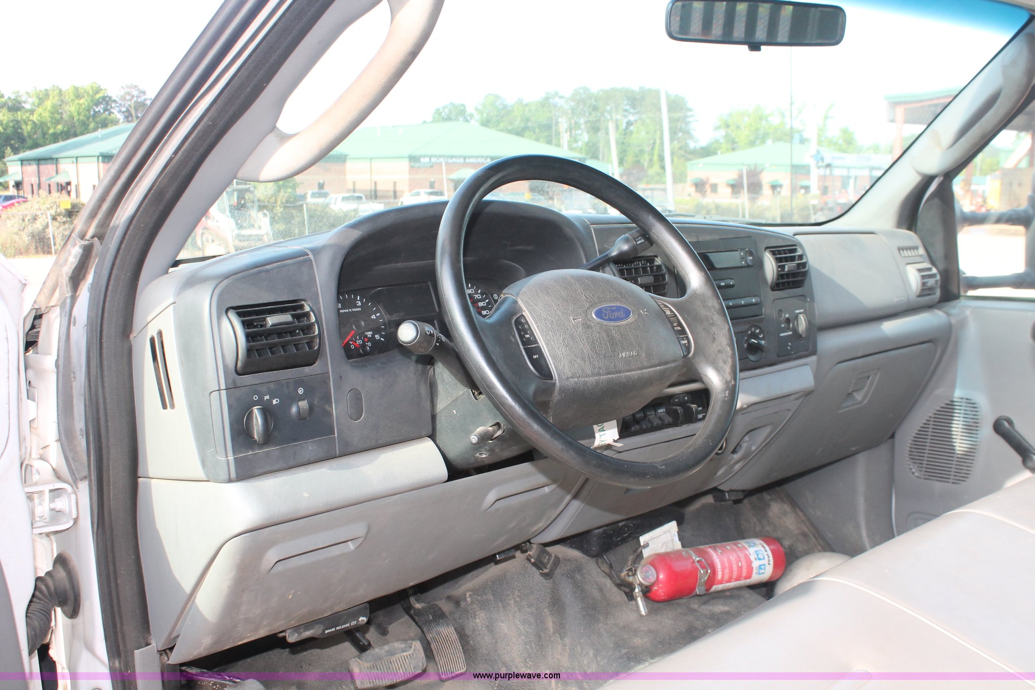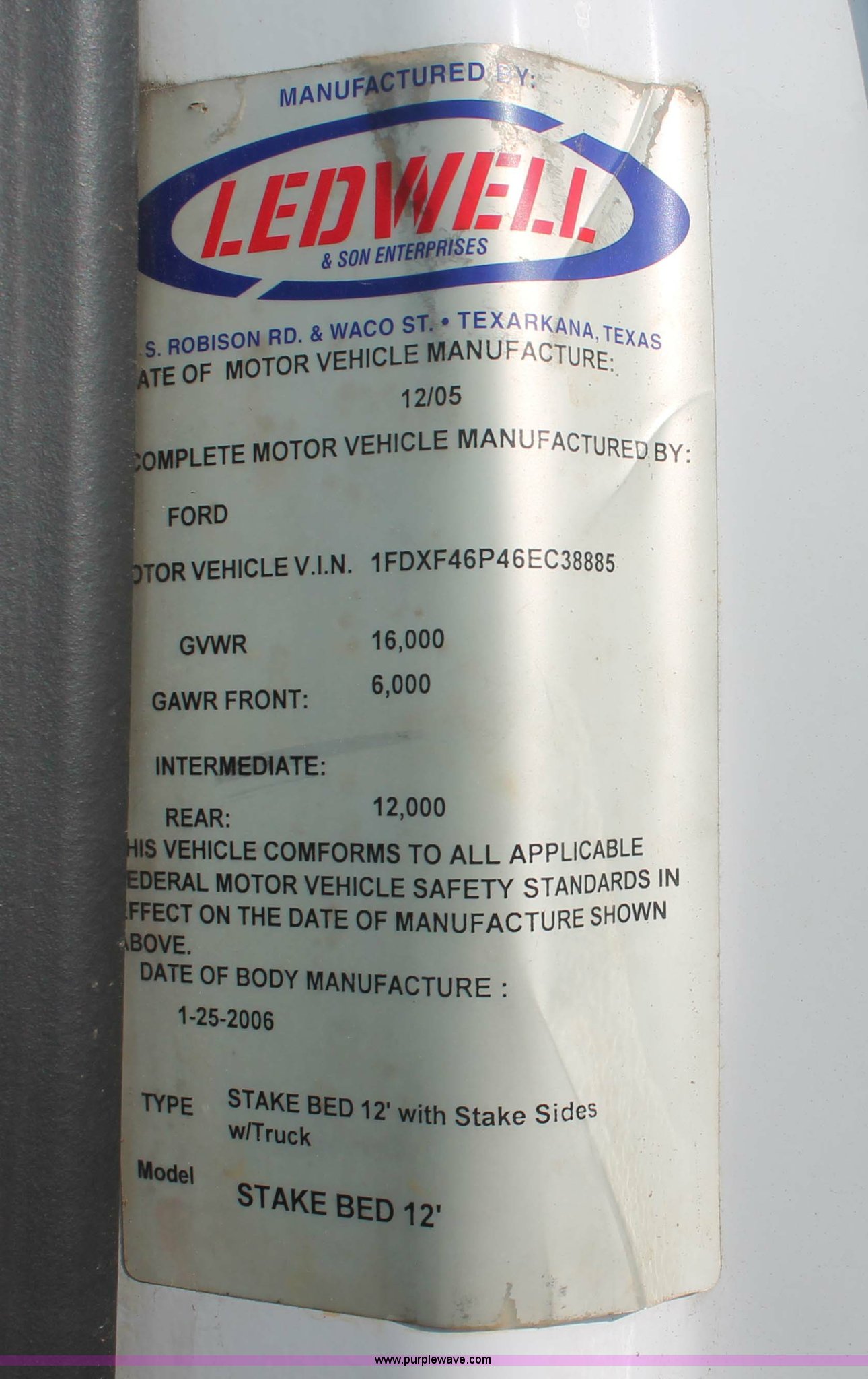 Purple Wave is selling a used Flat Bed Truck in Alabama. This item is a 2006 Ford F450 XL Super Duty stake bed truck with the following: 148,565 miles on odometer, 6.0L V8 diesel engine, Automatic transmission, AC and heat, Tilt, Cruise, AM/FM, Manual windows and locks, Vinyl interior, Brake controller, Auxiliary control panel, Ledwell 12' stake bed, (6) stake side panels, 48"L x 40"H, (6) recessed D-ring tie downs, All steel design, Diamond plate deck, Toolbox, Serial 010604208, Tommy gate hydraulic lift, 84"W x 36"D deck, 1,600 lbs capacity, Serial 00409472M, Amber warning beacon, Receiver hitch, 2" ball, Trailer wiring, 225/70R19.5 tires, EIN 611812RA