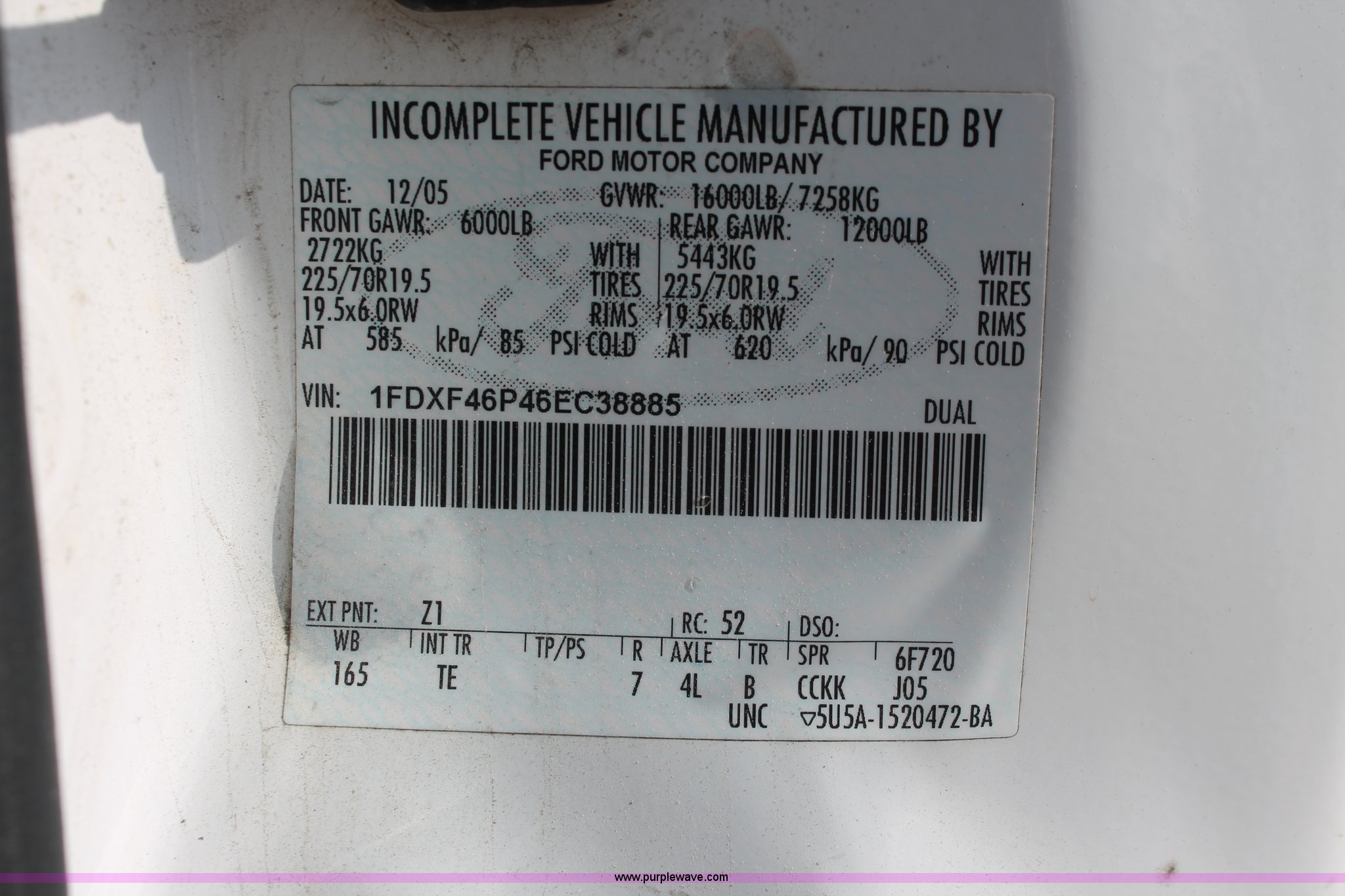 2006 Ford F450 XL Super Duty stake bed truck. 148,565 miles on odometer, 6.0L V8 diesel engine, Automatic transmission, AC and heat, Tilt, Cruise, AM/FM, Manual windows and locks, Vinyl interior, Brake controller, Auxiliary control panel, Ledwell 12' stake bed (6) stake side panels 48"L x 40"H, (6) recessed D-ring tie downs, All steel design, Diamond plate deck, Toolbox, Serial 010604208, Tommy gate hydraulic lift 84"W x 36"D deck, 1,600 lbs capacity, Serial 00409472M, Amber warning beacon, Receiver hitch, 2" ball, Trailer wiring, 225/70R19.5 tires, EIN 611812RA. Title distribution may be delayed up to 30 days from verification of funds. 1FDXF46P46EC38885. Shipping quotes available. United Rentals - Bessemer. 6298 Park South Drive. Bessemer, AL 35022