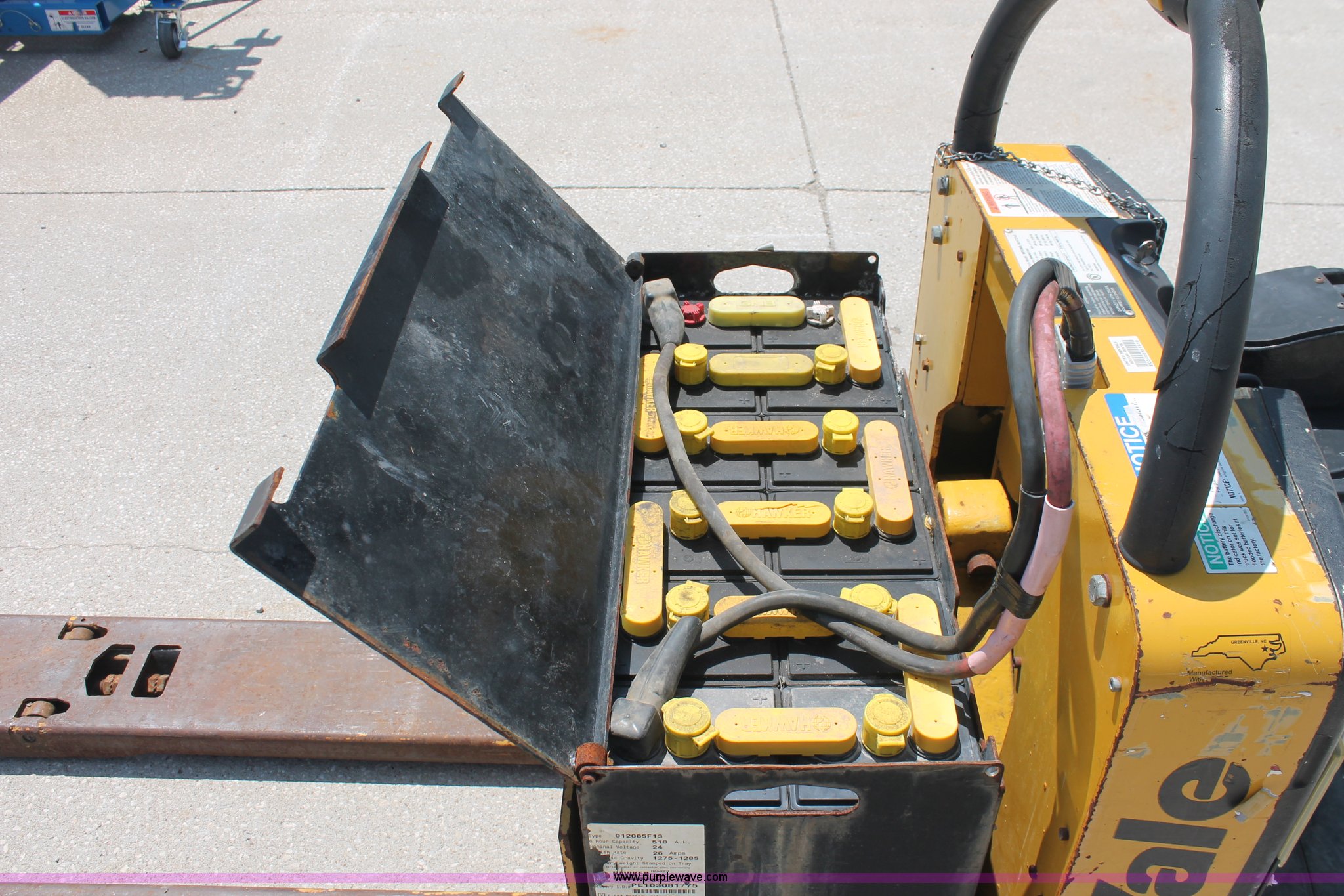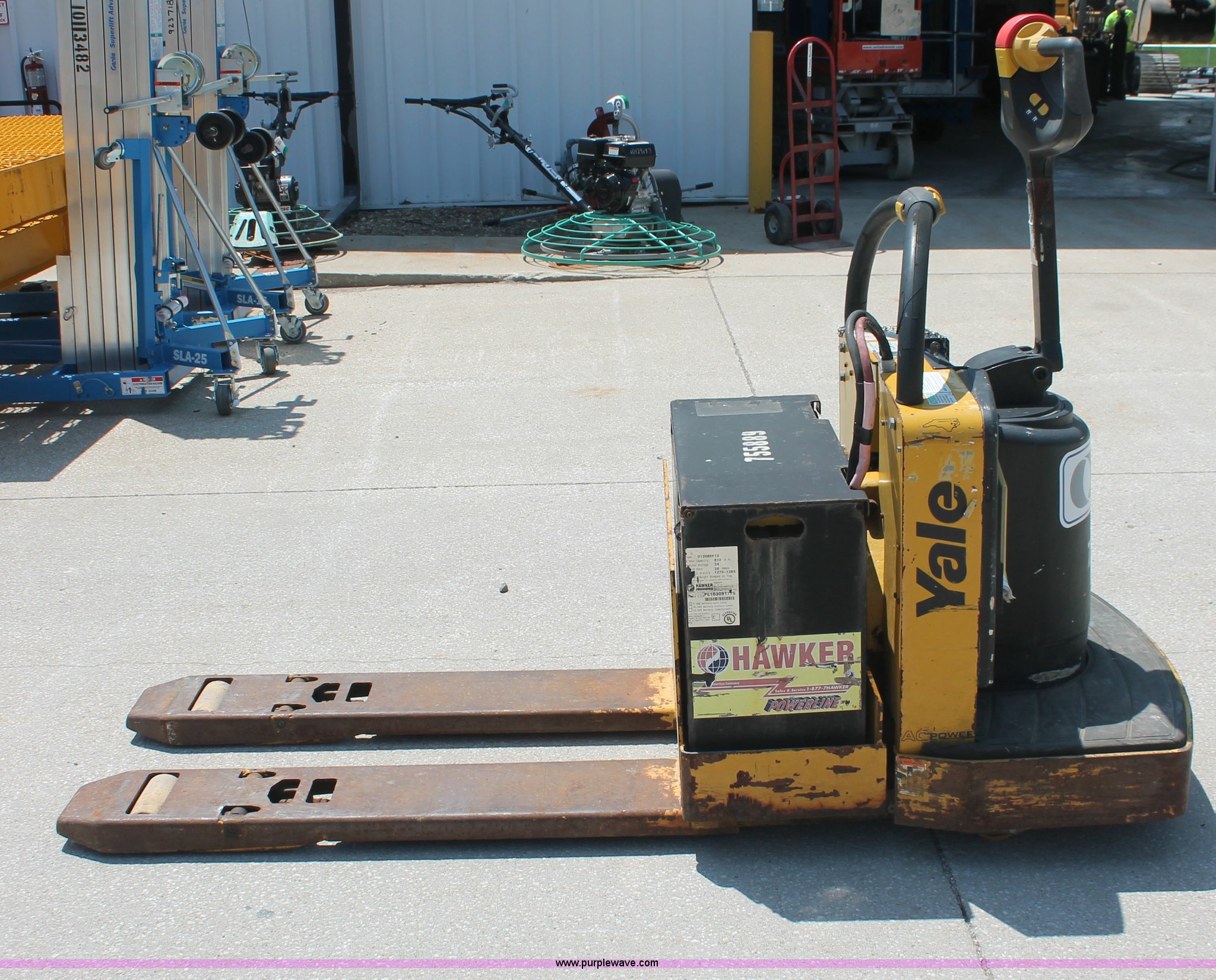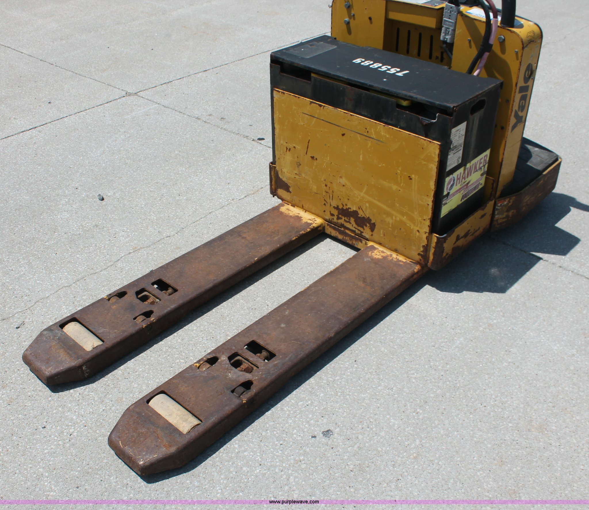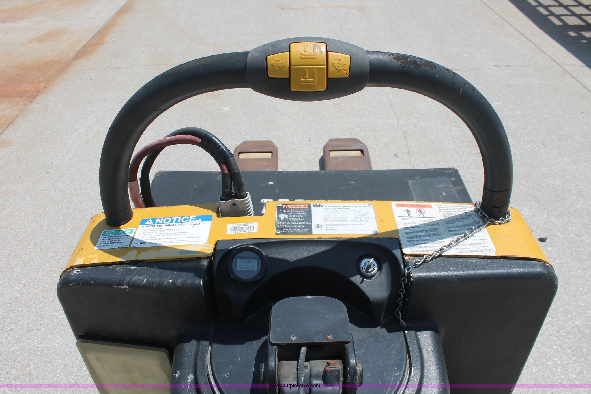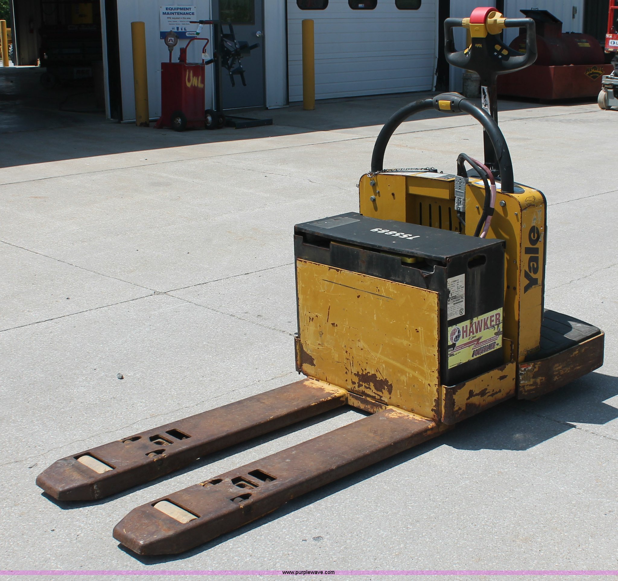 Purple Wave is selling a used Tools in Missouri. This item is a 2008 Yale MPE-060 electric pallet jack with the following: 1,157 hours on meter, 24V, 6,000 lb capacity, 48" x 9" forks, Six hour battery life, Manual included, Serial B896N03165F, EIN 755889RA
