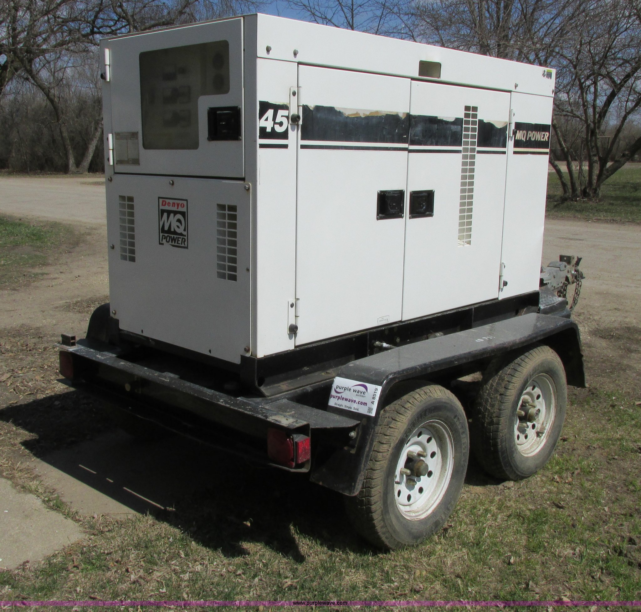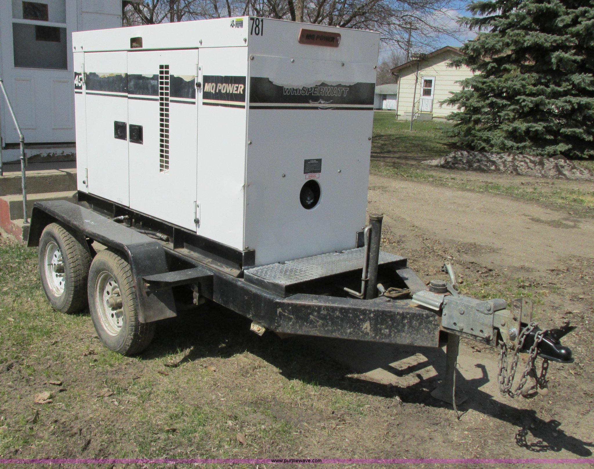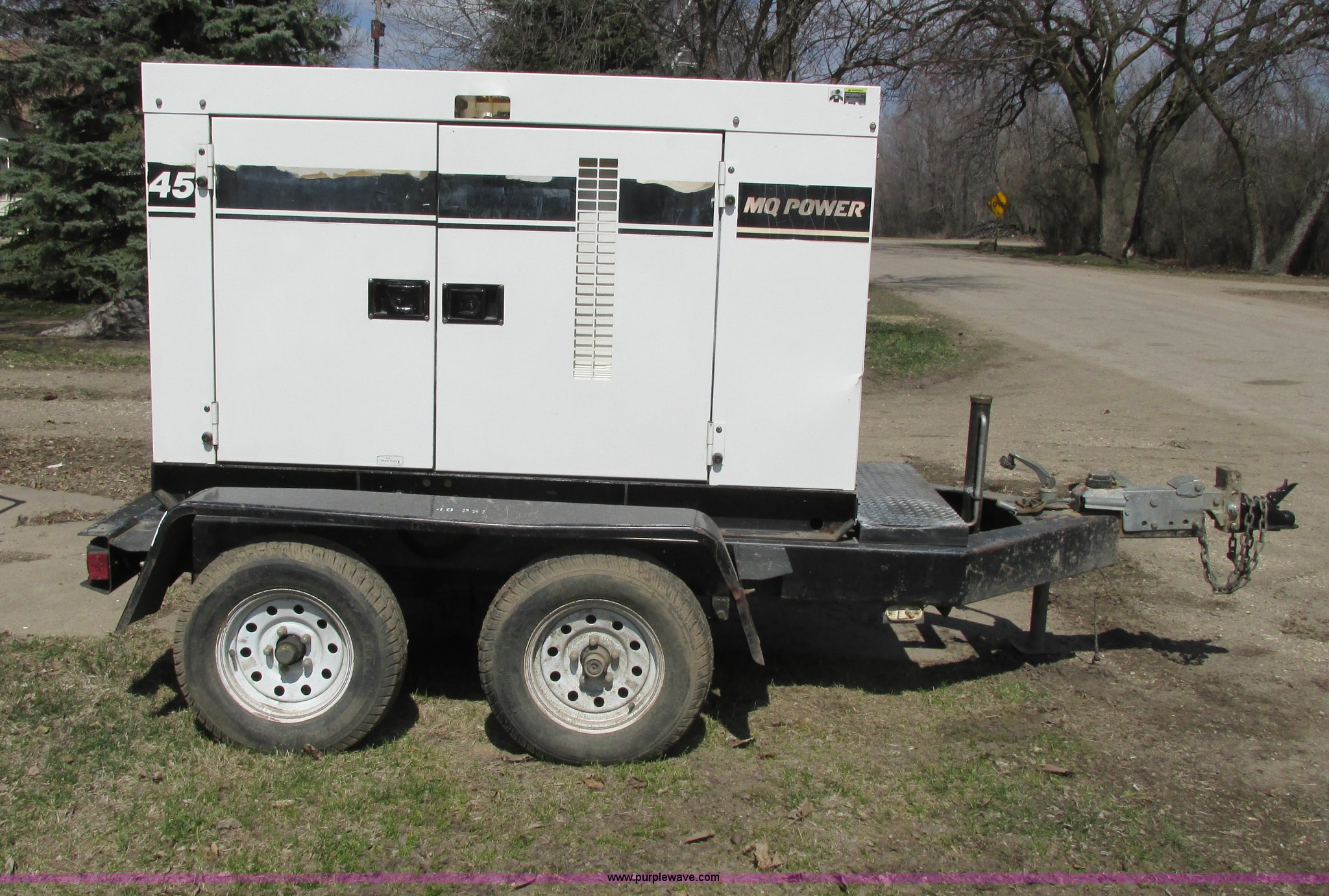Purple Wave is selling a used Generator Set in Minnesota. This item is a MQ Whisperwatt generator with the following: Model DCA45551U11, 13,148 hours on meter, 45 kVA three phase output, 26 kVA single phase output, Isuzu B48G1 diesel engine, 55 HP, Tandem axle trailer, 6,000 lb capacity, 2" hitch, ST175/80D13 tires, Serial 7200680