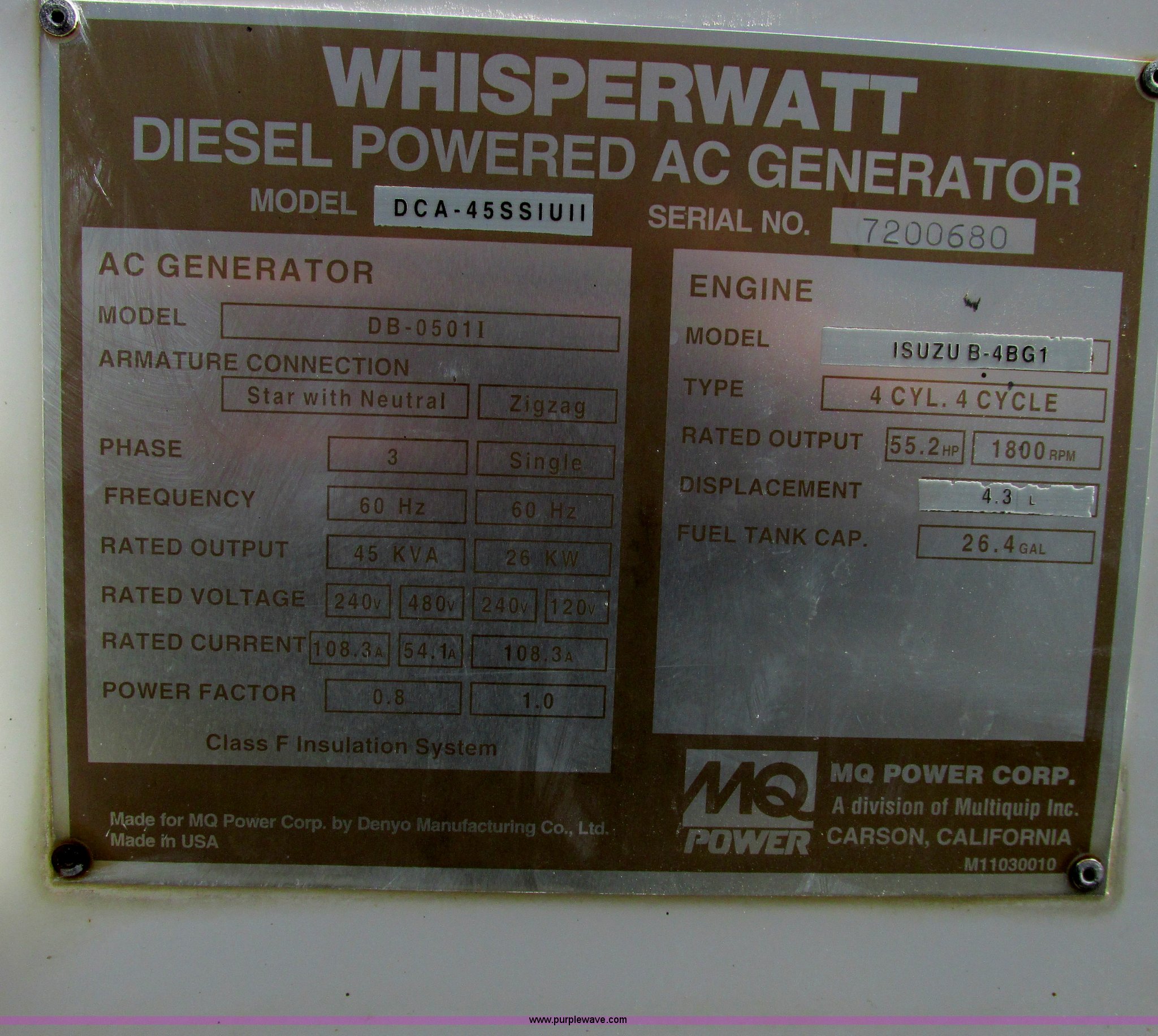 MQ Whisperwatt generator. Model DCA45551U11, 13,148 hours on meter, 45 kVA three phase output, 26 kVA single phase output, Isuzu B48G1 diesel engine 55 HP, Tandem axle trailer 6,000 lb capacity, 2" hitch, ST175/80D13 tires, Serial 7200680. View equipment video. Shipping quotes available. Serocki Excavating, Inc.. 5194 Hwy 27. Browns Valley, MN 56219
