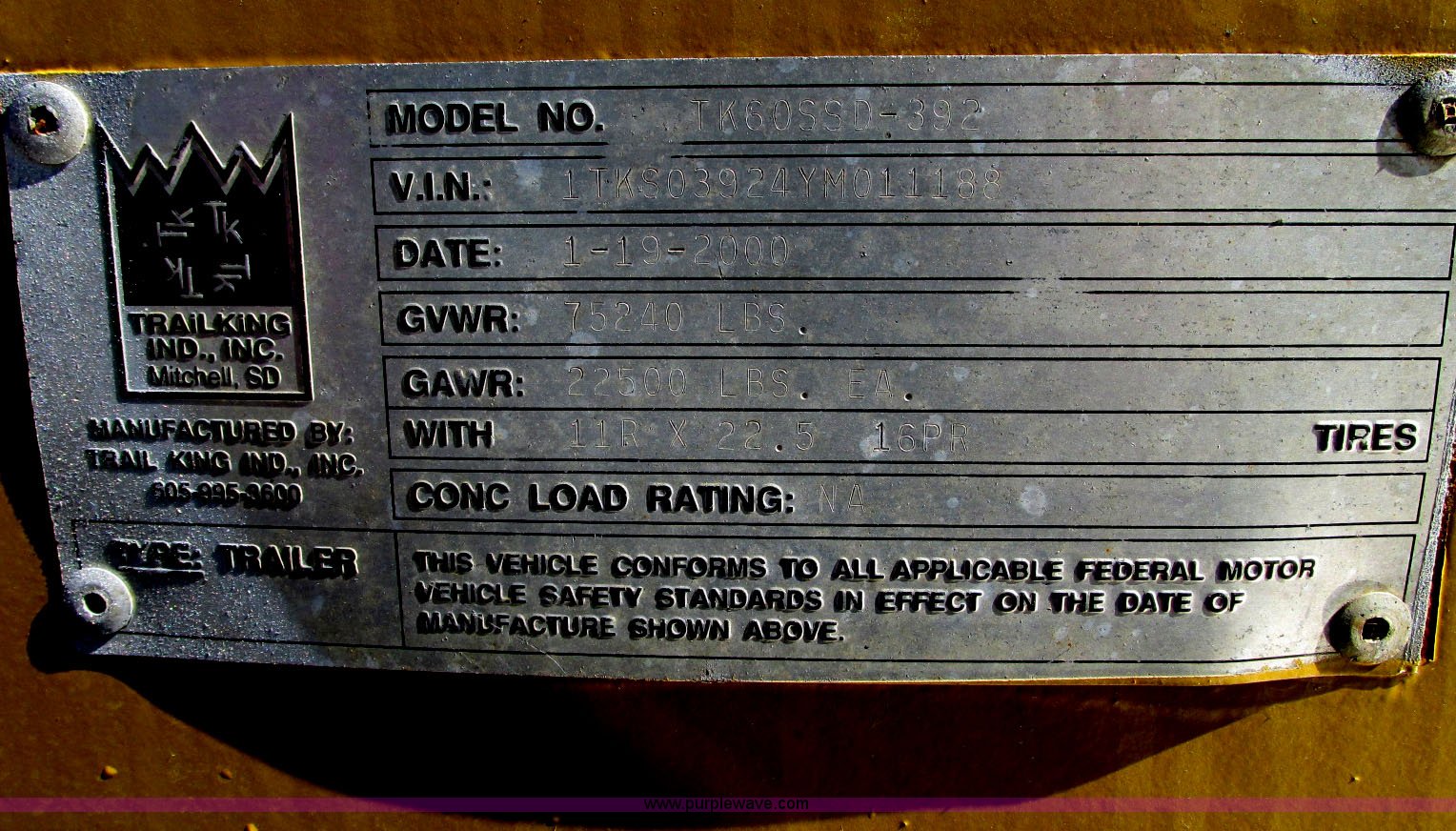 Purple Wave is selling a used Side Tilt Dump Trailer in Minnesota. This item is a 2000 Trail King 39' side dump trailer with the following: Model TK6D55D-392, 34'L bunk, Dual compartment bunk, Dual side dump options, Electric rollover tarp, Spring suspension, 11R22.5 tires, GVWR 75,240 lbs, GAWR 22,500 lbs