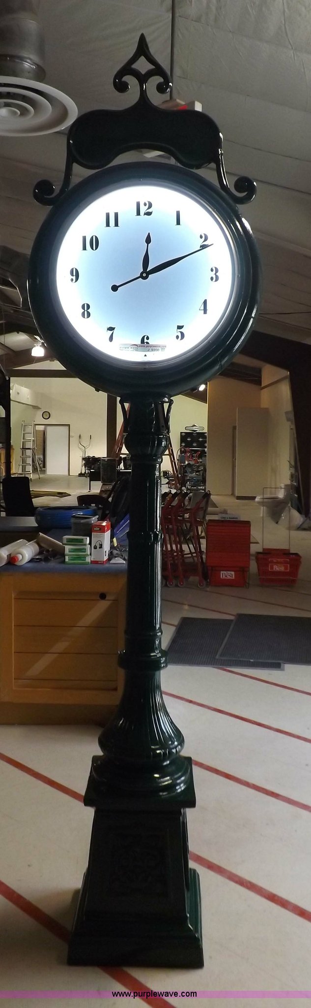 Purple Wave is selling a used All Other Household Items in Kansas. This item is a Dual face cast iron clock with the following: 117"H, 22"W clock face, 16.5" x 16.5" base, Neon lit, 110V, Base access panel, Photo cell for neon lamps