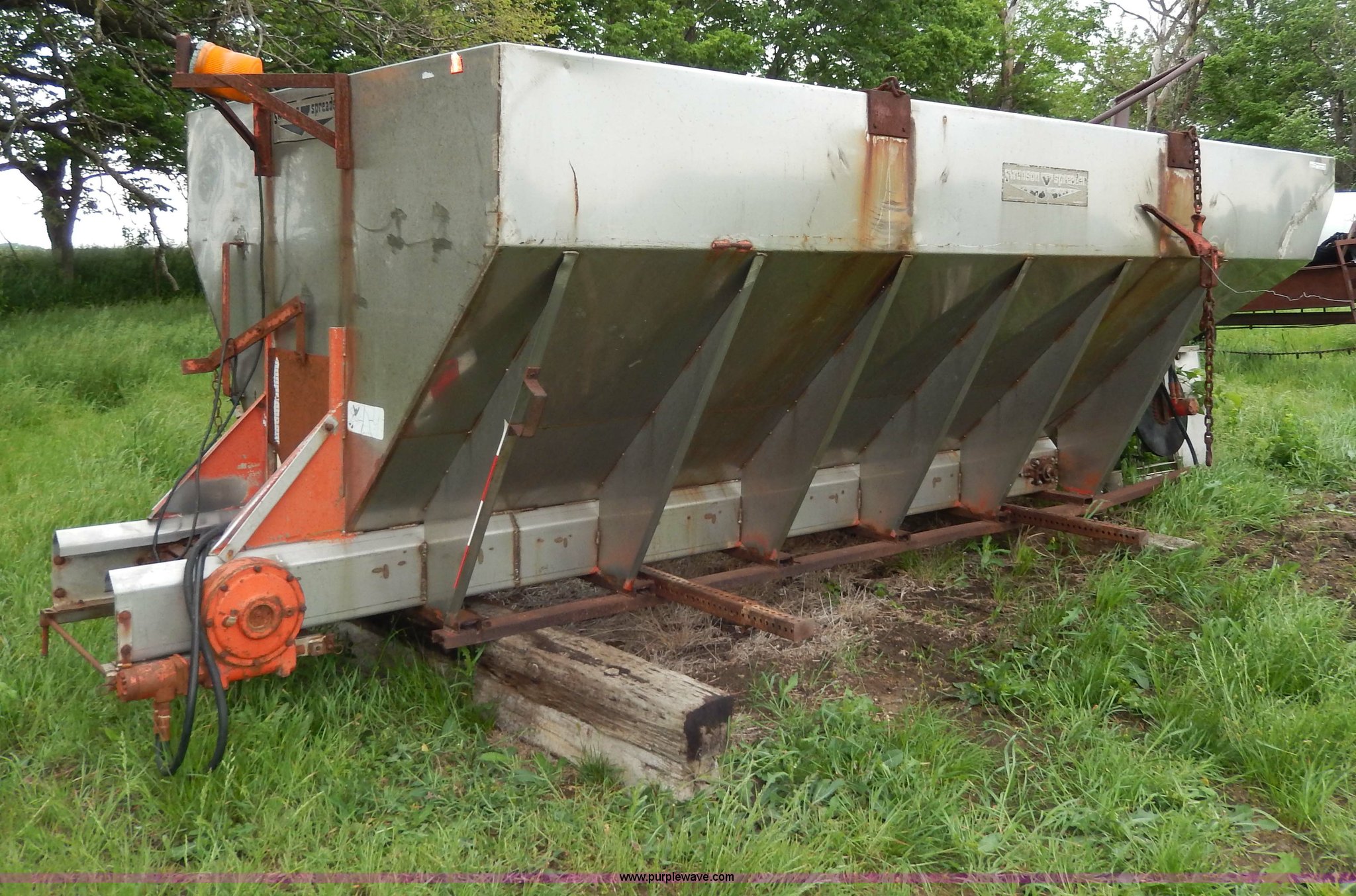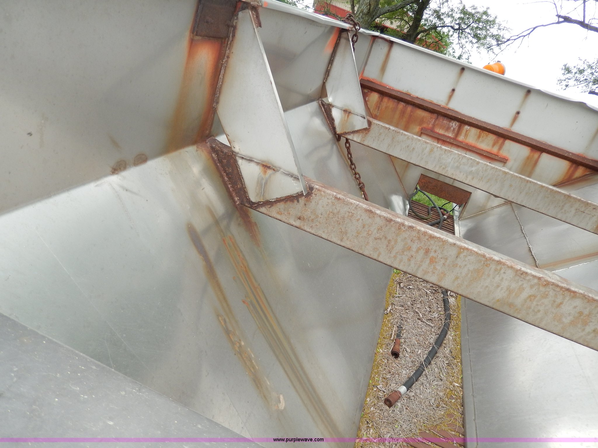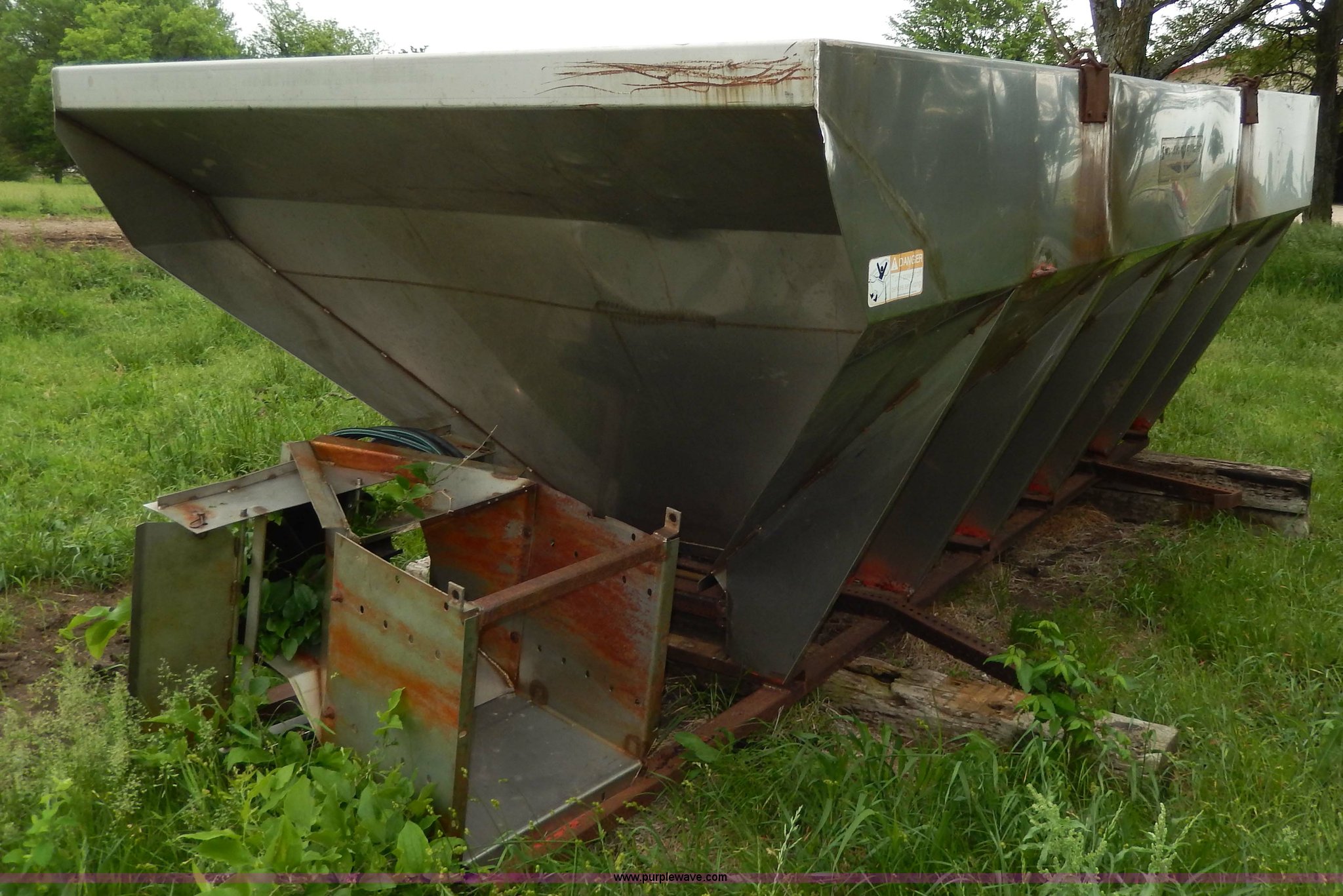 Swenson stainless steel spreader. 14' x 7' x 5', Side tie down chains, Unknown operating condition. Shipping quotes available. 5852 E 125th St. Overbrook, KS 66524