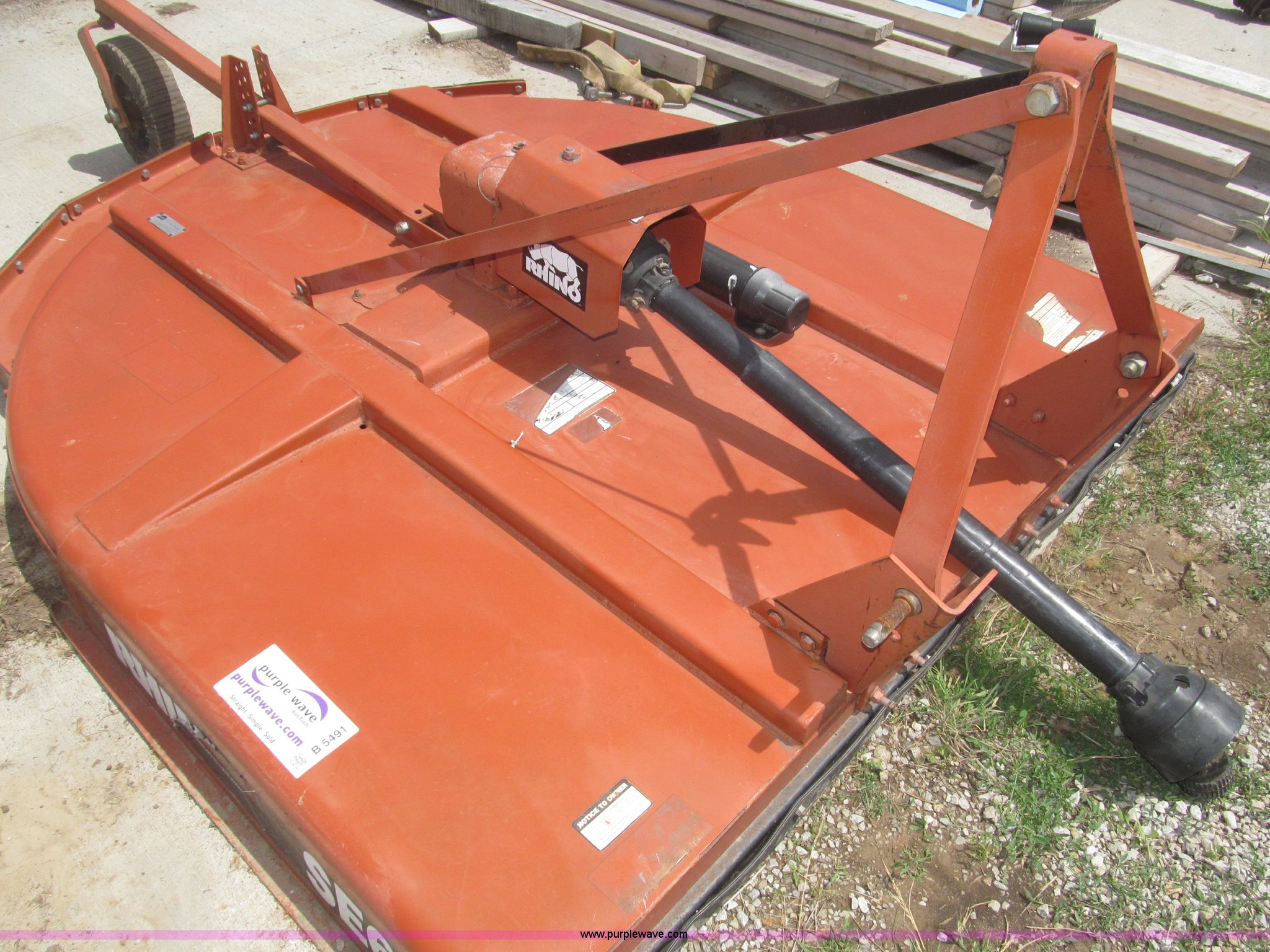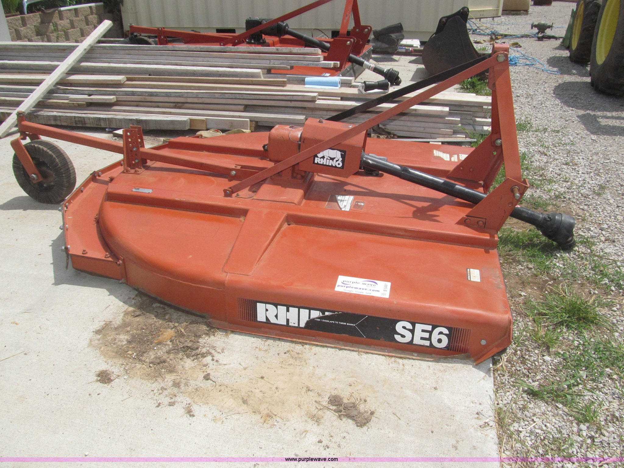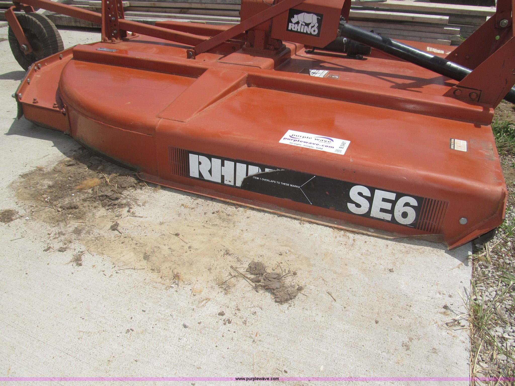 Purple Wave is selling a used Mower, Cutter, Shredder in Nebraska. This item is a Rhino SE6 72" rotary mower with the following: Three point, 540 PTO, Slip clutch, Adjustable three point, Front and rear rubber guard, Adjustable rear swivel wheel, Manual, Serial 26335