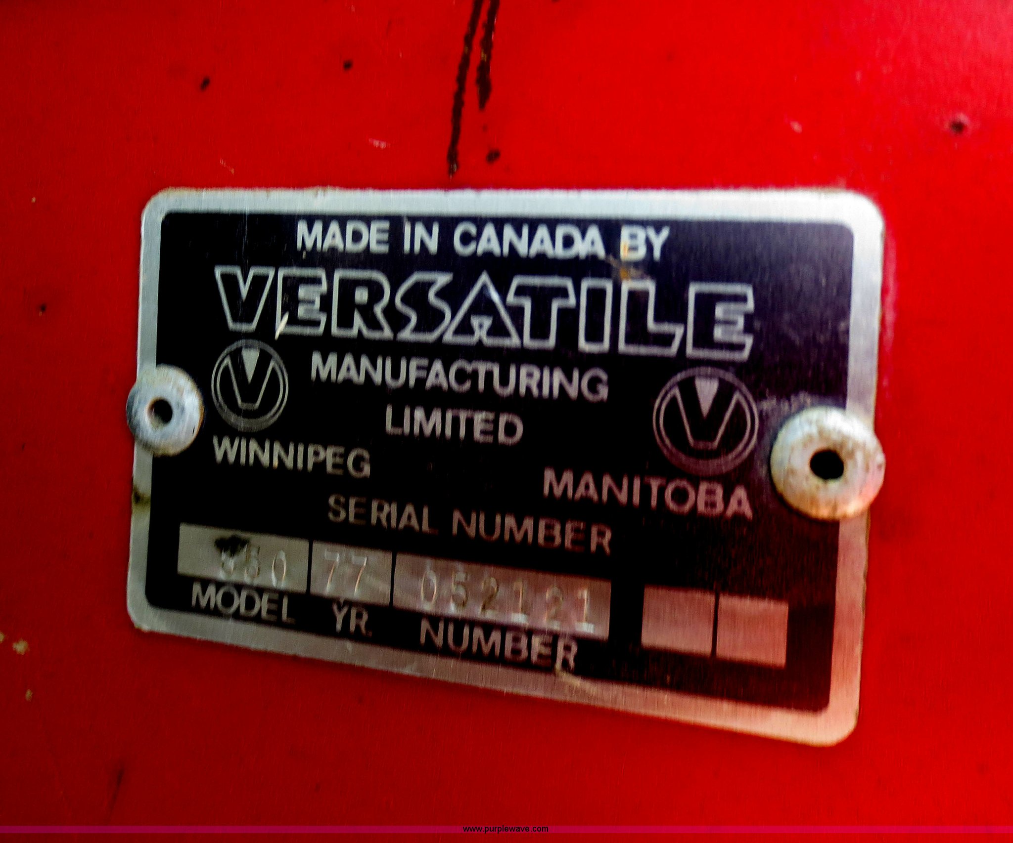 Purple Wave is selling a used Articulated 4-Wheel Drive Tractor in Arkansas. This item is a 1977 Versatile 850 4WD tractor with the following: 7,144 hours on meter, Cummins Big Cam six cylinder diesel engine, Manual transmission, 12F-4R gears, AC and heat, AC needs charged, Three point, Draw bar, (3) rear hydraulic remotes, 30.5L-32 dual tires, Serial 052121
