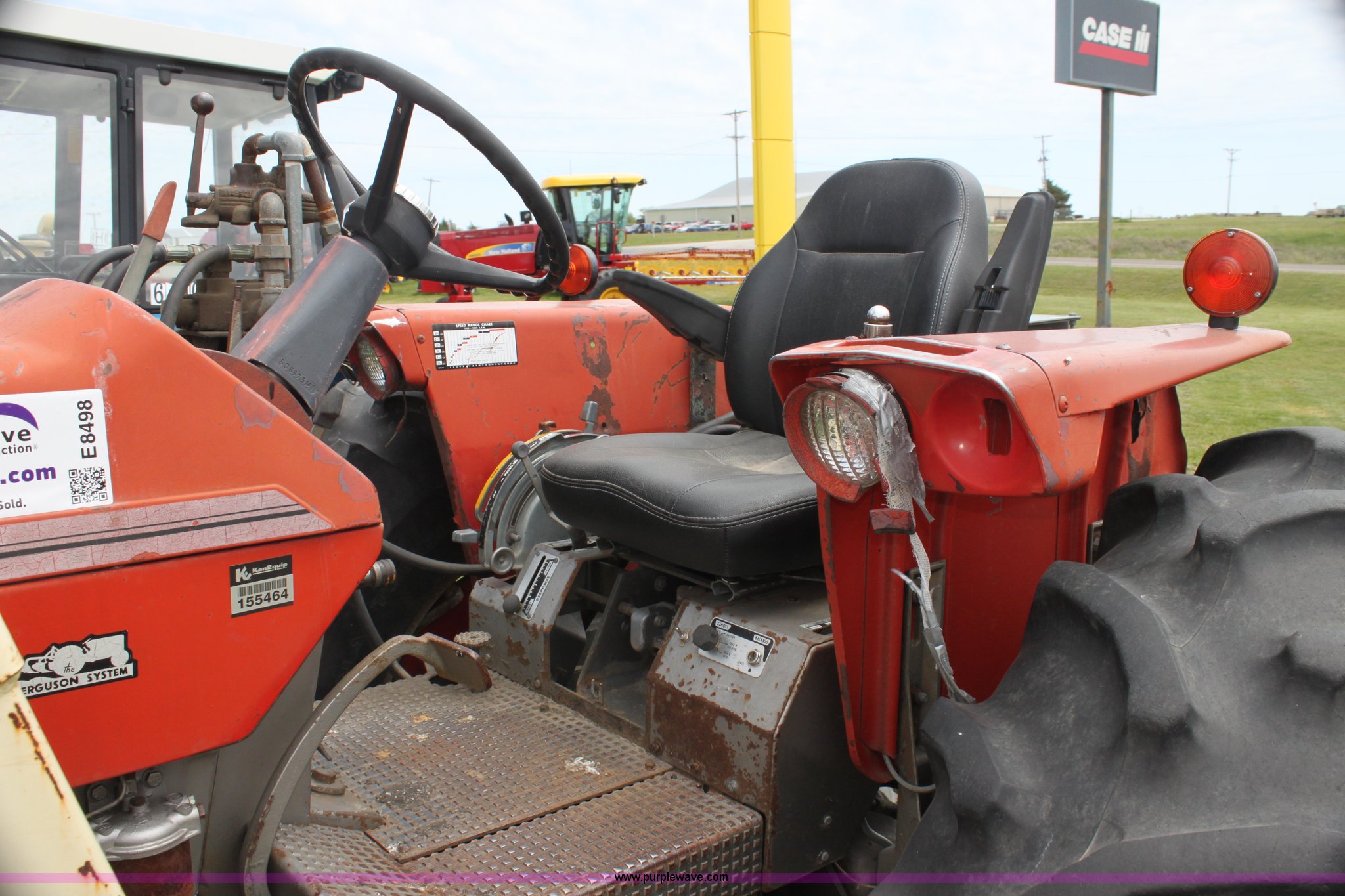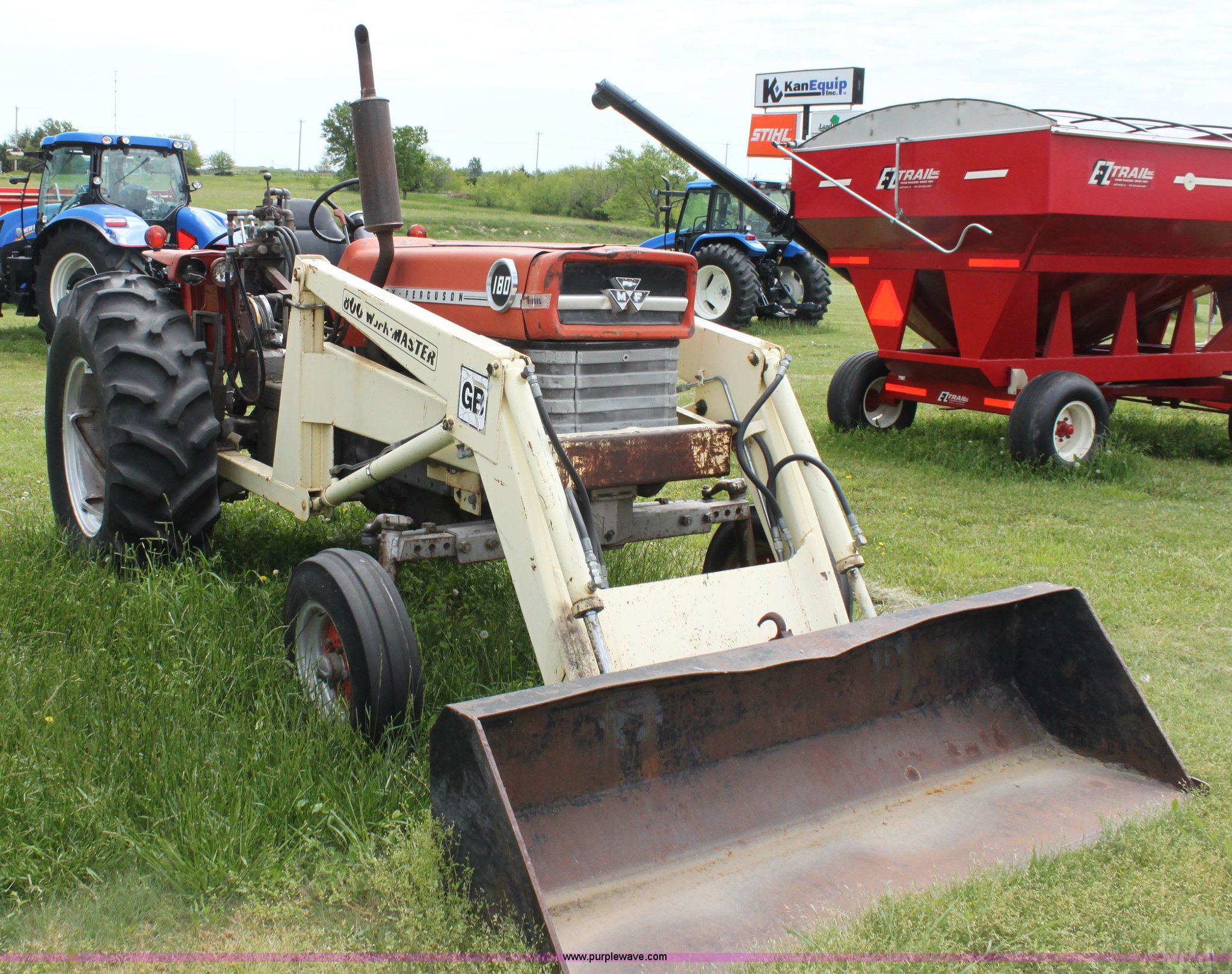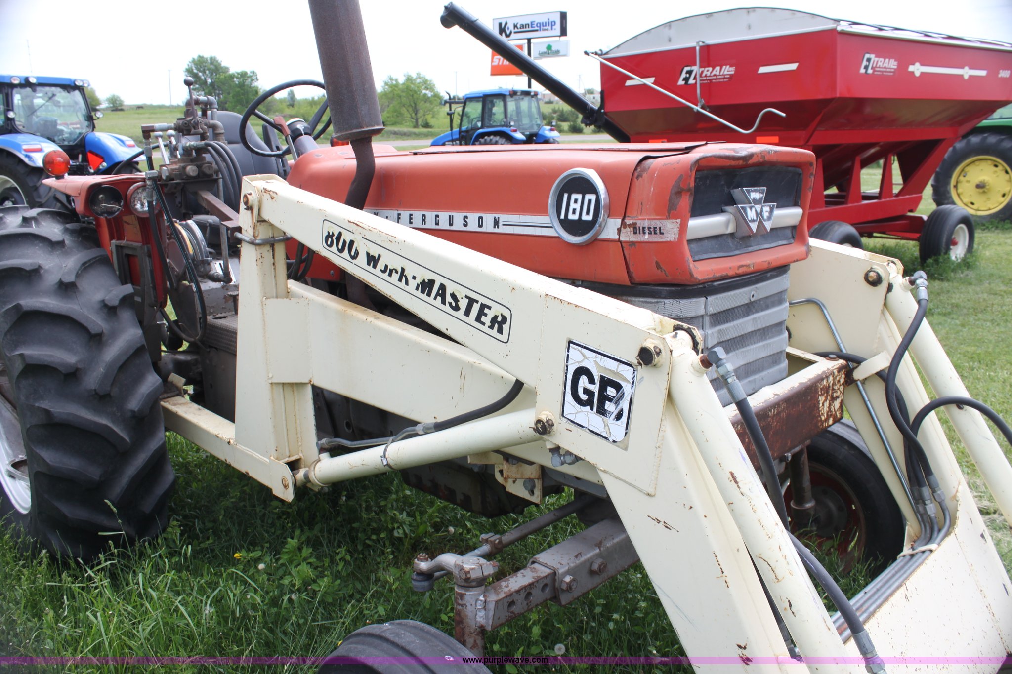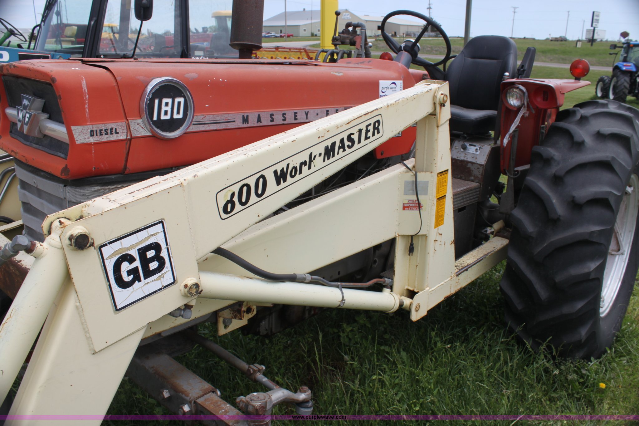 Purple Wave is selling a used Tractor in Kansas. This item is a Massey-Ferguson 180 tractor with the following: 5,174 hours on meter, Perkins diesel engine, Synchro transmission, 6F-2R gears, Tilt steering wheel, Three point, Draw bar, 540 PTO, Single rear hydraulic remote, GB 800 Workmaster loader, 7'W bucket, Hydraulics ran off of PTO, 7.5 x 15 front tires, 18.4 x 30 rear tires, Loader slowly leaks down during operation, Serial CDW645001389, Unit# 155464