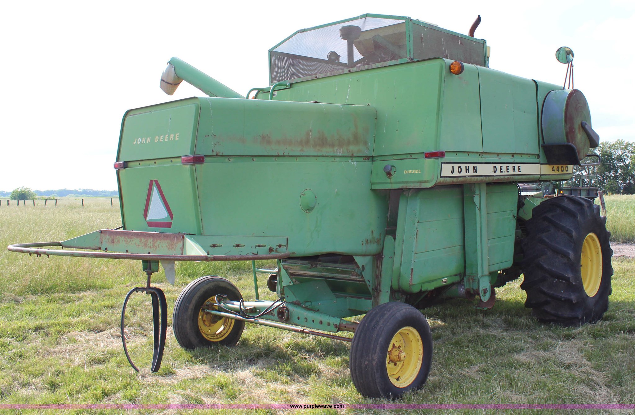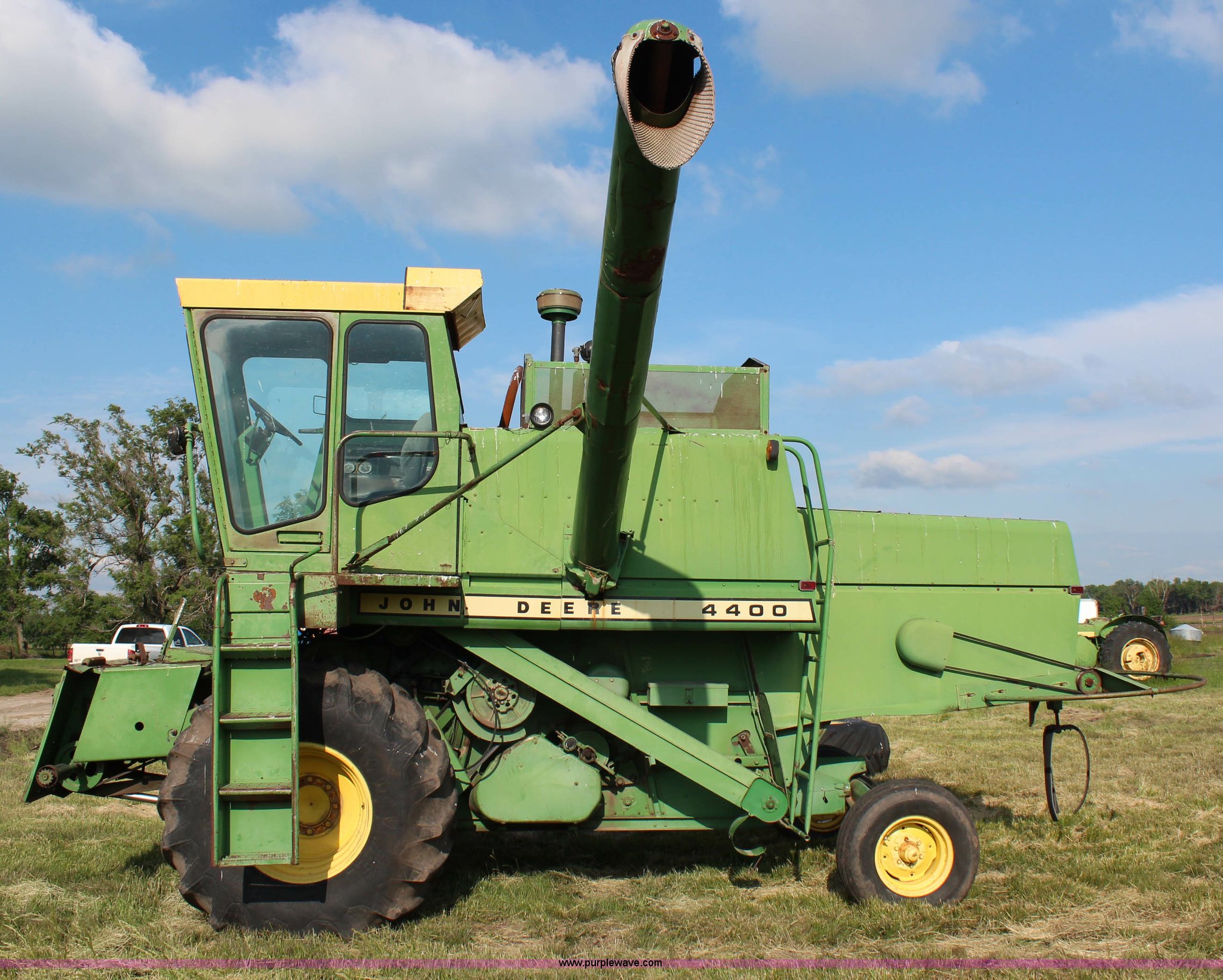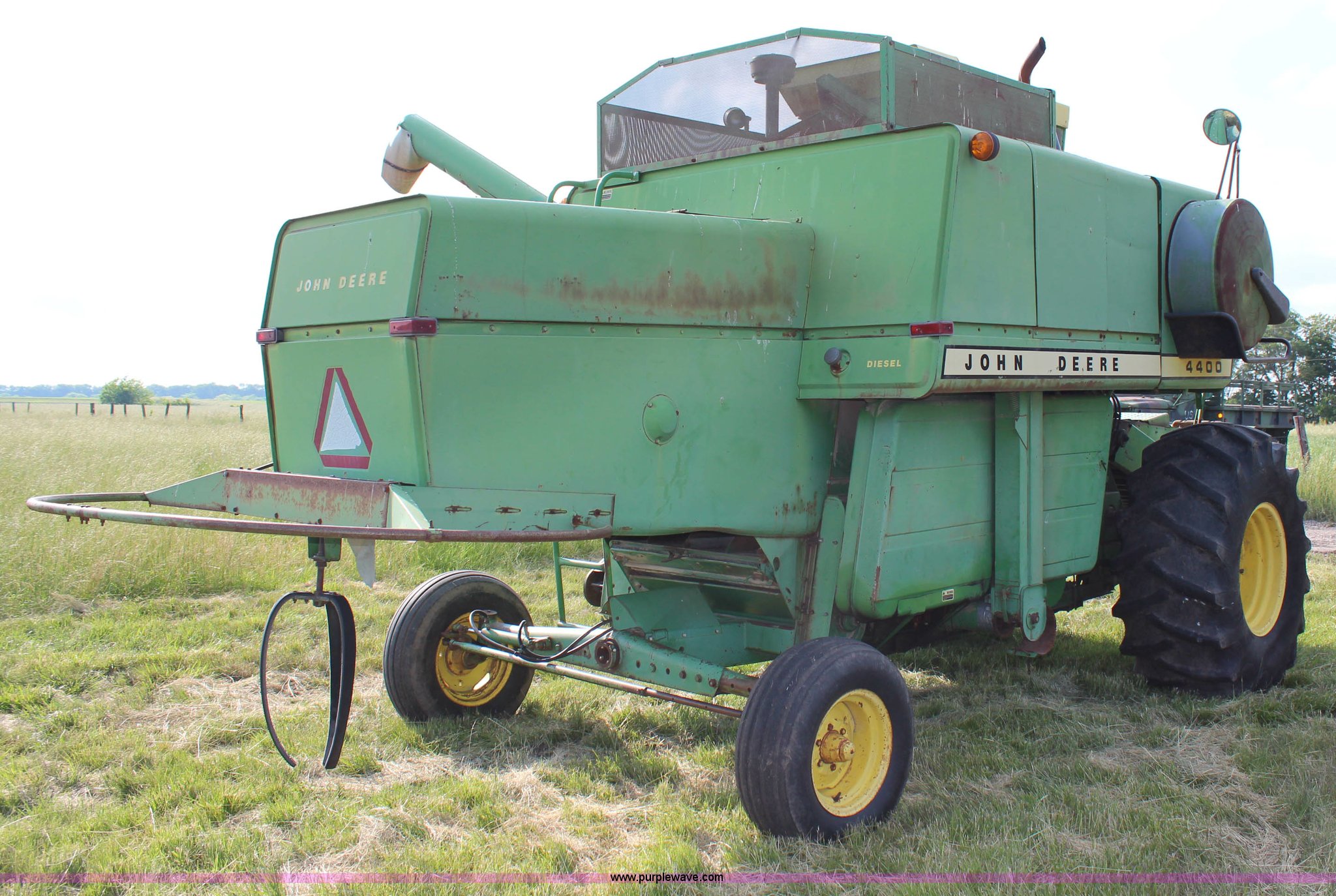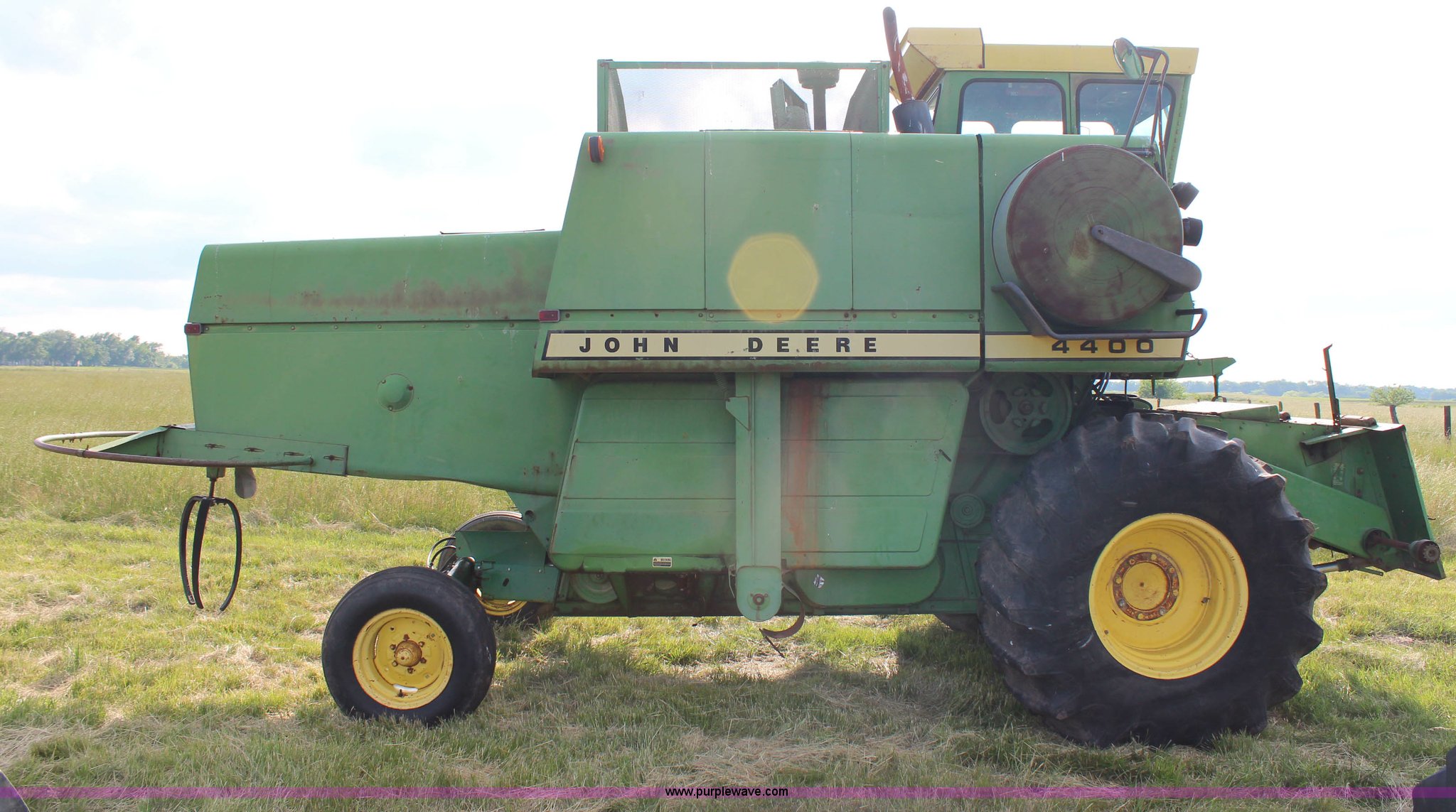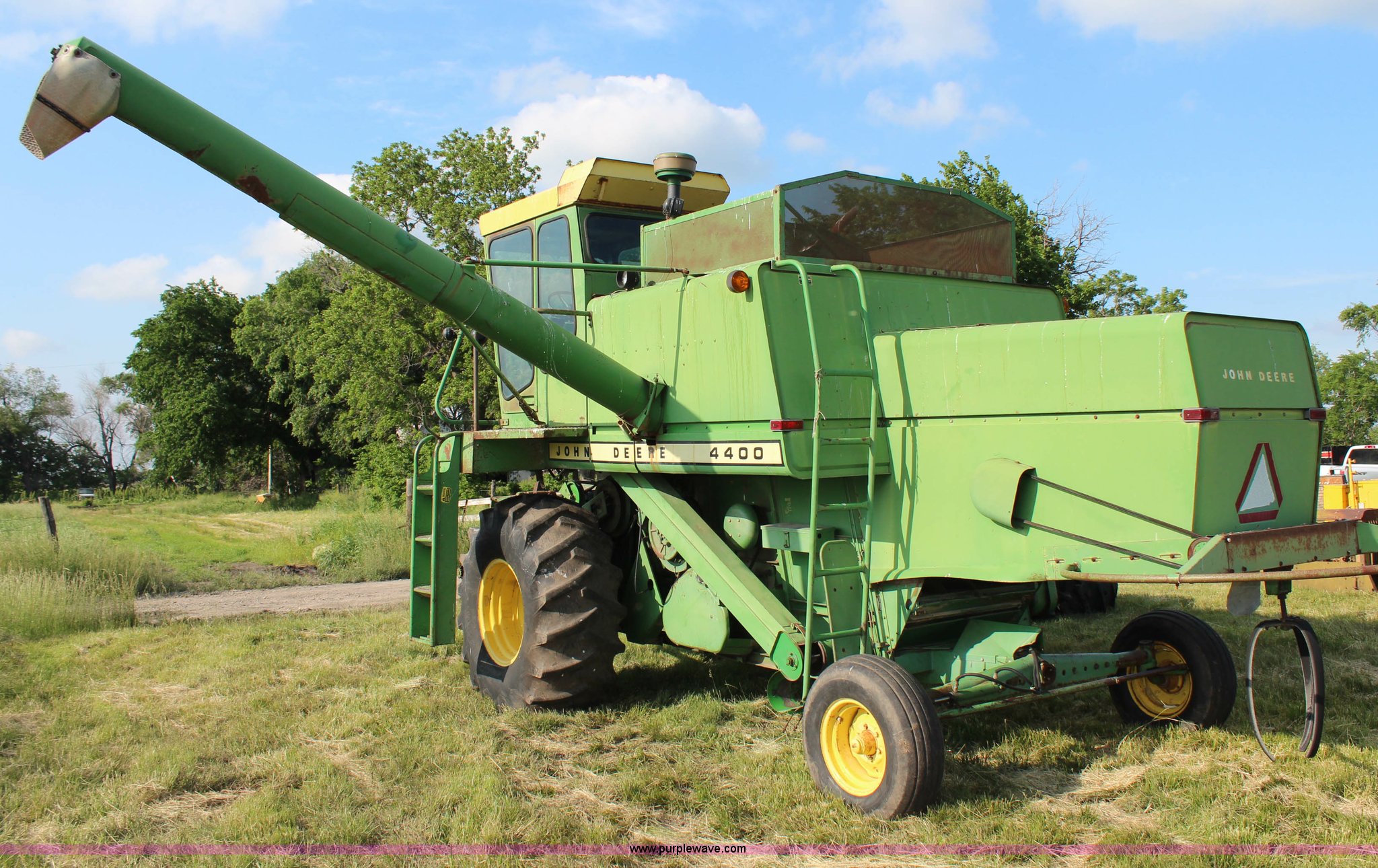 Purple Wave is selling a used Combine in Kansas. This item is a 1976 John Deere 4400 combine with the following: 2,734 engine hours on meter, John Deere six cylinder diesel engine, 100 HP, Four speed hydrostatic transmission, Electric header clutch, Straw spreader, Accumulator, Murphy switches, Auto/manual header height, 23.1-26 front tires, 11L-15 rear tires, Serial 201815H