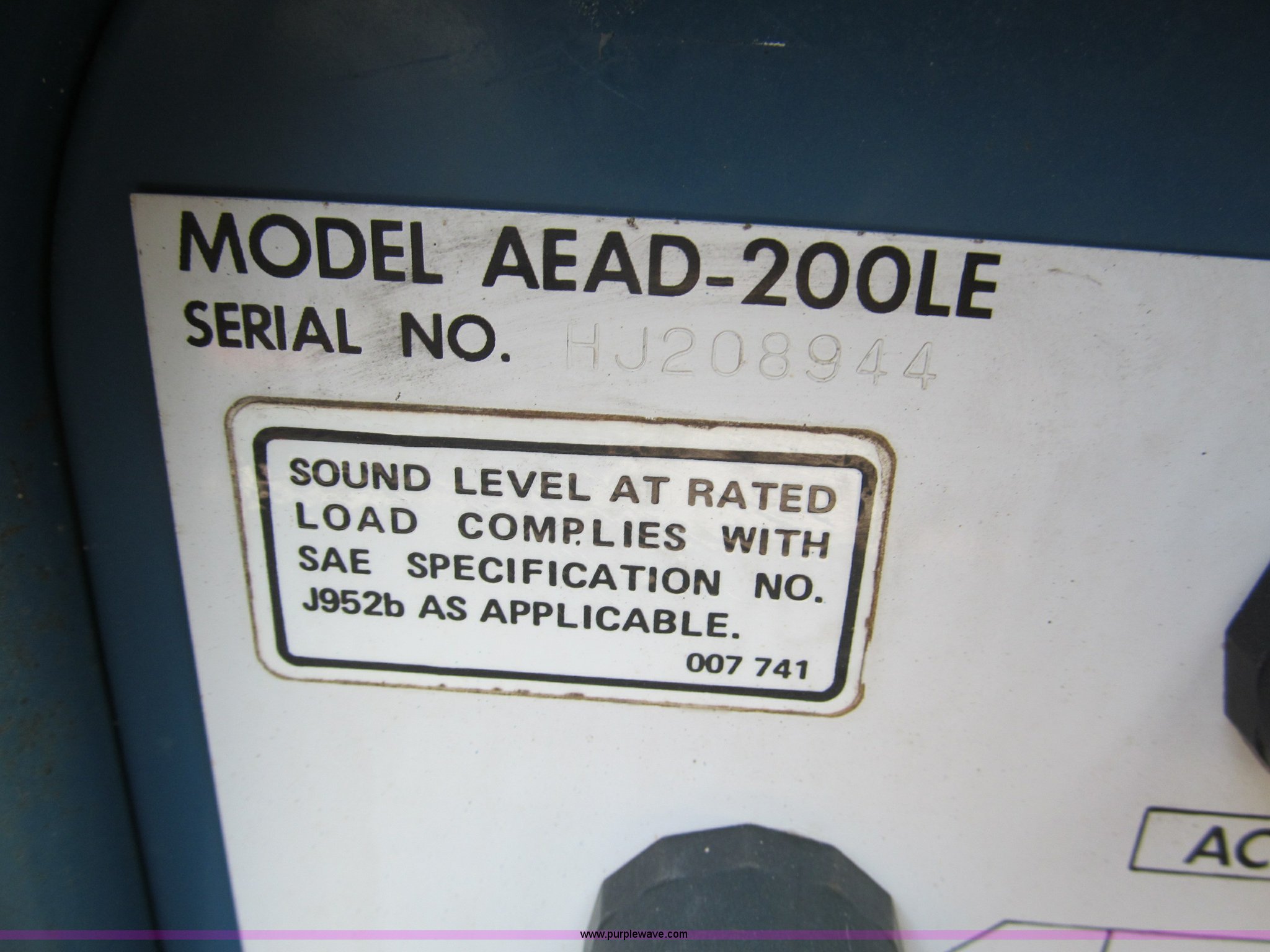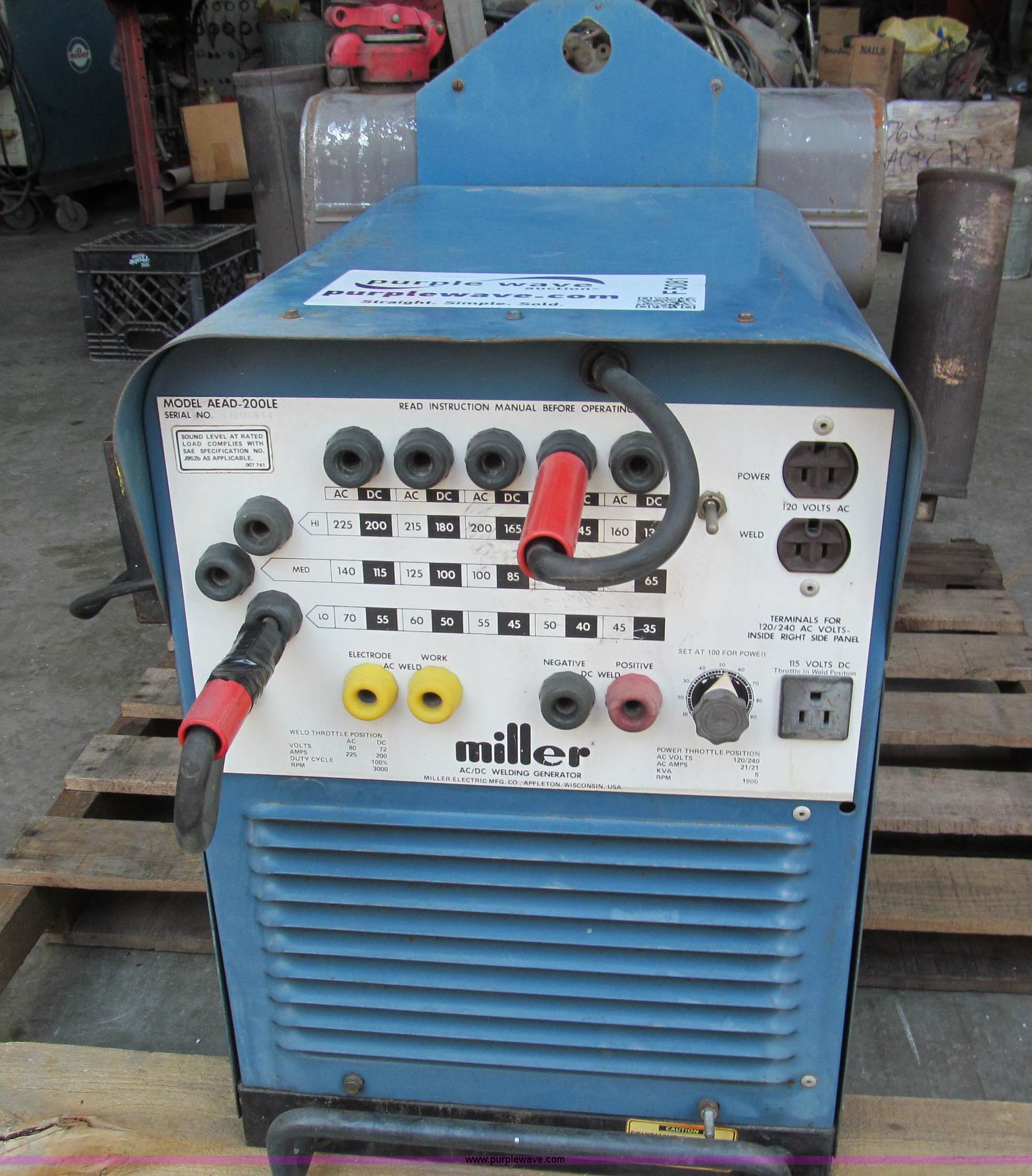Purple Wave is selling a used Welder (Manual) in Missouri. This item is a Miller AC/DC welder with the following: 354 hours on meter, Model AEAD-200LE, Onan gas engine, 12V electric, 110V outlet, Engine runs but will not weld, Needs battery, Serial HJ208944