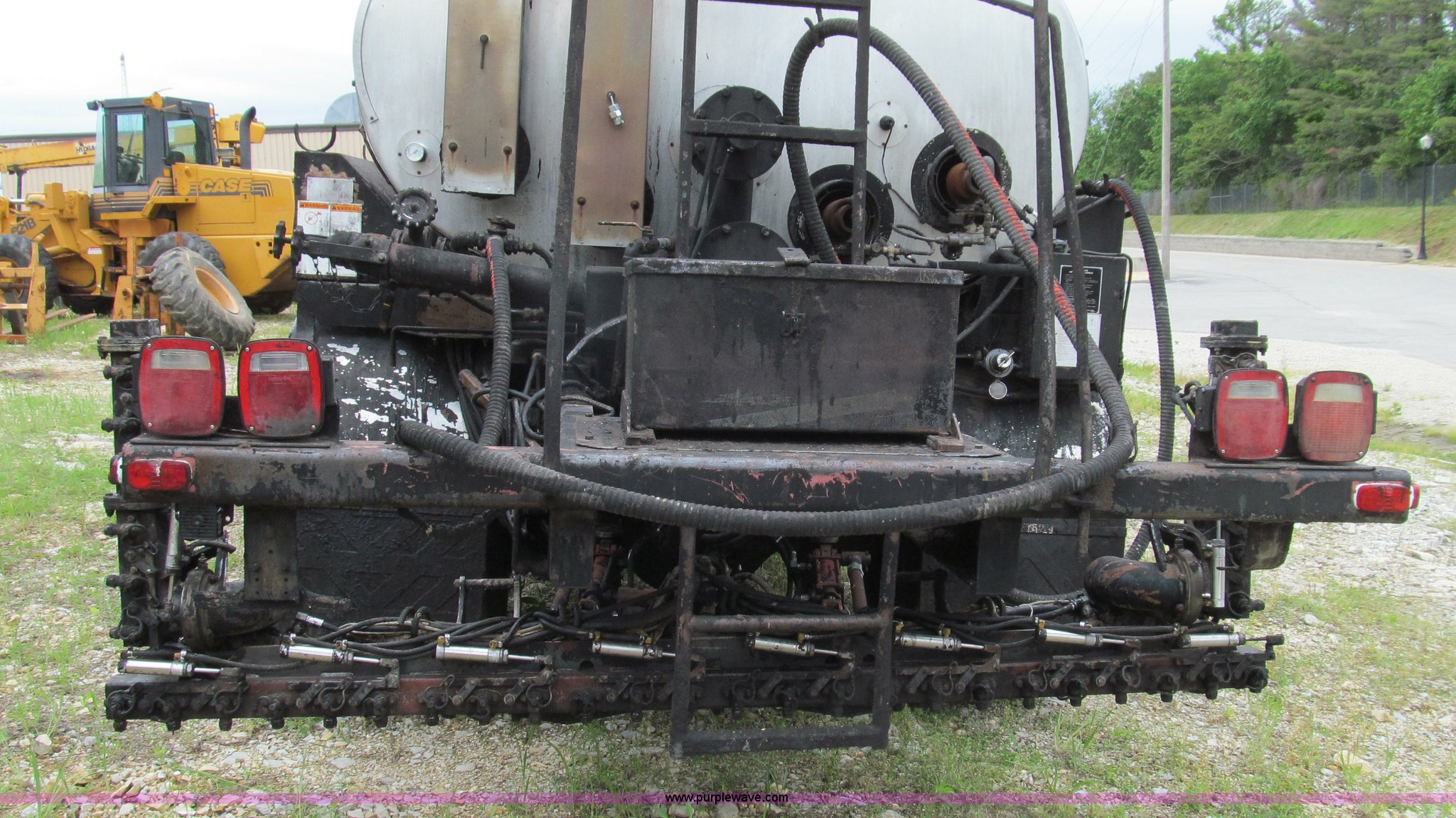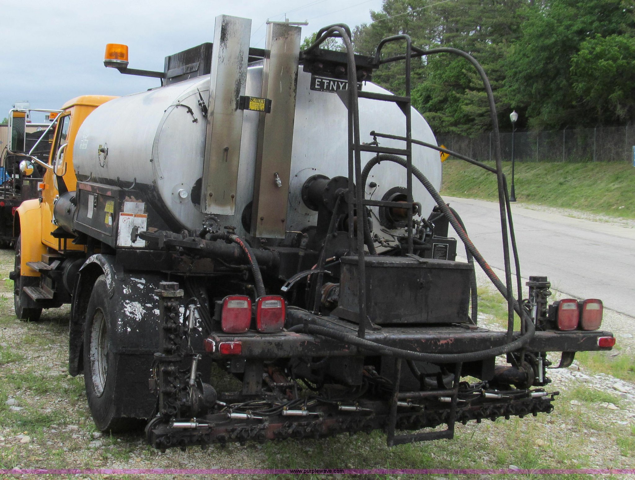 Purple Wave is selling a used Oil Distributor Truck in Missouri. This item is a 1995 International 4900 oil distributor truck with the following: 61,861 miles on odometer, International DT466 7.6L L6 diesel engine, Allison five speed automatic transmission, Heat, AM/FM, Air suspension seat, Etnyre Black-Topper 2000 oil distributor unit, 12'W spray boom, 8' center section, 1,000 gallon capacity, Front bumper mounted hydraulic pump, Etnyre controller, Auxiliary hand wand, (2) amber warning beacon, Toolboxes, Rear access ladder, 50 gallon fuel tank, Spring suspension, Air brakes, 170" wheelbase, 11R22.5 tires, Paint peeling, Sensor on rear bar needs repair, MoDOT ID G7969