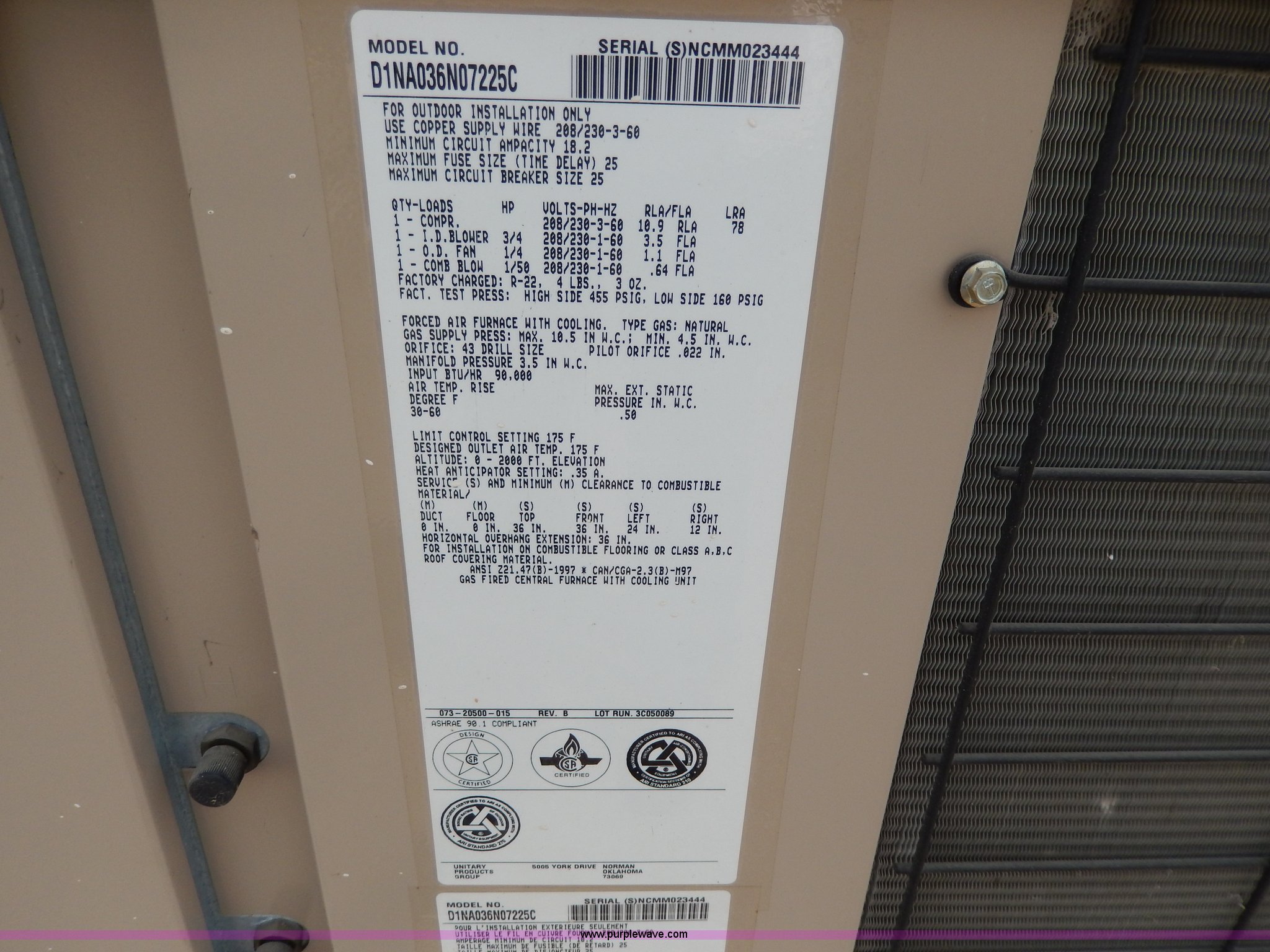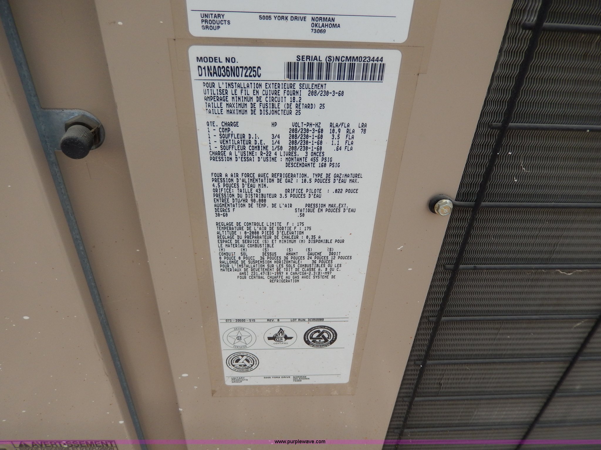 Purple Wave is selling a used Appliances in Kansas. This item is a York AC/heat unit with the following: Model D1NA036N07225C, 4' x 46" x 33.5", Natural gas, 90,000 BTU per hour, Serial NCMM023444
