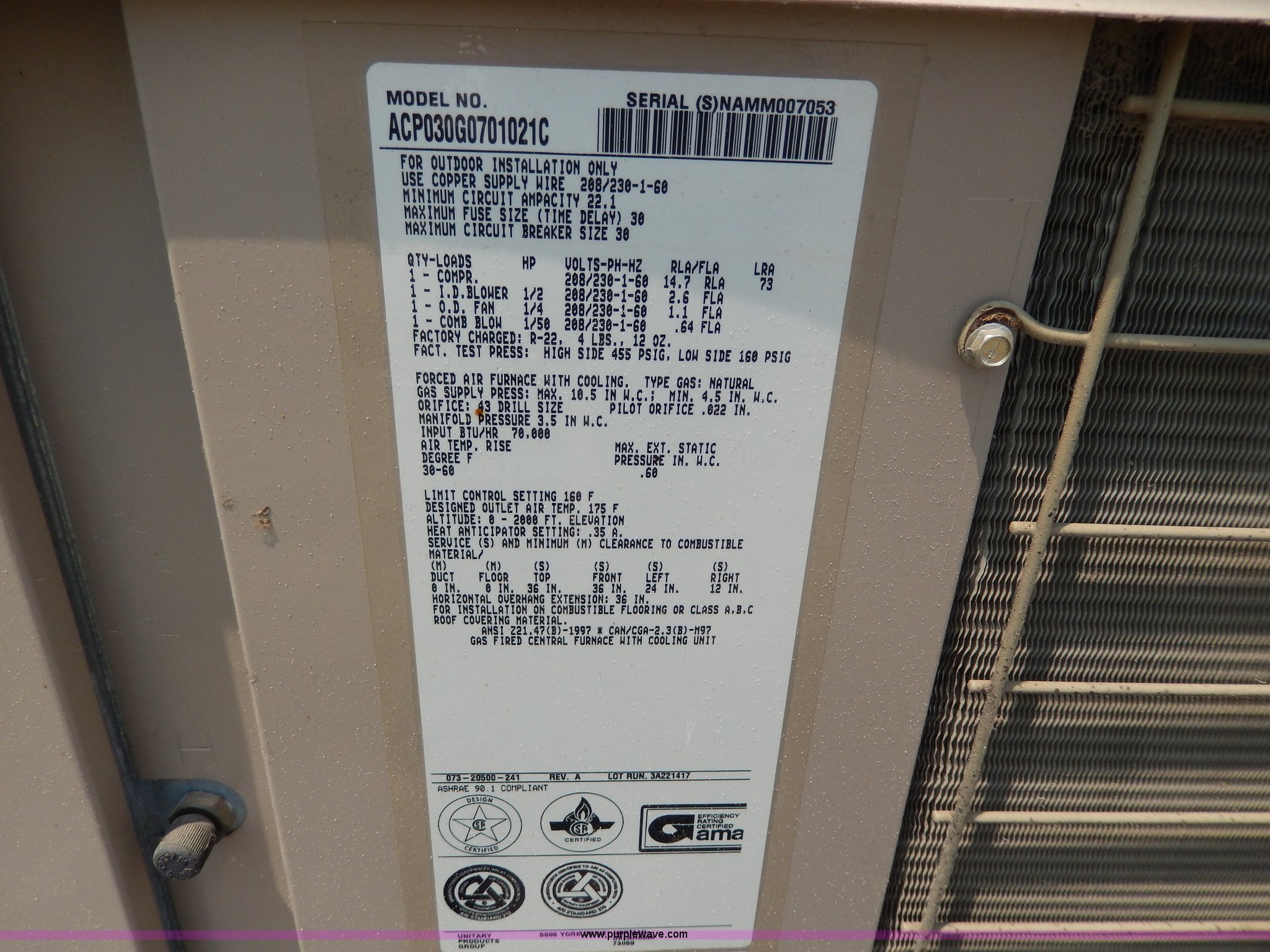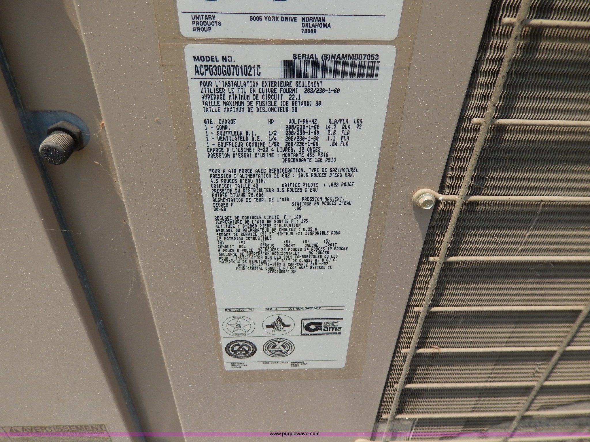 Purple Wave is selling a used Appliances in Kansas. This item is a York AC/heat unit with the following: Model ACD03060701021C, 4' x 46" x 33.5", Natural gas, 70,000 BTU per hour, Serial NAMM007053