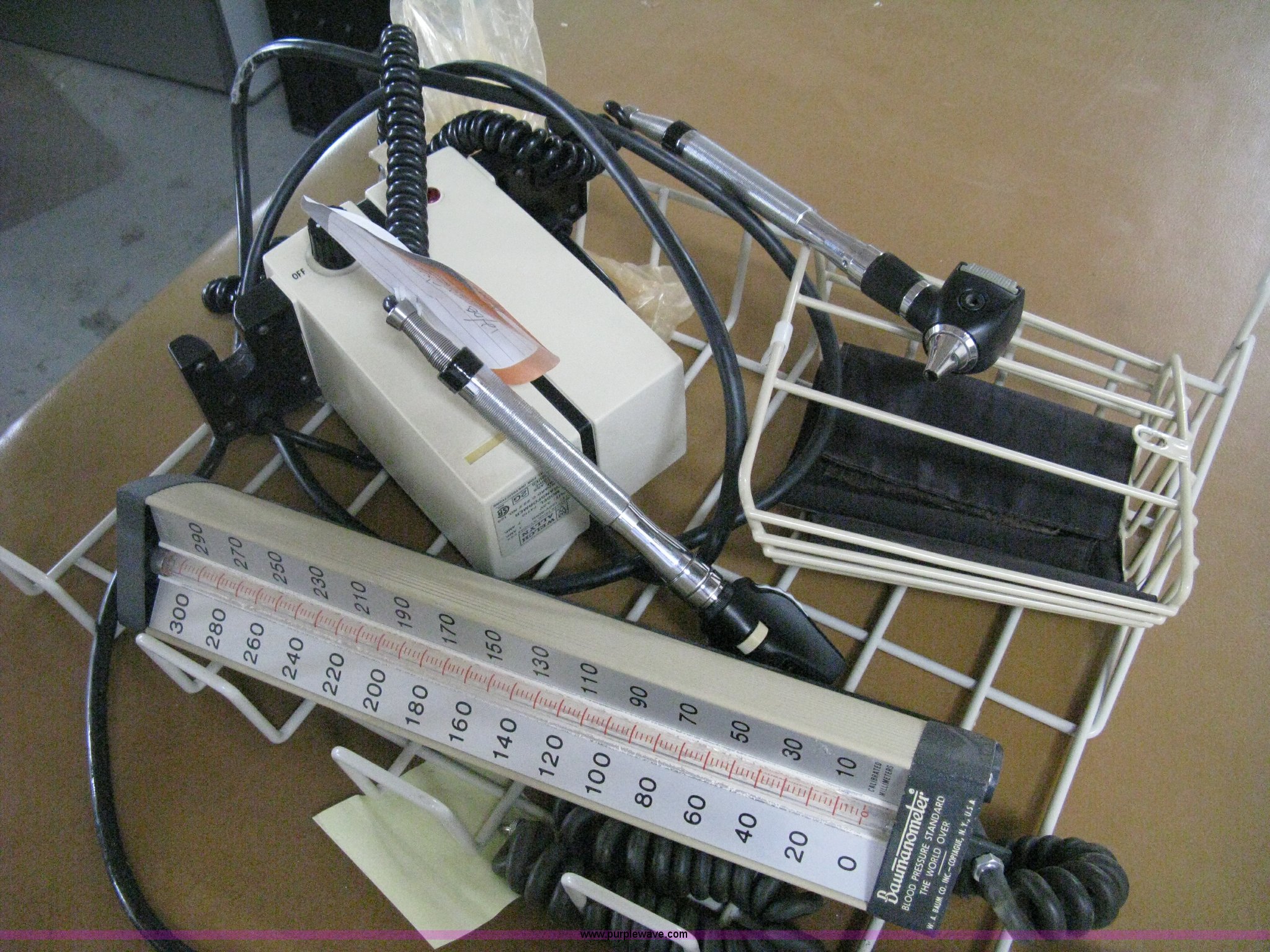 Assorted medical equipment. (2) exam tables, Medicine cabinet, Supply canisters, Blood pressure cuff Unknown operating condition, Opthalascope Inoperable. Shipping quotes available. Reno County. 206 W 1st Street. Hutchinson, KS 67501