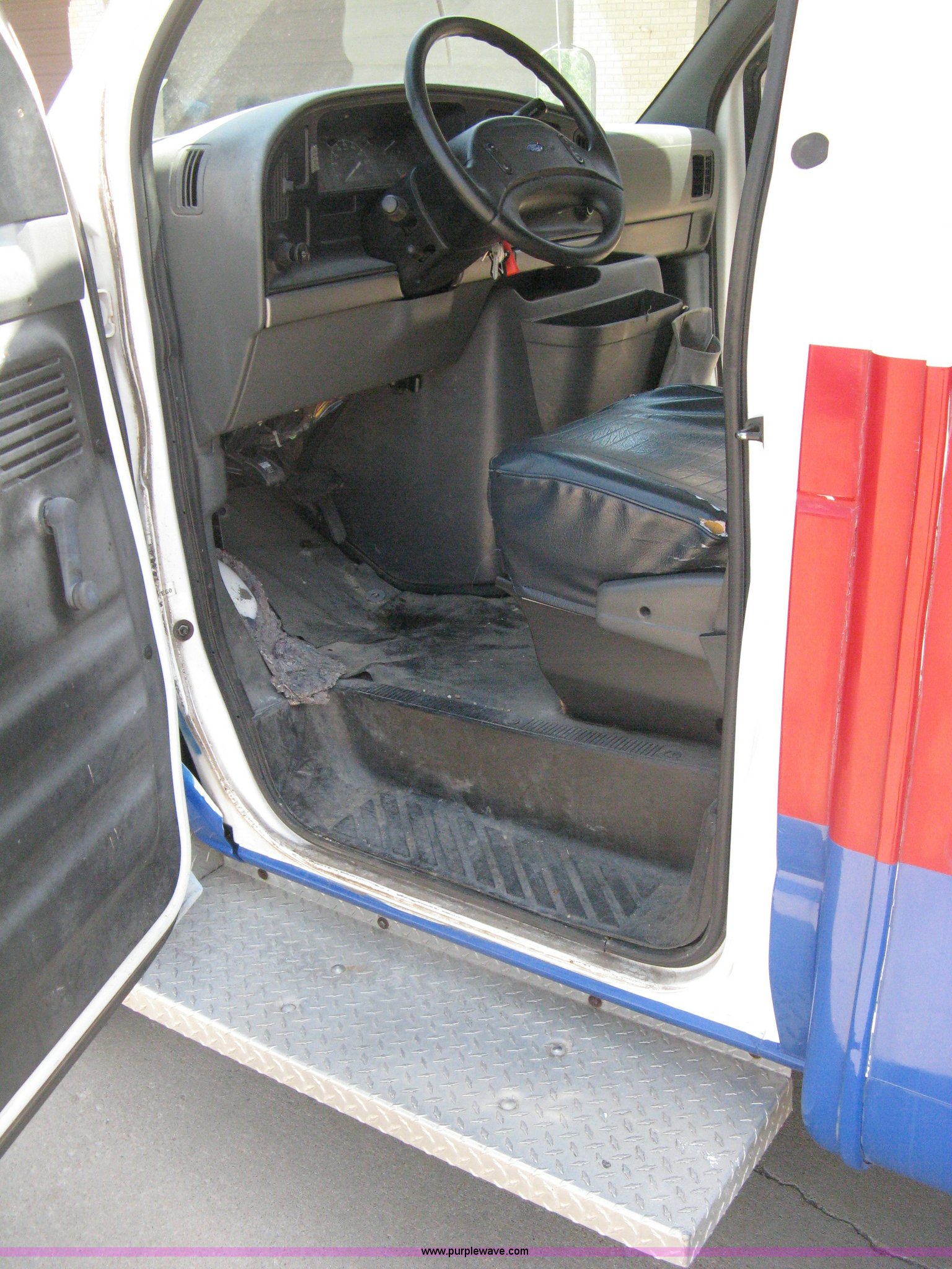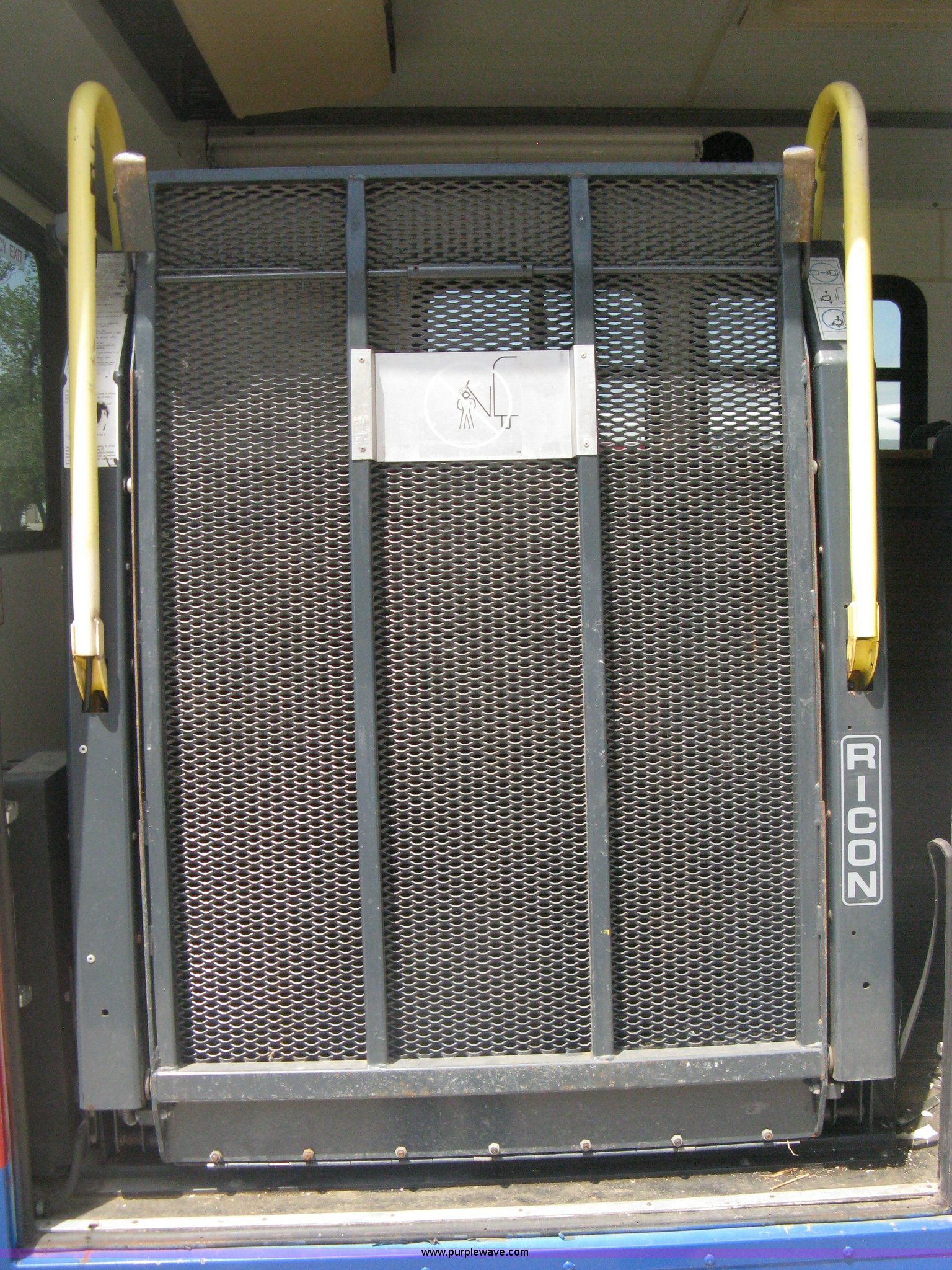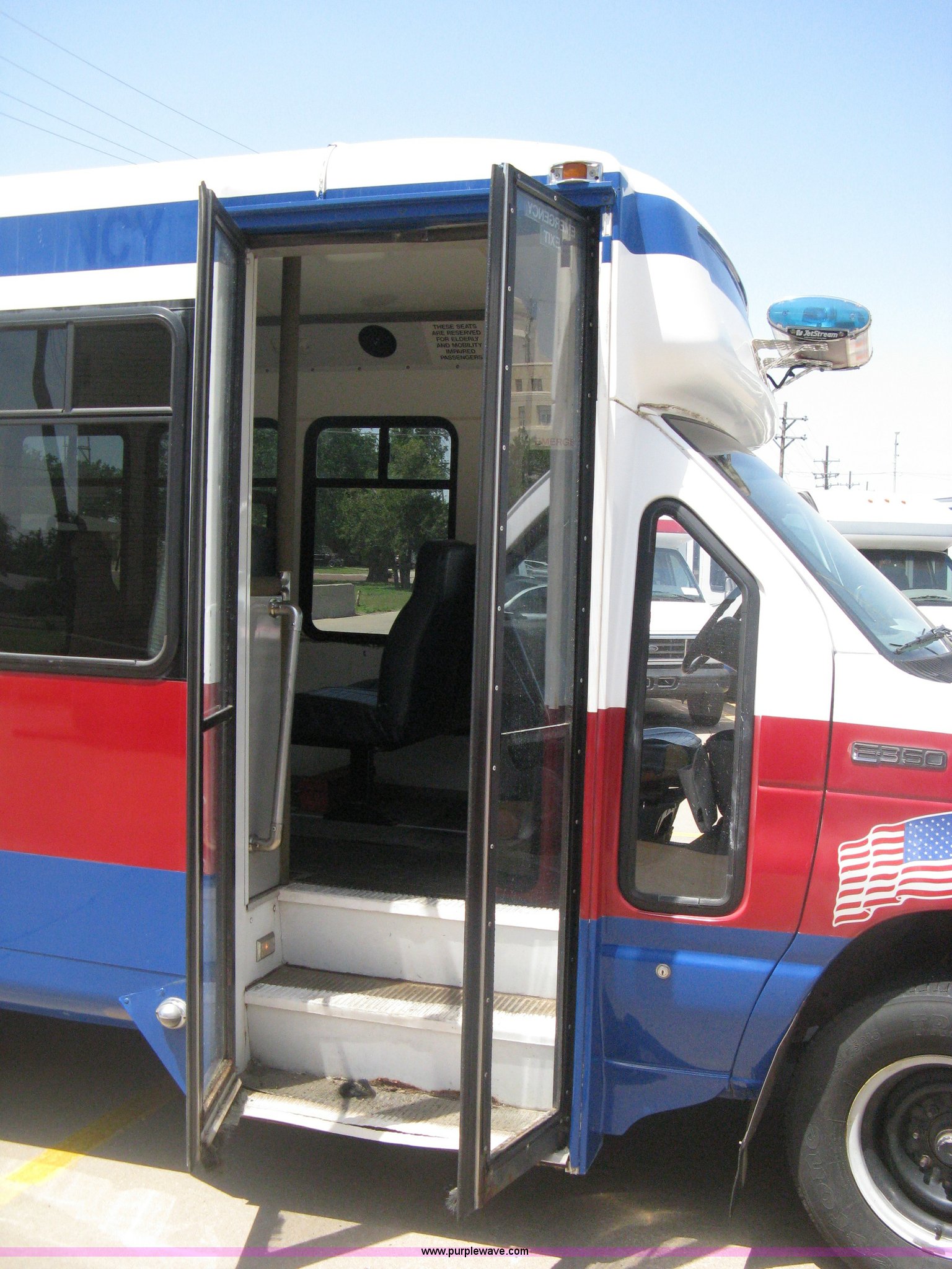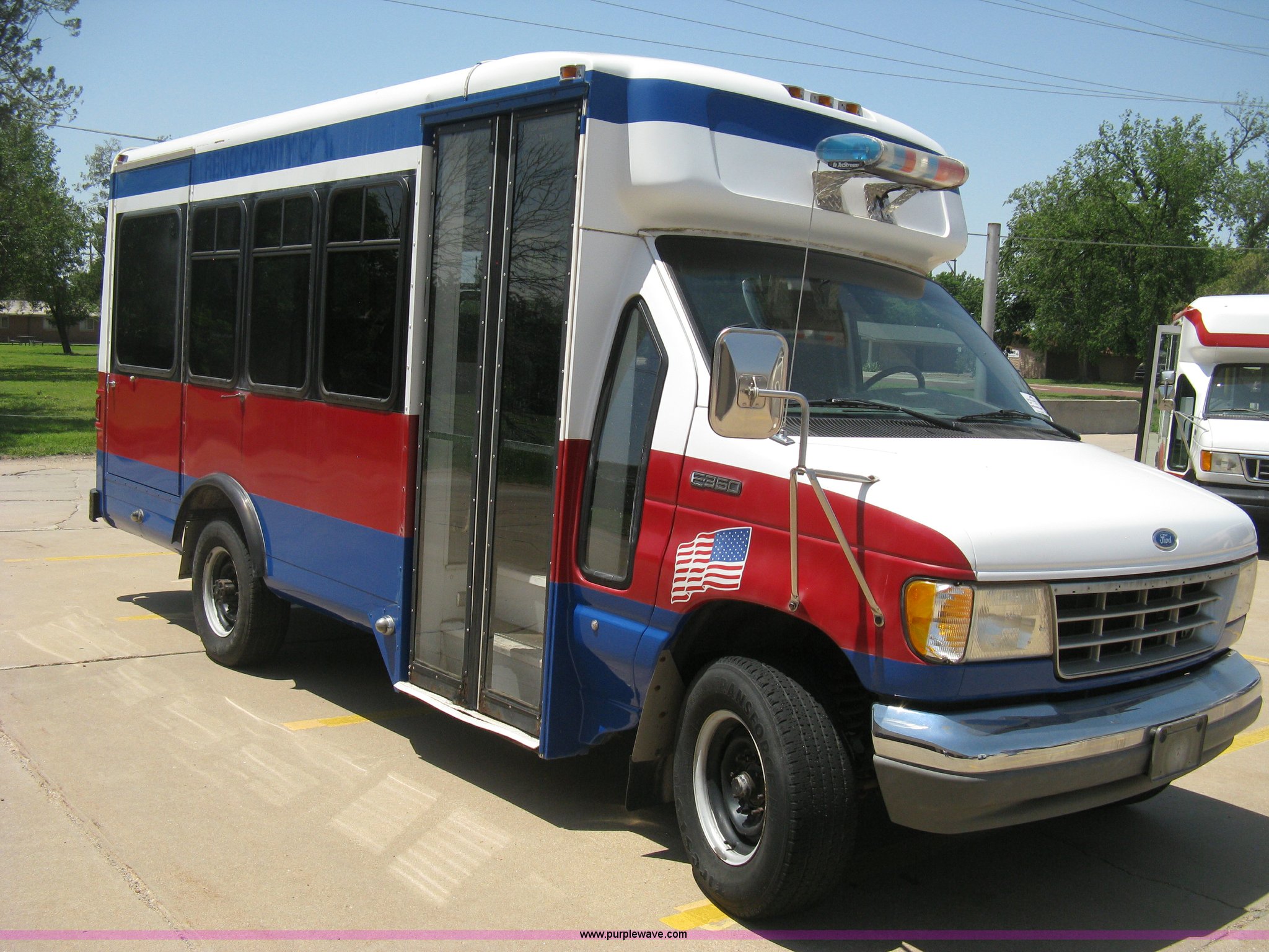 Purple Wave is selling a used Bus in Kansas. This item is a 1994 Ford E350 Collins transit bus with the following: 129,323 miles on odometer, 5.8L V8 OHV 16V gas engine, Automatic transmission, AC and heat, AC inoperable, Tilt, Cruise, AM/FM, Manual windows and locks, Vinyl interior, Power passenger door, Tinted passenger windows, Six passenger capacity, Wheel chair accessible, Wood storage cabinet, Rear emergency egress, Ricon wheel chair lift, Tethered remote, Emergency light bar, LT245/75R16 tires, GVWR 9,600 lbs, ABS light illuminated, Rust, Structural rust damage to bottom passenger entry door step, Driver's seat damaged, Service records available