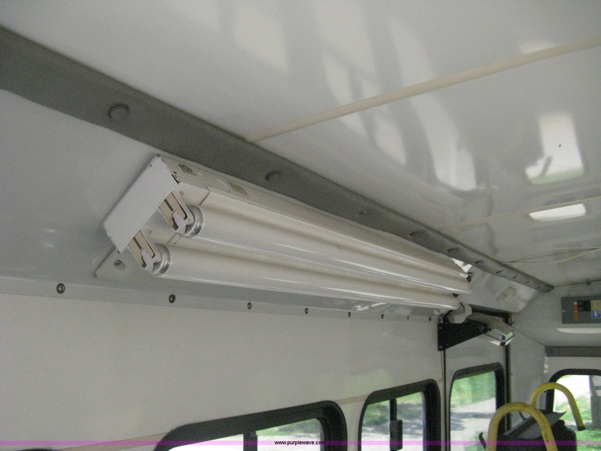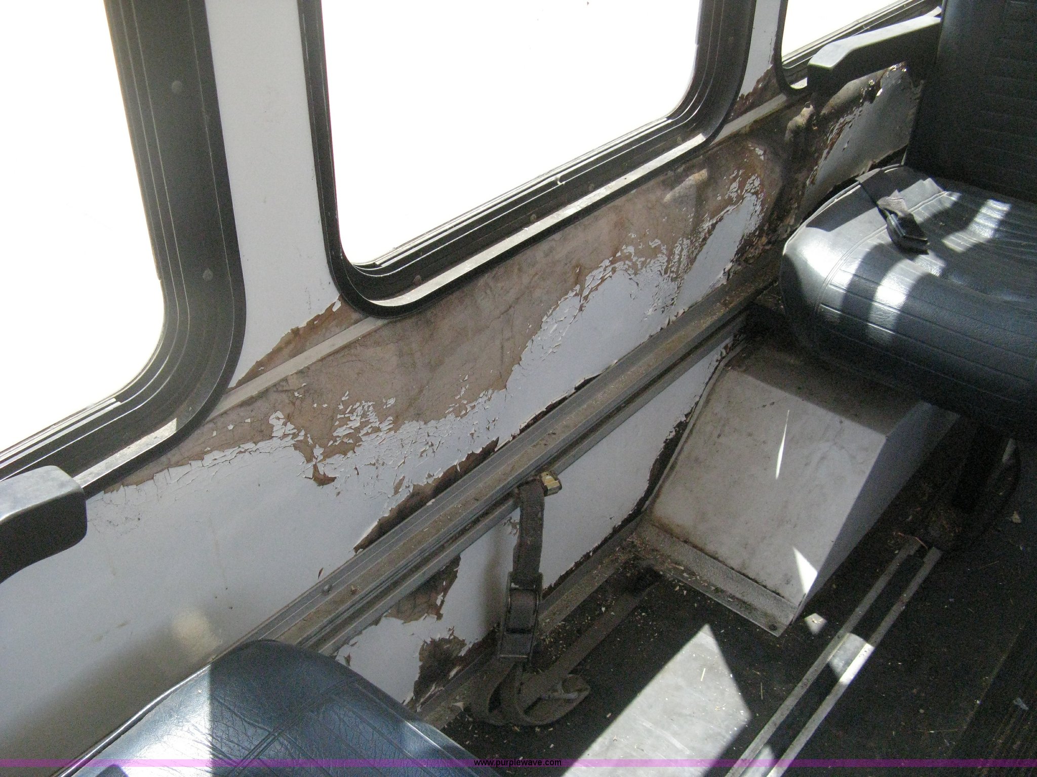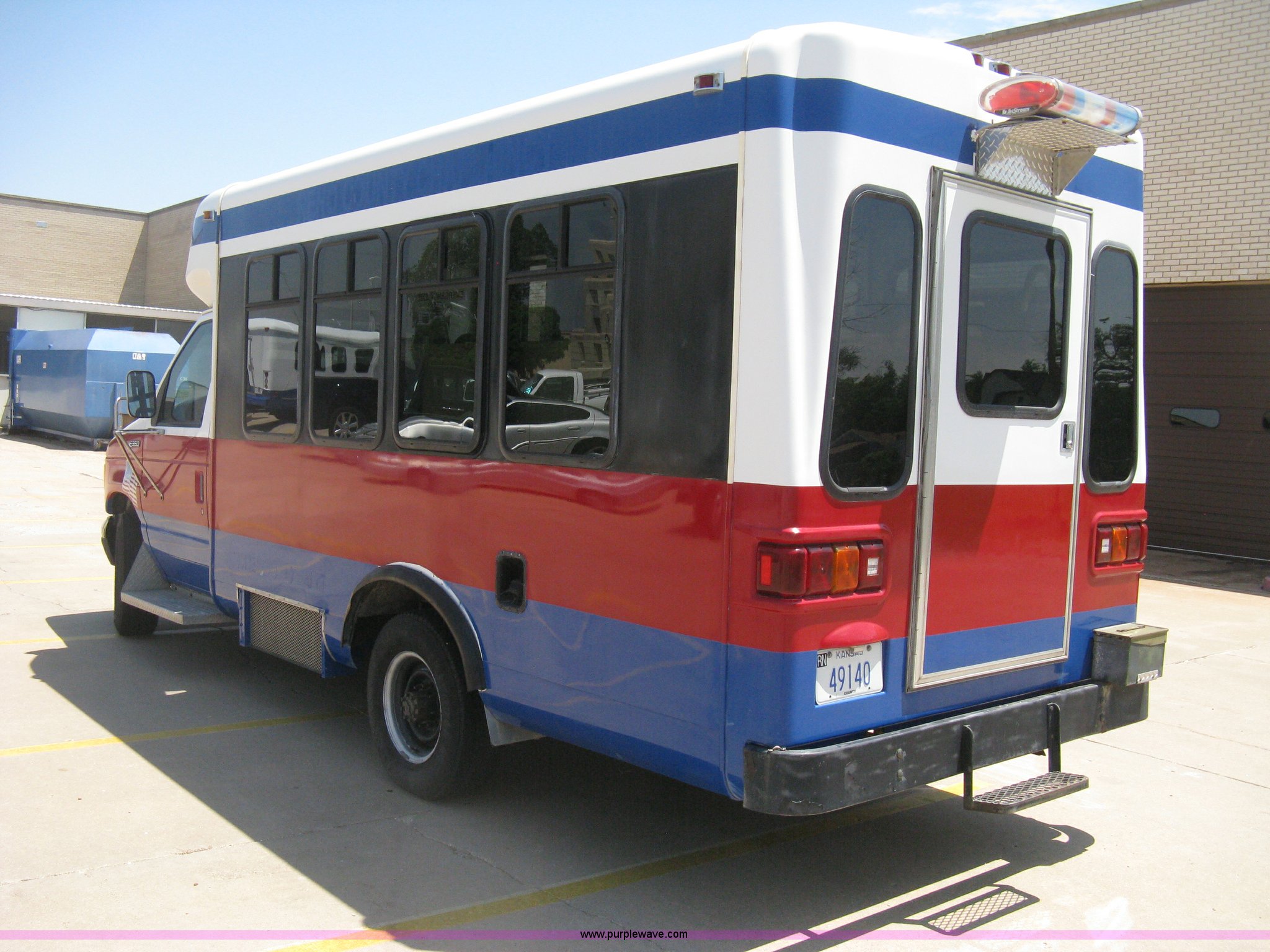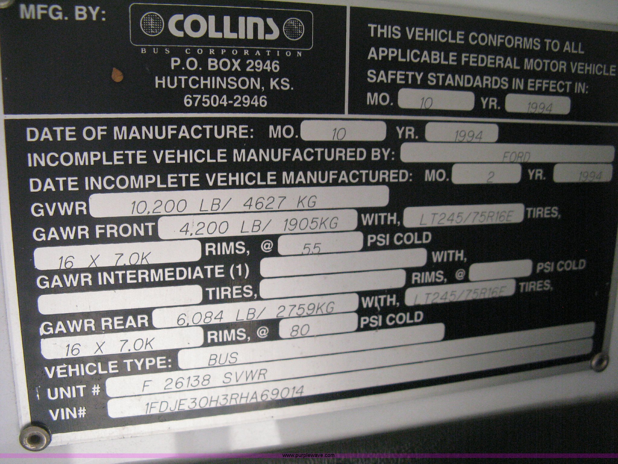 Purple Wave is selling a used Bus in Kansas. This item is a 1994 Ford E350 Collins transit bus with the following: 129,323 miles on odometer, 5.8L V8 OHV 16V gas engine, Automatic transmission, AC and heat, AC inoperable, Tilt, Cruise, AM/FM, Manual windows and locks, Vinyl interior, Power passenger door, Tinted passenger windows, Six passenger capacity, Wheel chair accessible, Wood storage cabinet, Rear emergency egress, Ricon wheel chair lift, Tethered remote, Emergency light bar, LT245/75R16 tires, GVWR 9,600 lbs, ABS light illuminated, Rust, Structural rust damage to bottom passenger entry door step, Driver's seat damaged, Service records available