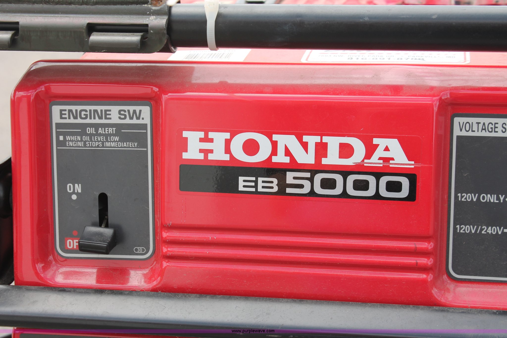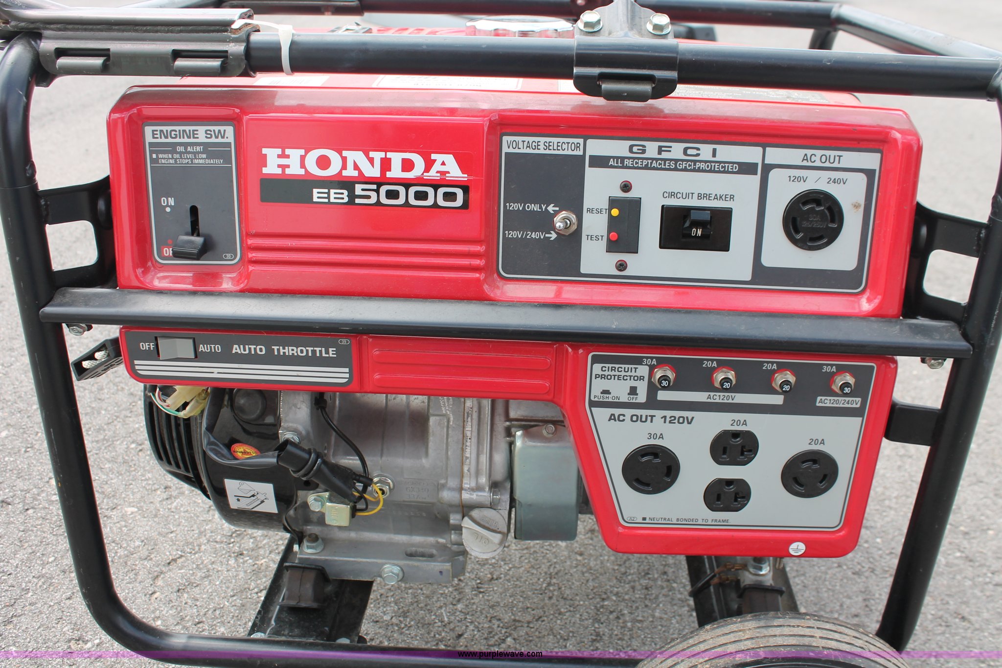 Honda EB5000 generator. Honda gas engine, (3) 120V 20 amp outlets, 120V 30 amp outlet, Voltage selector, Circuit protected, Auto throttle, 5.0 KVA, Serial EB5000XK1AG. Shipping quotes available. City of North Kansas City. North Kansas City, MO 64116