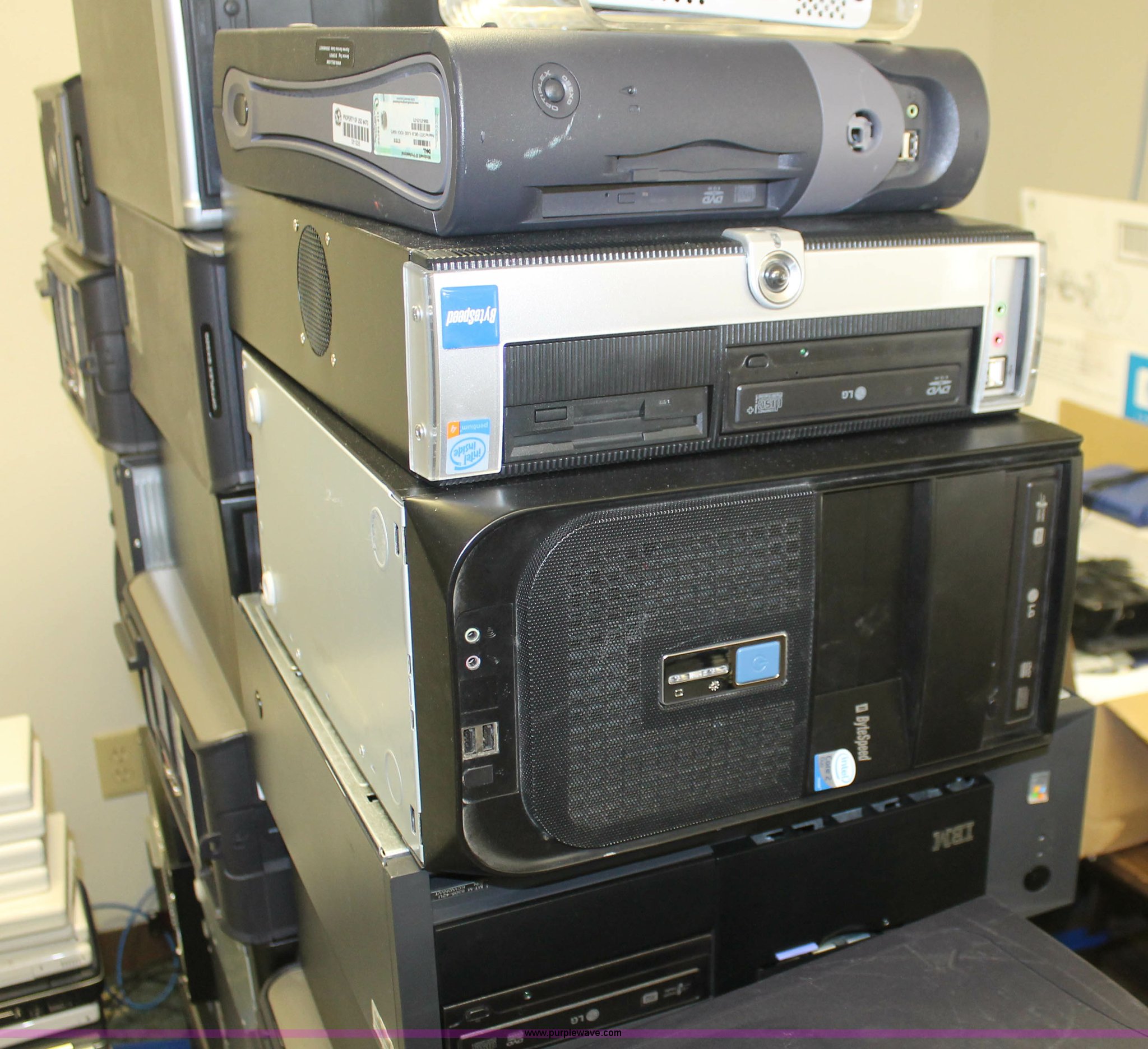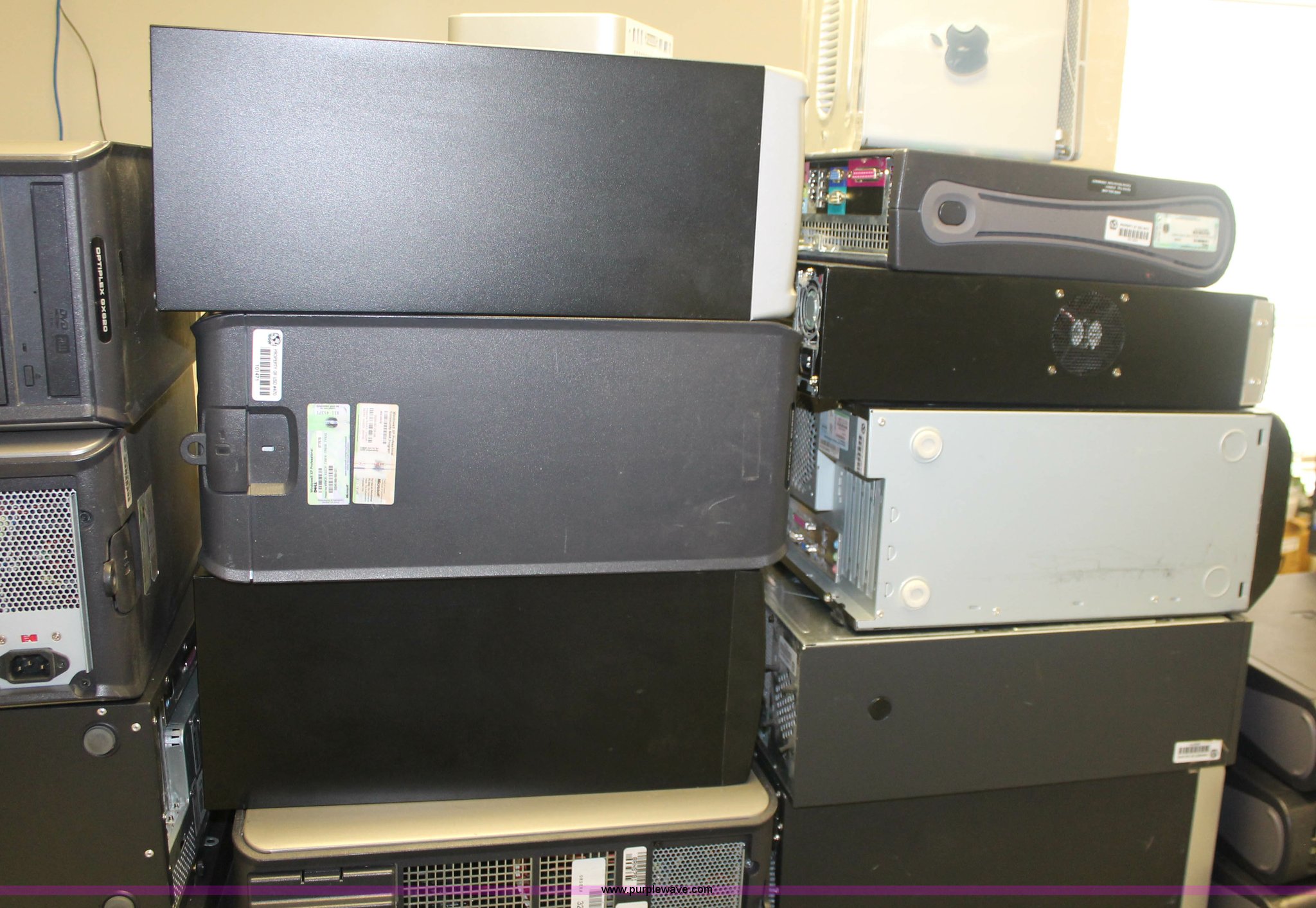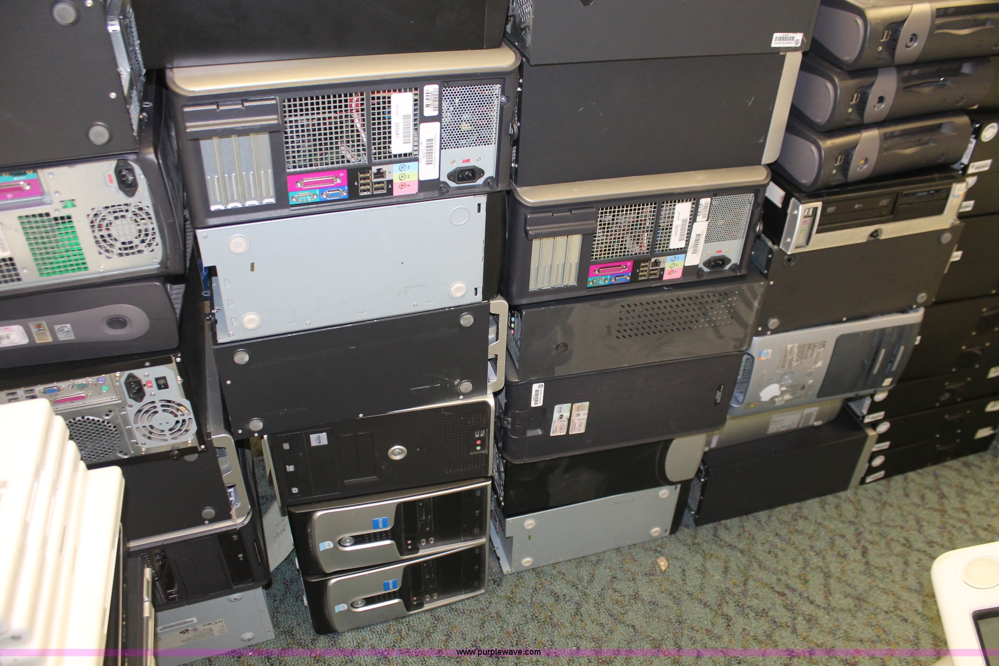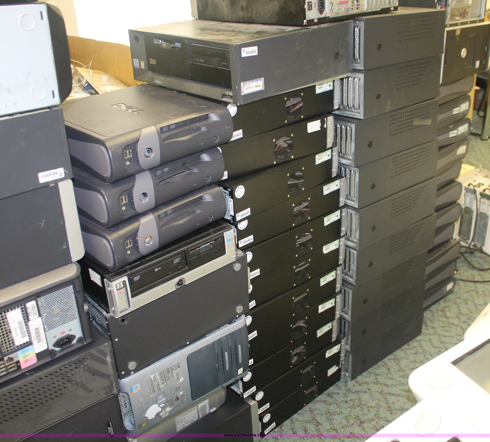 Purple Wave is selling a used Computers in Kansas. This item is a (75) assorted computer towers with the following: Brands include Dell, IBM, Powergistic, and more, Missing power cords, Unknown operating condition