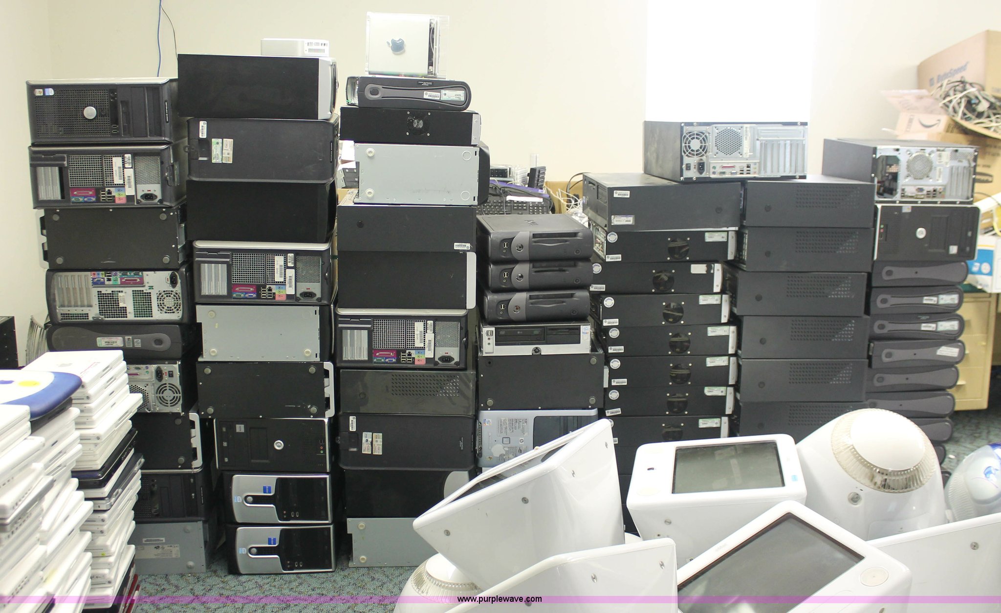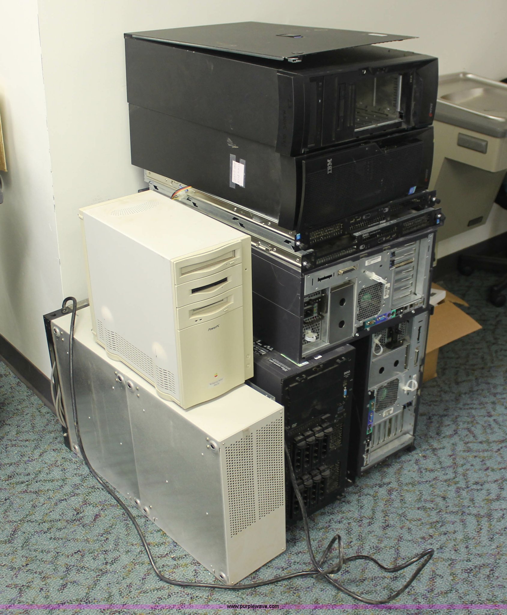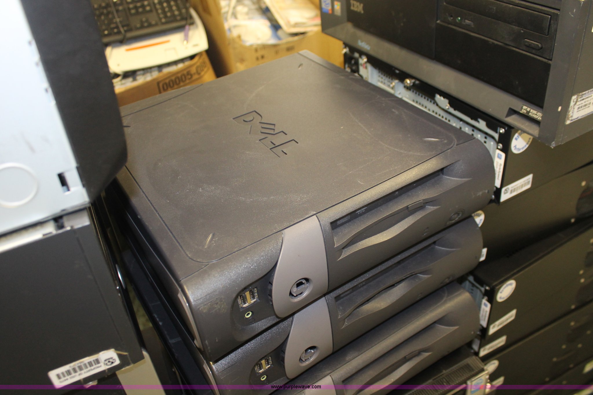 Purple Wave is selling a used Computers in Kansas. This item is a (75) assorted computer towers with the following: Brands include Dell, IBM, Powergistic, and more, Missing power cords, Unknown operating condition