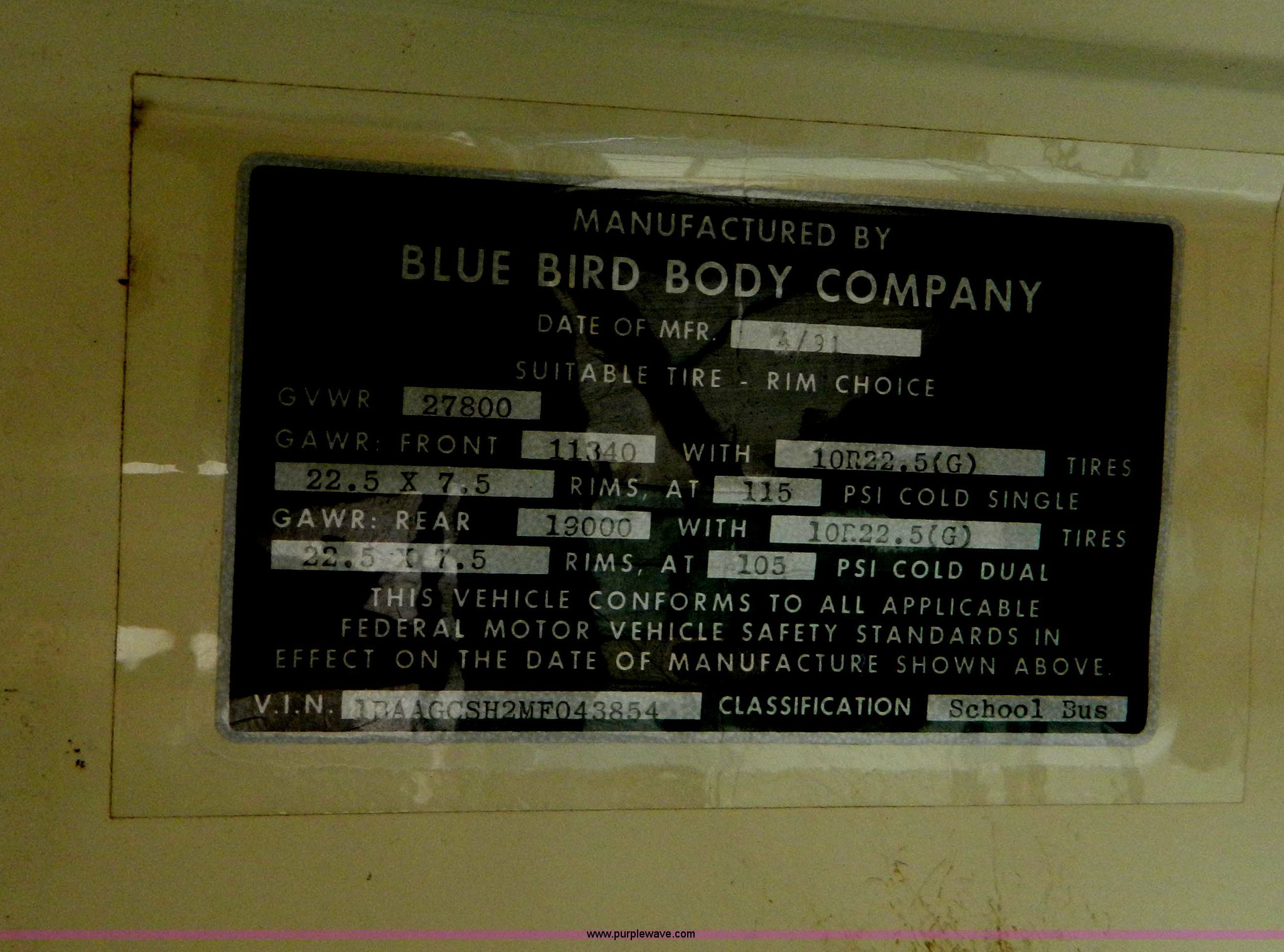 1991 Blue Bird TC2000 bus. 137,910 miles on odometer, 66 passenger, Cummins 6B5.9TA 5.9L L6 diesel engine Serial 44574231, Four speed automatic transmission, 4.44 axle ratio, 295/75R22.5 tires, GVWR 27,800 lbs, Cosmetic damage, Some seat covers not intact, Body No. F97346. 1BAAGCSH2MF043854. Shipping quotes available. 508 Main. Hays, KS 67601