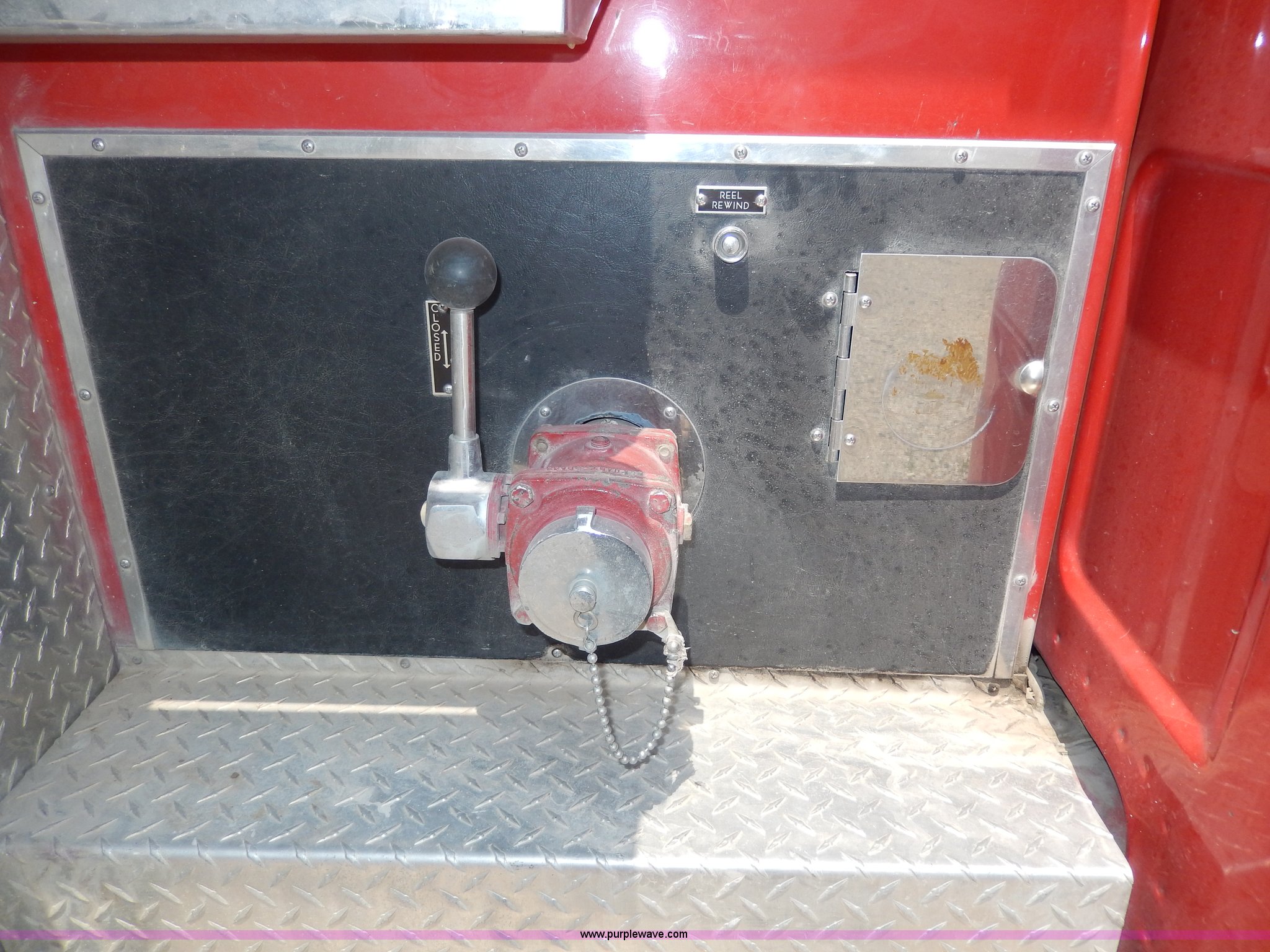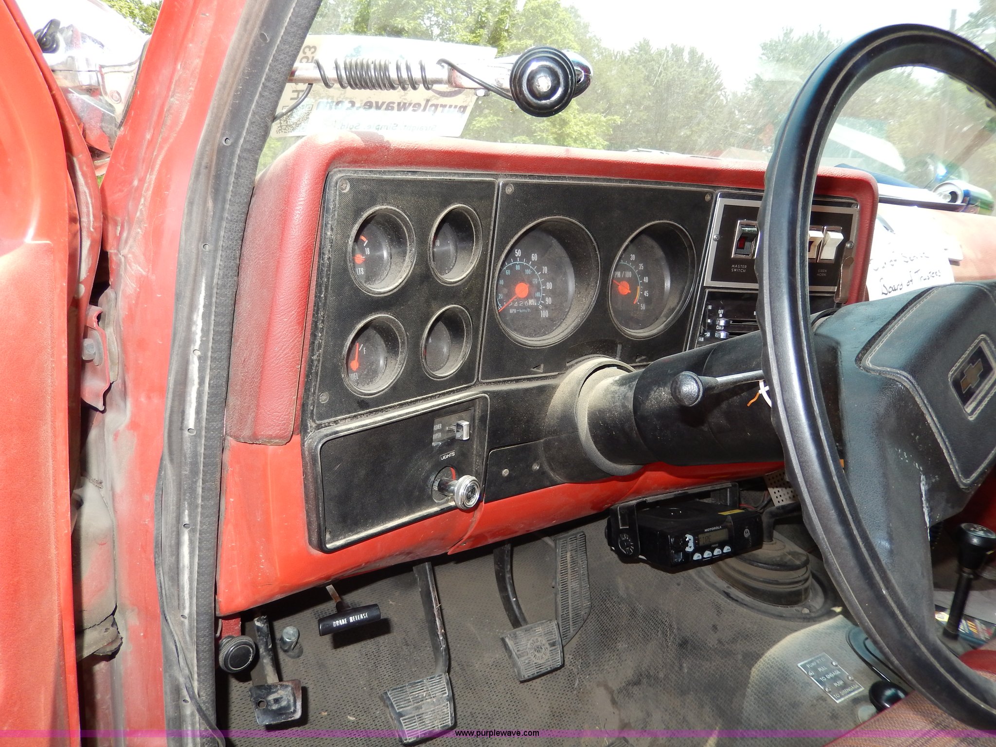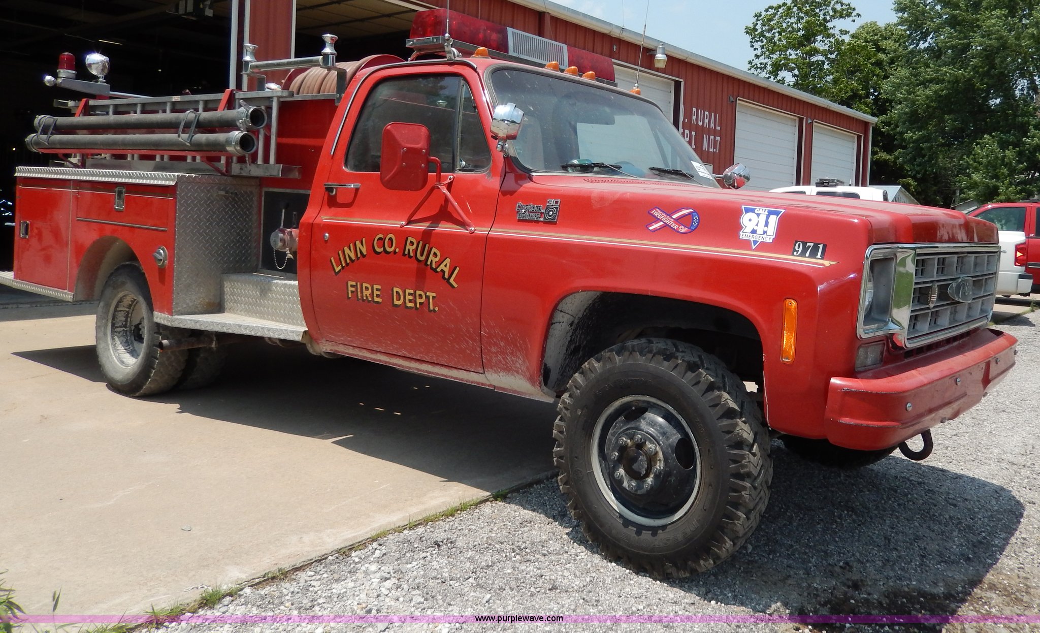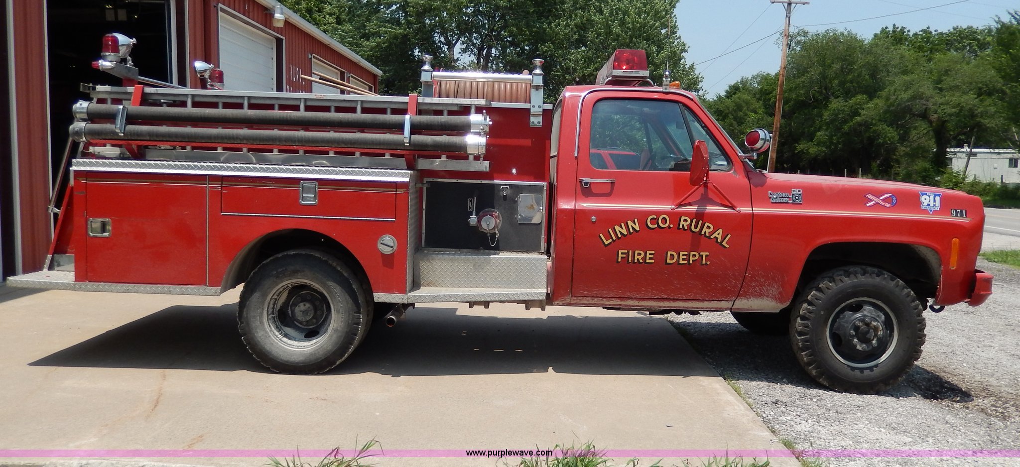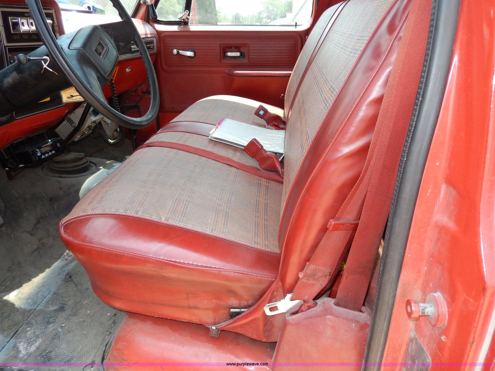 Purple Wave is selling a used Passenger Vehicle in Kansas. This item is a 1978 Chevrolet Custom Deluxe 30 mini pumper firetruck with the following: 112,426 miles on odometer, V8 gas engine, Four speed manual transmission, Four wheel drive, Heat, Manual windows and locks, Vinyl interior, Pierce CPK-3 water system, 400 gpm, 1,000 psig hydro, 600 psig discharge, Serial 54173, (2) 8'L x 4" diameter suction hoses, Hose reel and hose, 7.50-16 tires, Contents are not included, Radio is not included
