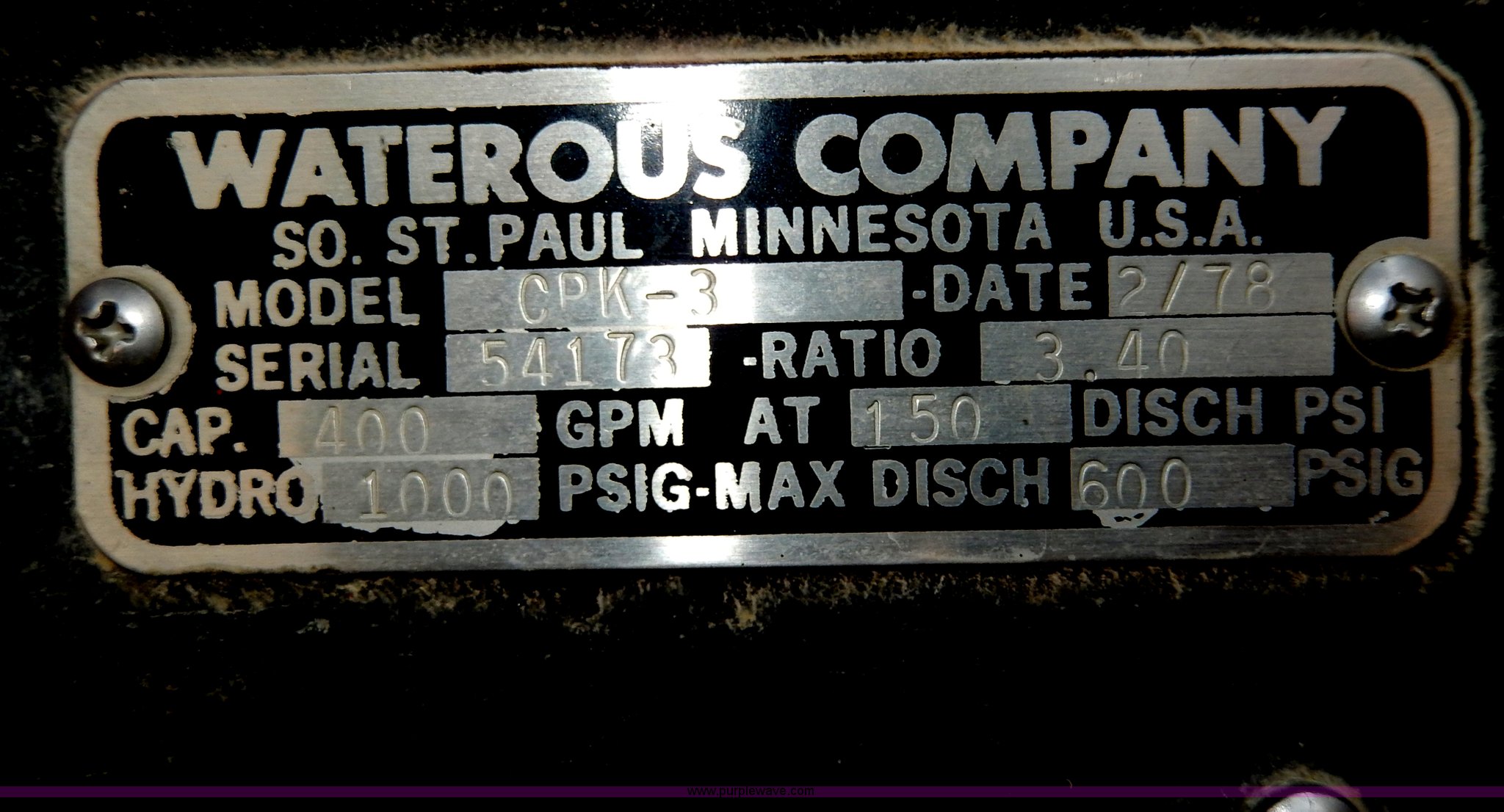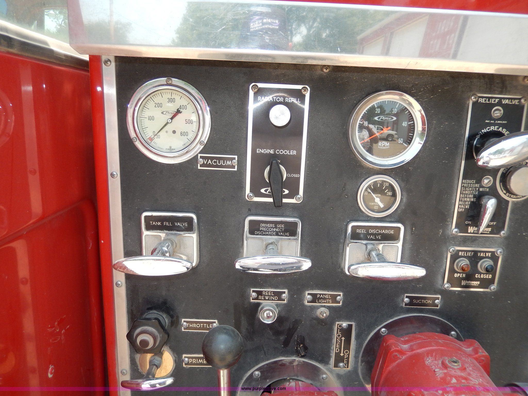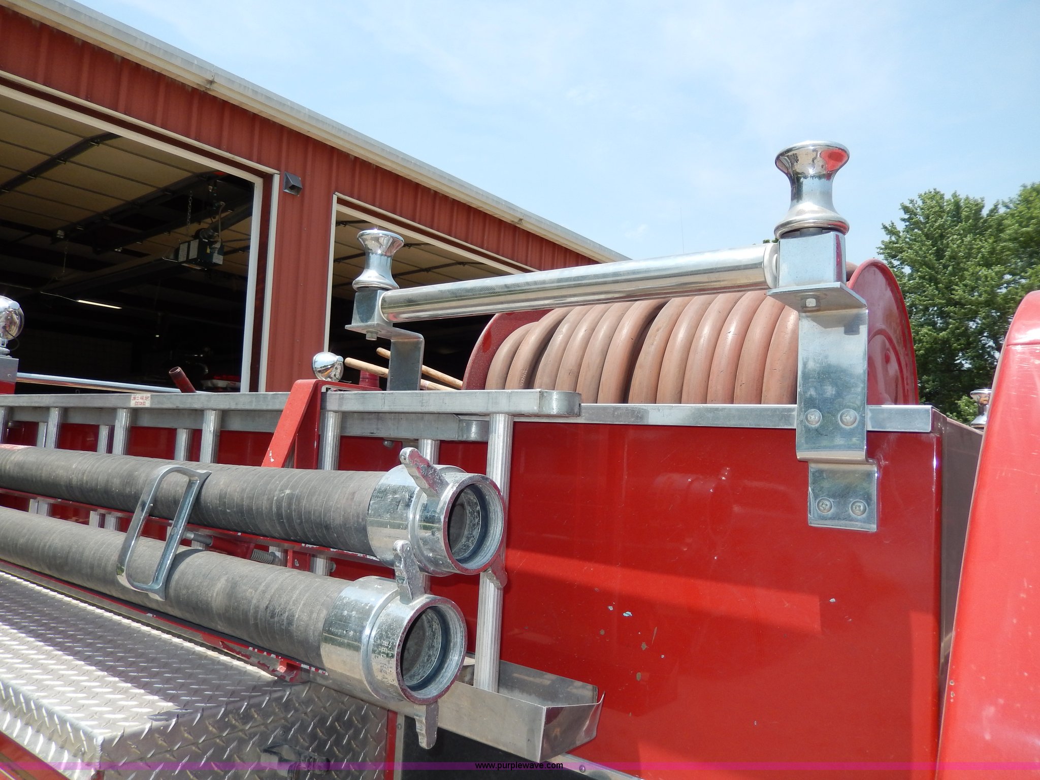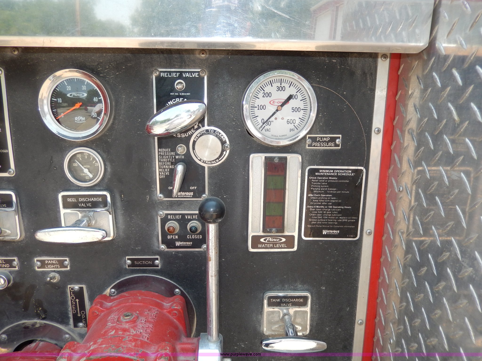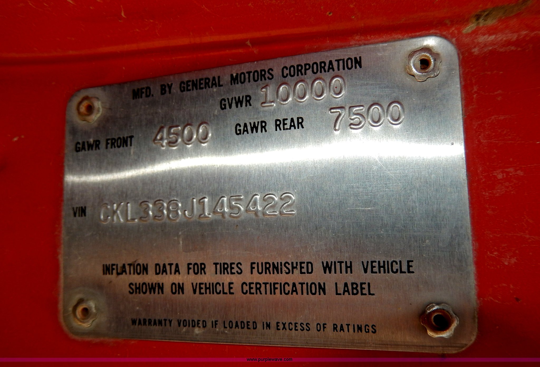 Purple Wave is selling a used Passenger Vehicle in Kansas. This item is a 1978 Chevrolet Custom Deluxe 30 mini pumper firetruck with the following: 112,426 miles on odometer, V8 gas engine, Four speed manual transmission, Four wheel drive, Heat, Manual windows and locks, Vinyl interior, Pierce CPK-3 water system, 400 gpm, 1,000 psig hydro, 600 psig discharge, Serial 54173, (2) 8'L x 4" diameter suction hoses, Hose reel and hose, 7.50-16 tires, Contents are not included, Radio is not included