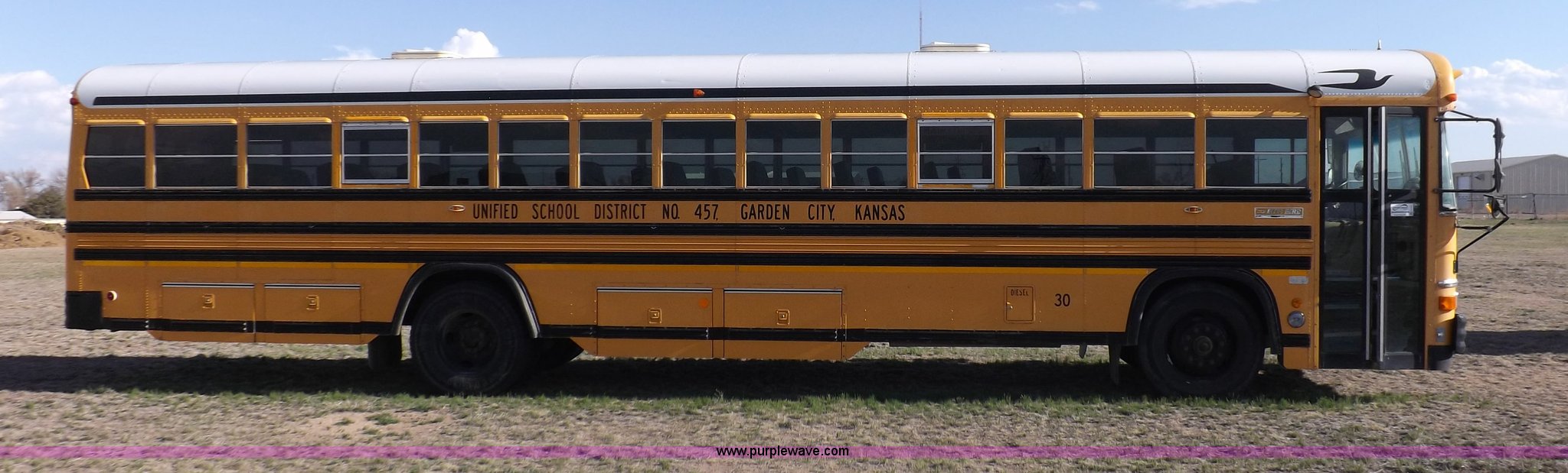1997 Blue Bird school bus. 188,405 miles on odometer, 56 passenger, Caterpillar 3116 6.6L L6 diesel engine, Automatic transmission, Heat, Tilt, AM/FM/cassette, Air suspension seat, Heated mirrors, Block heater, (2) roof emergency egress, Rear emergency egress, Front fender mirrors, Rear tow hooks, (4) storage compartments per side, Spring suspension, Air brakes, 244" wheelbase, 11R22.5 tires, GVWR 36,200 lbs, FAWR 13,200 lbs, RAWR 23,000 lbs, Radio equipment is not included, Unit# 30. 1BABMCBA5VF075408. Shipping quotes available. USD 457. 4665 E Highway 50. Garden City, KS 67846