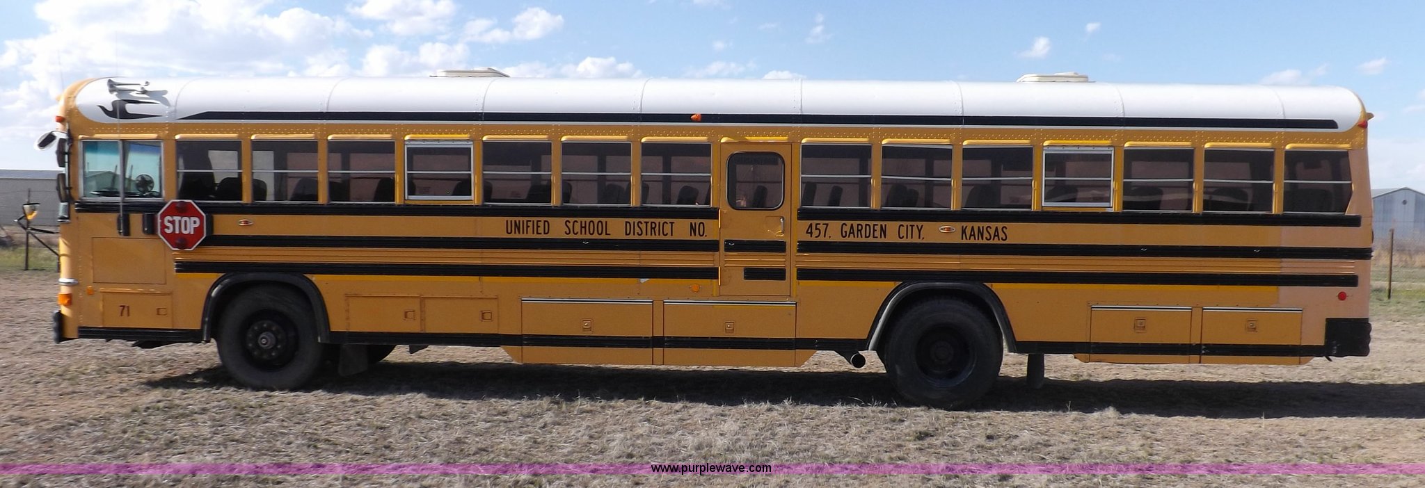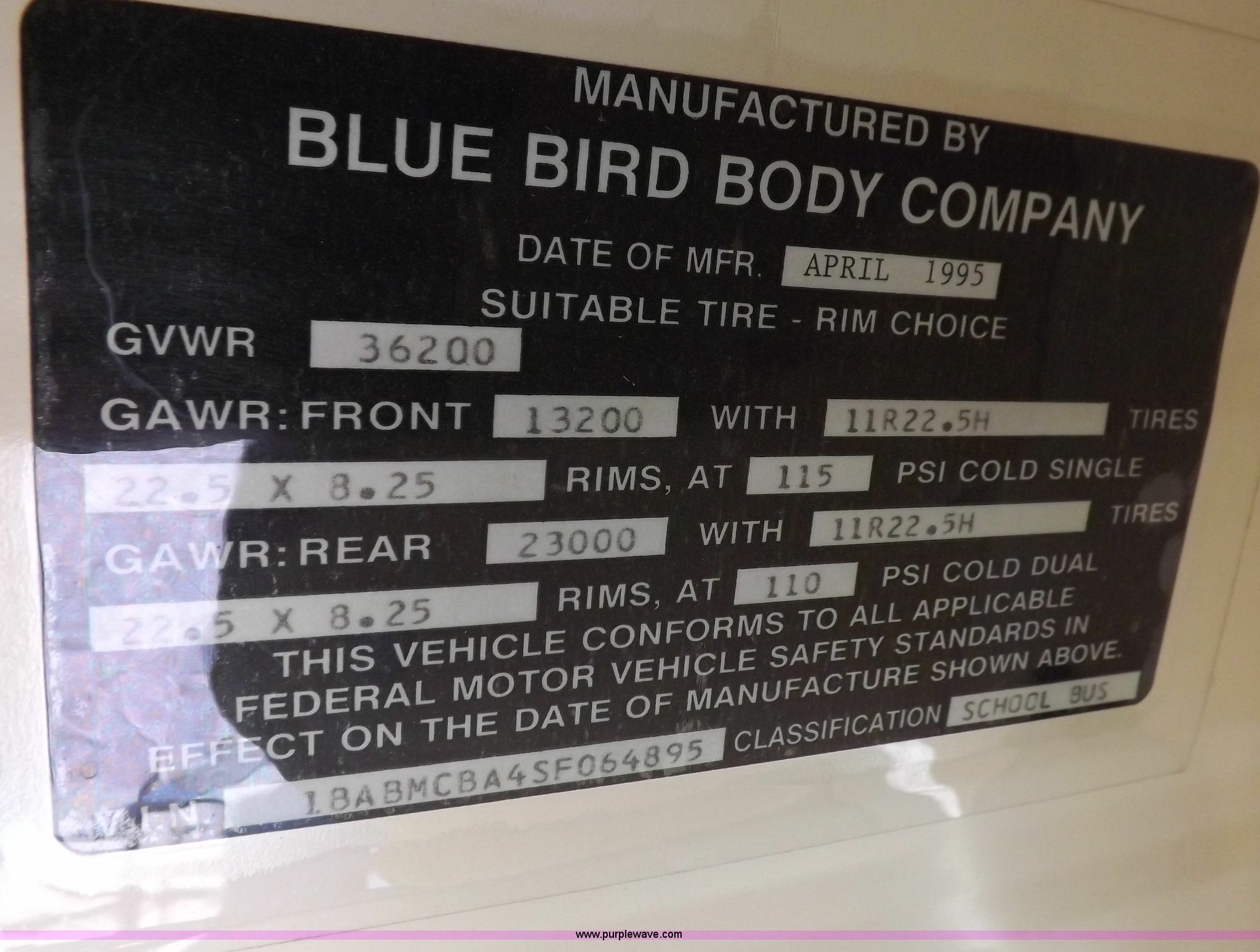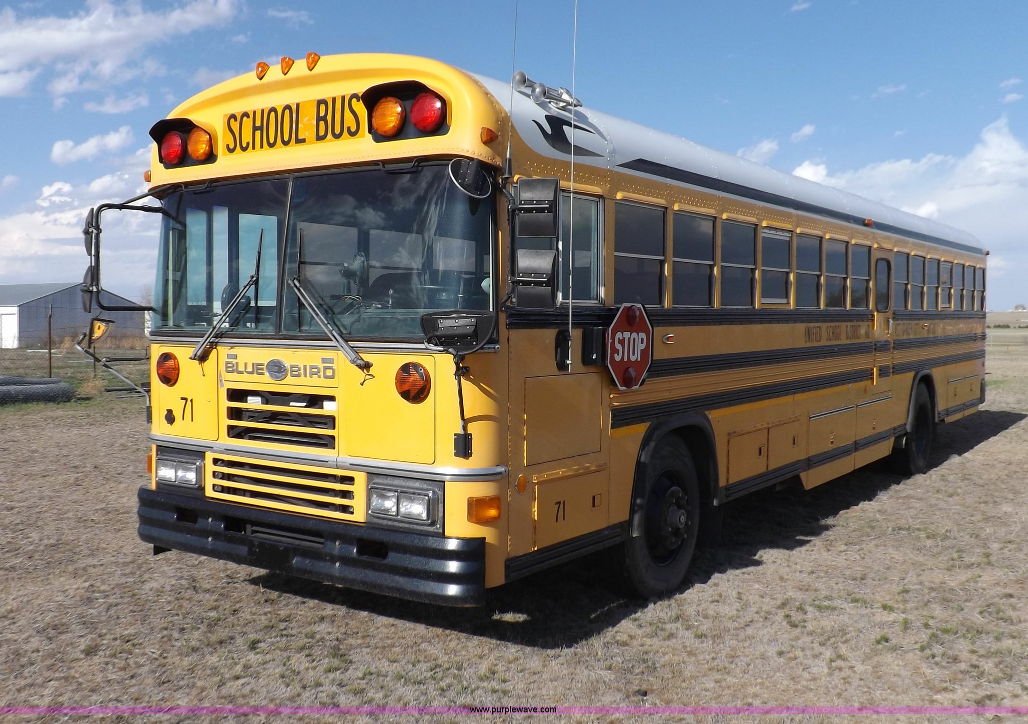 Purple Wave is selling a used Bus in Kansas. This item is a 1995 Blue Bird school bus with the following: 224,978 miles on odometer, 52 passenger, Caterpillar 3116 6.6L L6 diesel engine, Automatic transmission, Heat, Tilt, AM/FM/CD, Air suspension seat, Heated mirrors, Block heater, (2) roof emergency egress, Rear emergency egress, Exterior light monitor, Front fender mirrors, Rear tow hooks, (8) storage compartments per side, Air suspension, Air brakes, 244" wheelbase, 11R22.5 tires, GVWR 36,200 lbs, FAWR 13,200 lbs, RAWR 23,000 lbs, Radio equipment is not included, Unit# 71