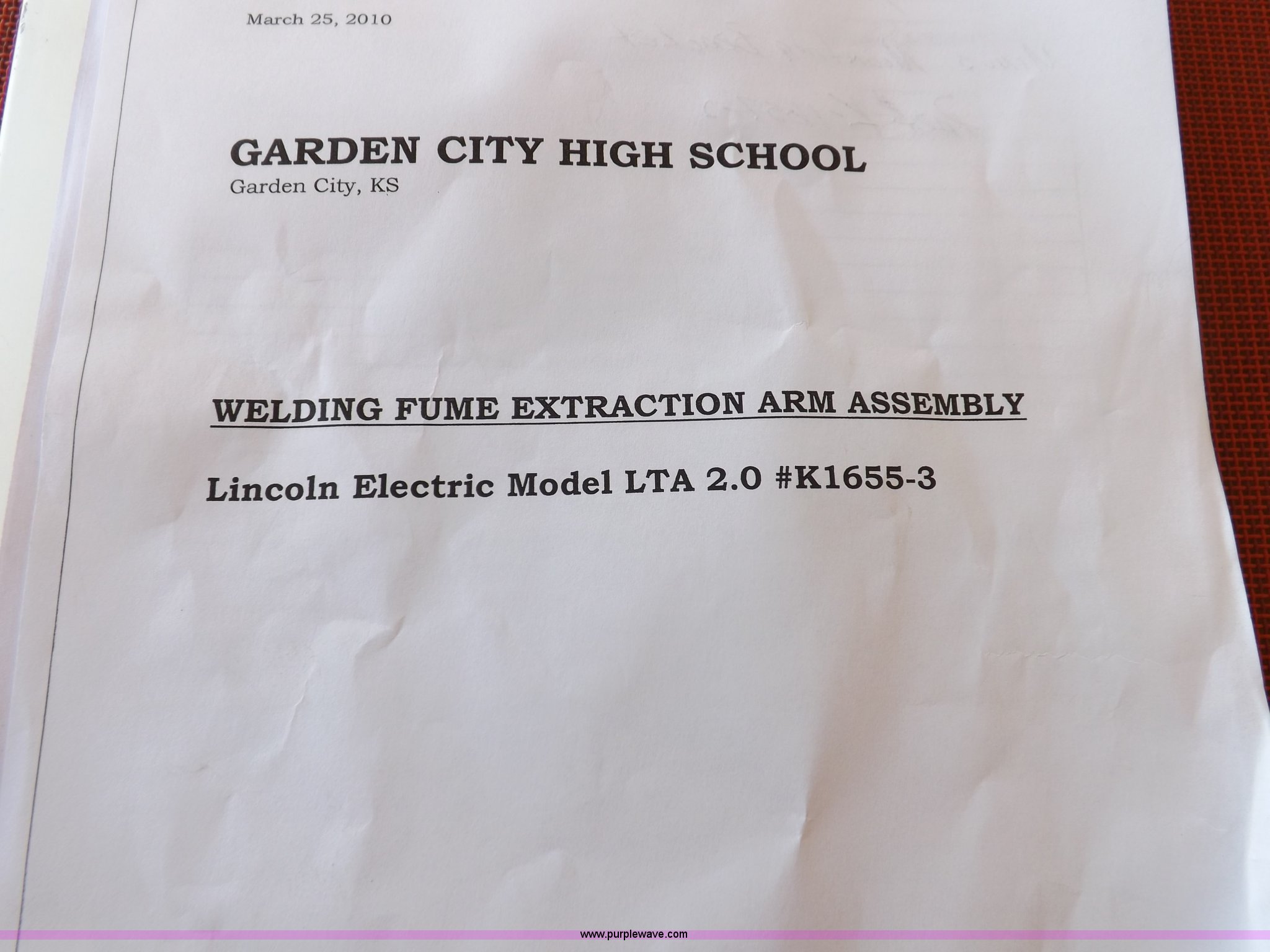 Purple Wave is selling a used Welder (Manual) in Kansas. This item is a Lincoln Electric welding fume extraction arm assembly with the following: Model 2.0, Serial K1655-3