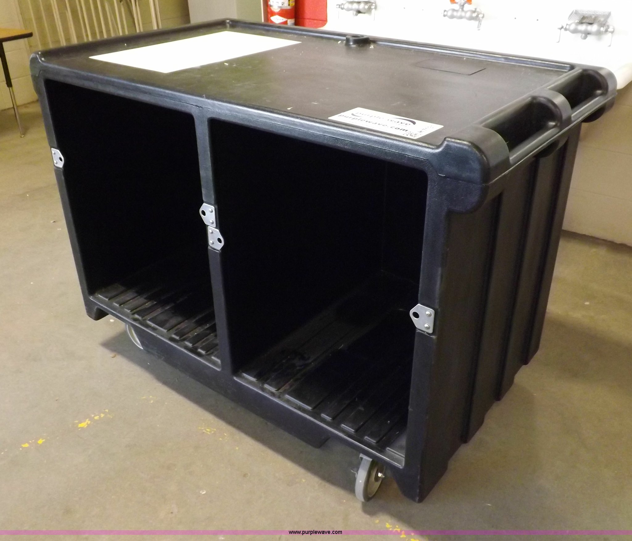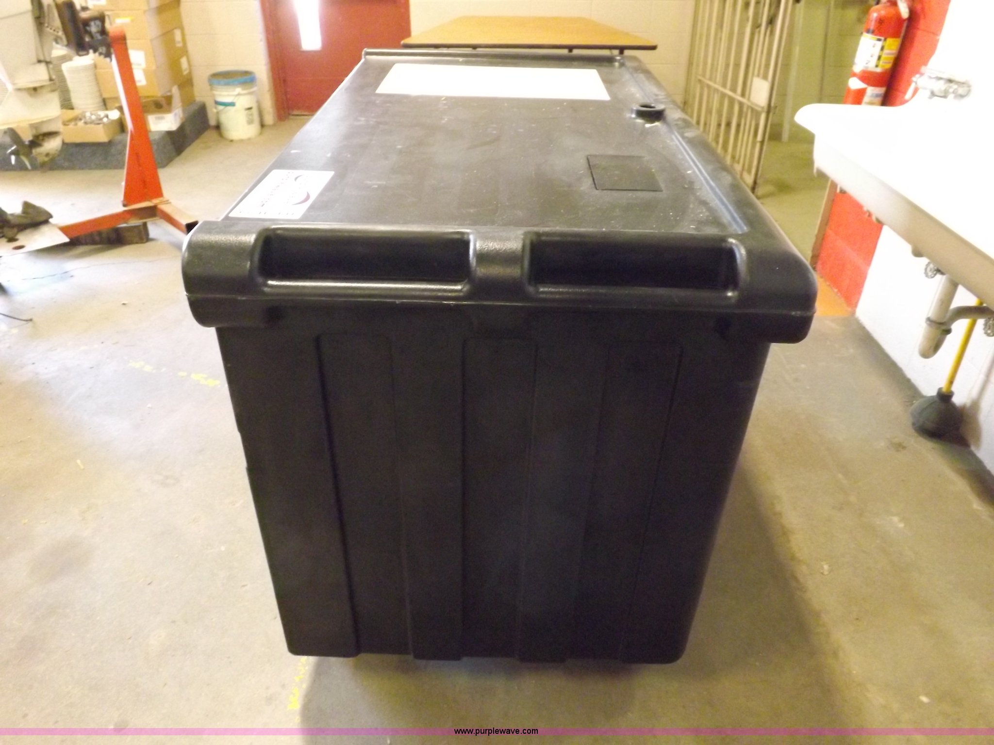 Purple Wave is selling a used Restaurant Equip. in Kansas. This item is a Food service cart with the following: Hot or cold, 55"W x 30"D x 39"H, Molded poly construction, Two compartments, 6" casters, Doors missing