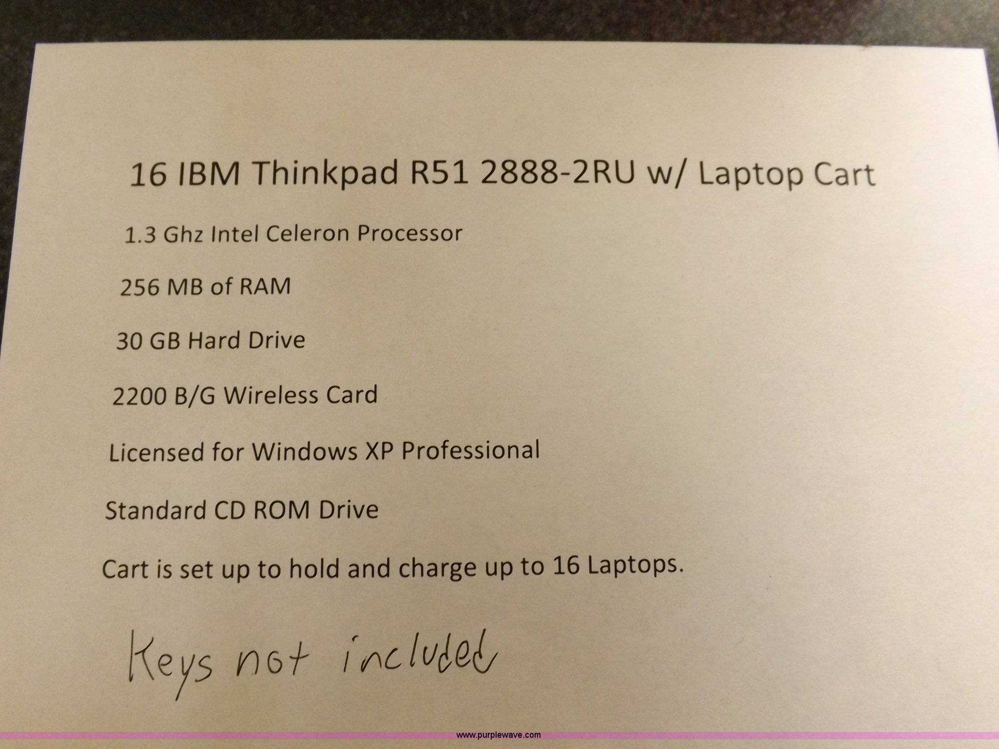 (16) computers. Model R512888-2RU, Intel Celeron 1.3 GHz processor, 256 MB RAM, 30 GB HDD, B/G 2200 wireless card, CD ROM, Cart will hold 16 laptops Charging capacity, No keys. Shipping quotes available. USD 457. 4665 E Highway 50. Garden City, KS 67846