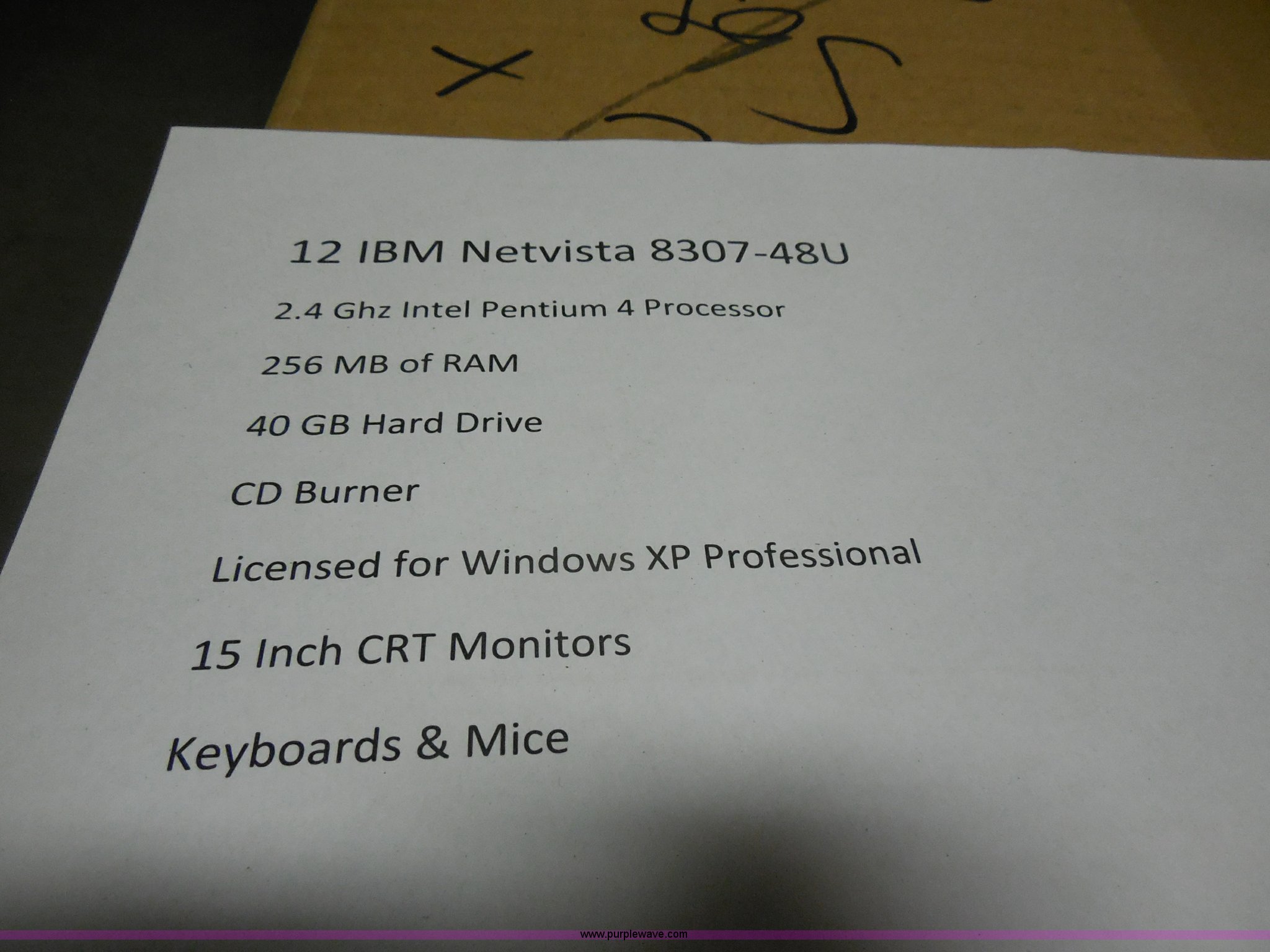 (12) IBM Netvista 8307-480 computers. Intel Pentium 4 2.4 GHz processor, 256 MB RAM, 40 GB HDD, CD burner, 15" CRT monitor, Keyboard, Mouse, Licensed for Windows XP Professional. Shipping quotes available. USD 457. 4665 E Highway 50. Garden City, KS 67846