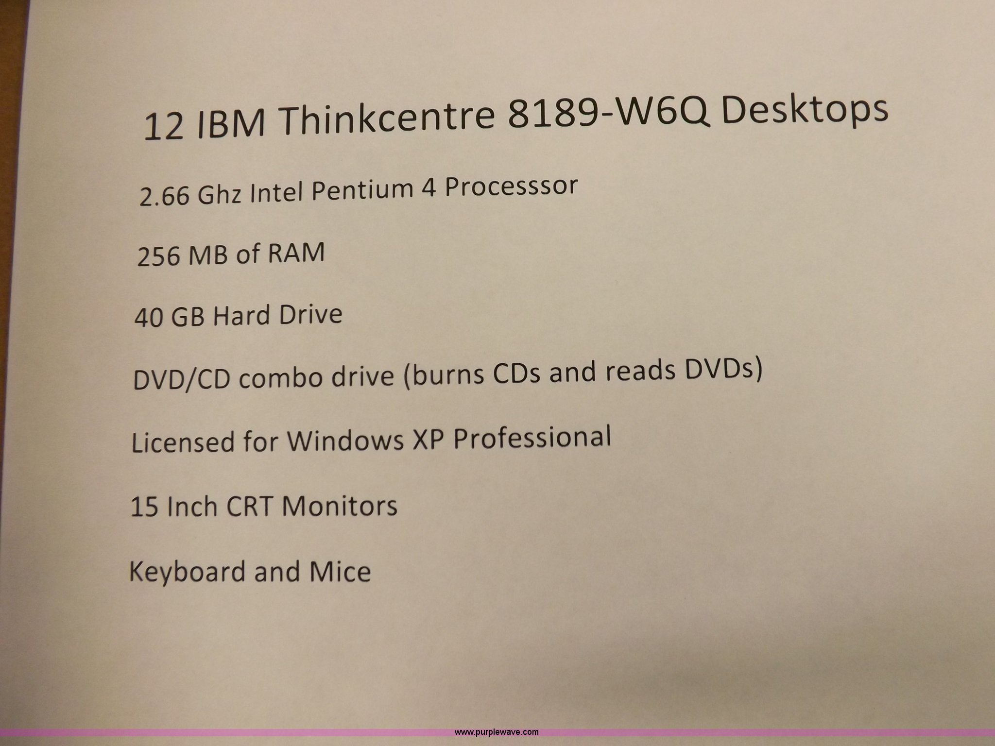 Purple Wave is selling a used Computers in Kansas. This item is a (12) IBM Thinkcenter 8189-W6Q desktop computers with the following: Intel Pentium 4 2.6 GHz processor, 256 MB RAM, 40 GB HDD, DVD/CD combination drive, 15" CRT monitor, Keyboard, Mouse, Licensed for Windows XP Professional