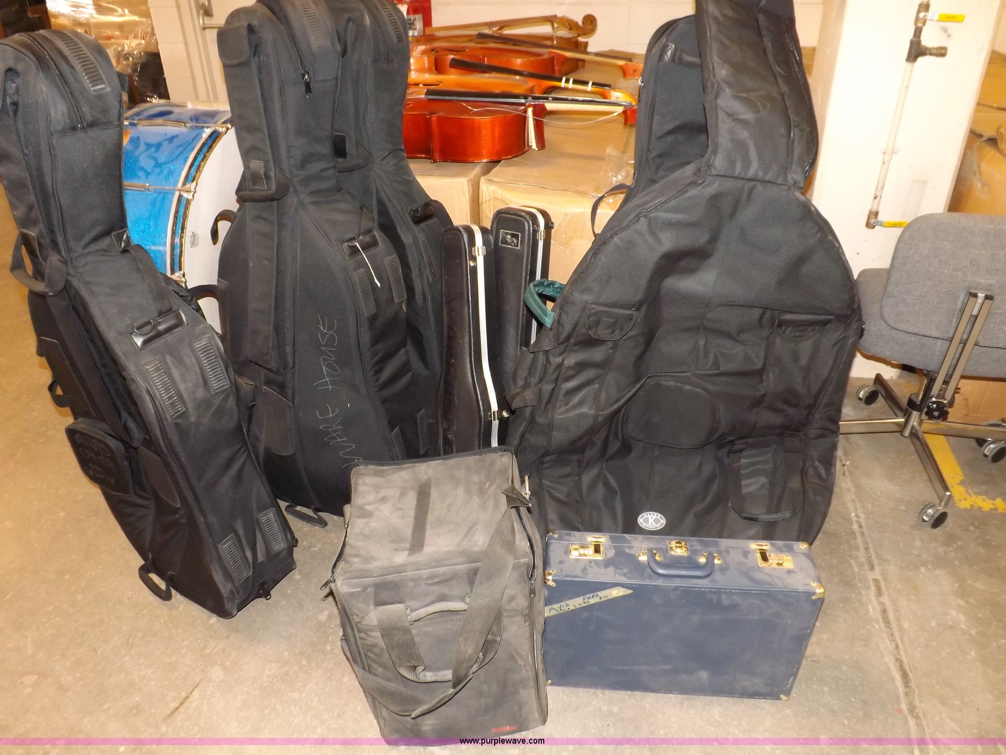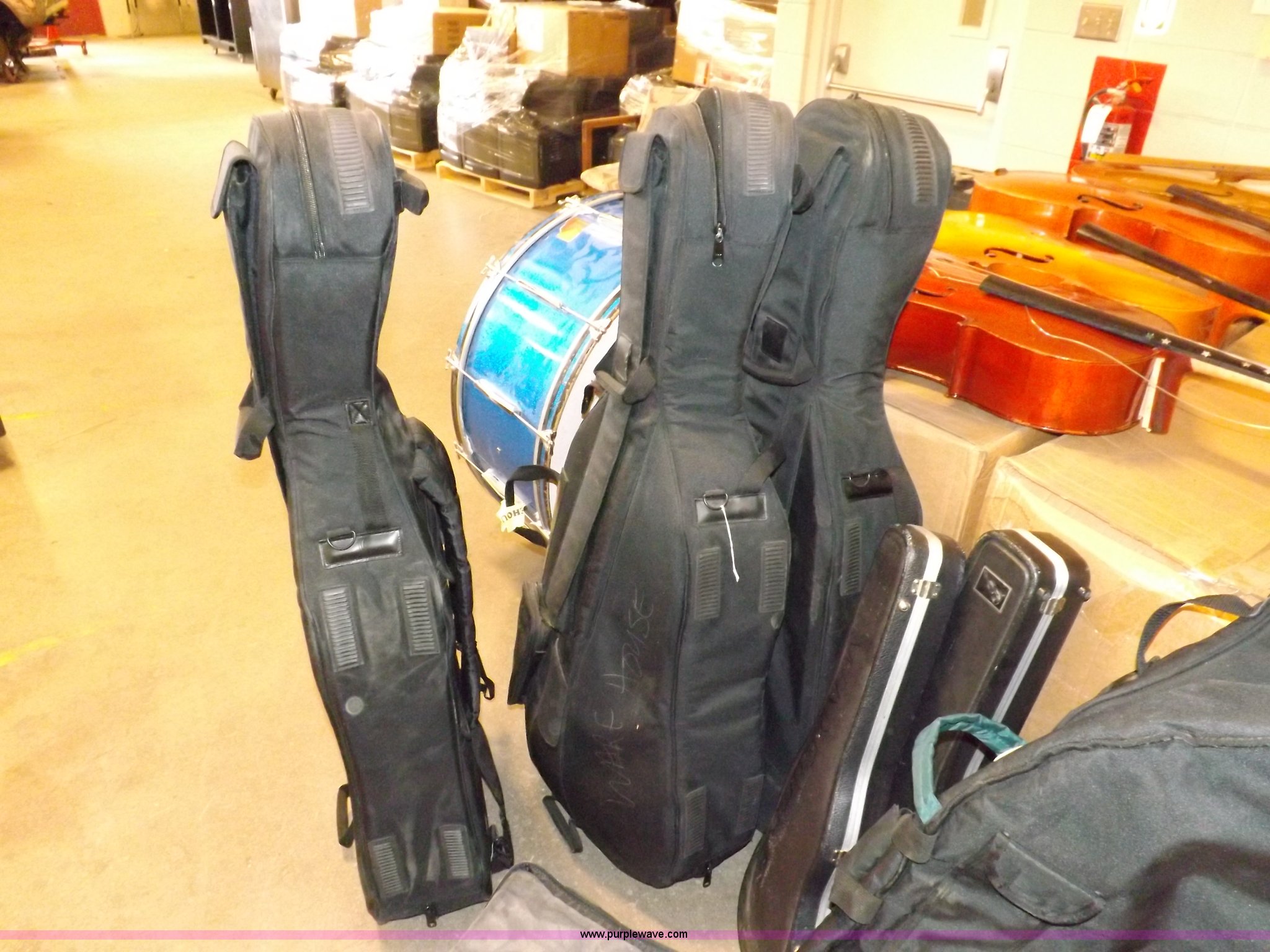 Purple Wave is selling a used Music Equip. in Kansas. This item is a Assorted musical instruments with the following: (2) drums, (4) cellos, Damaged, Xylophone, Damaged, (10) instrument cases