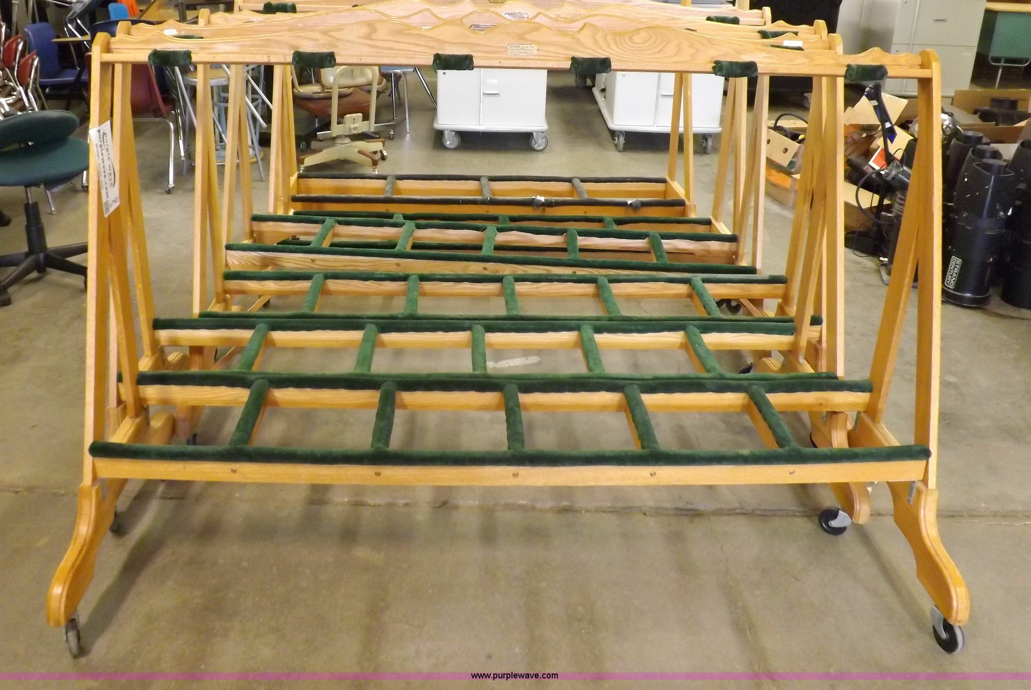 Purple Wave is selling a used Music Equip. in Kansas. This item is a (6) Sherrard musical instrument racks with the following: (4) six instrument capacity, 74"W x 50"H, (2) four instrument capacity, 74"W x 59"H, Felt covered, 3" casters