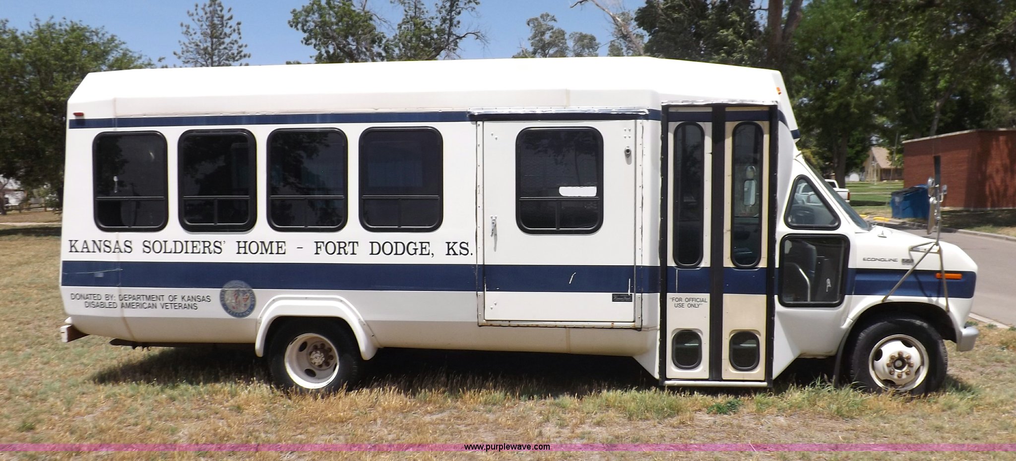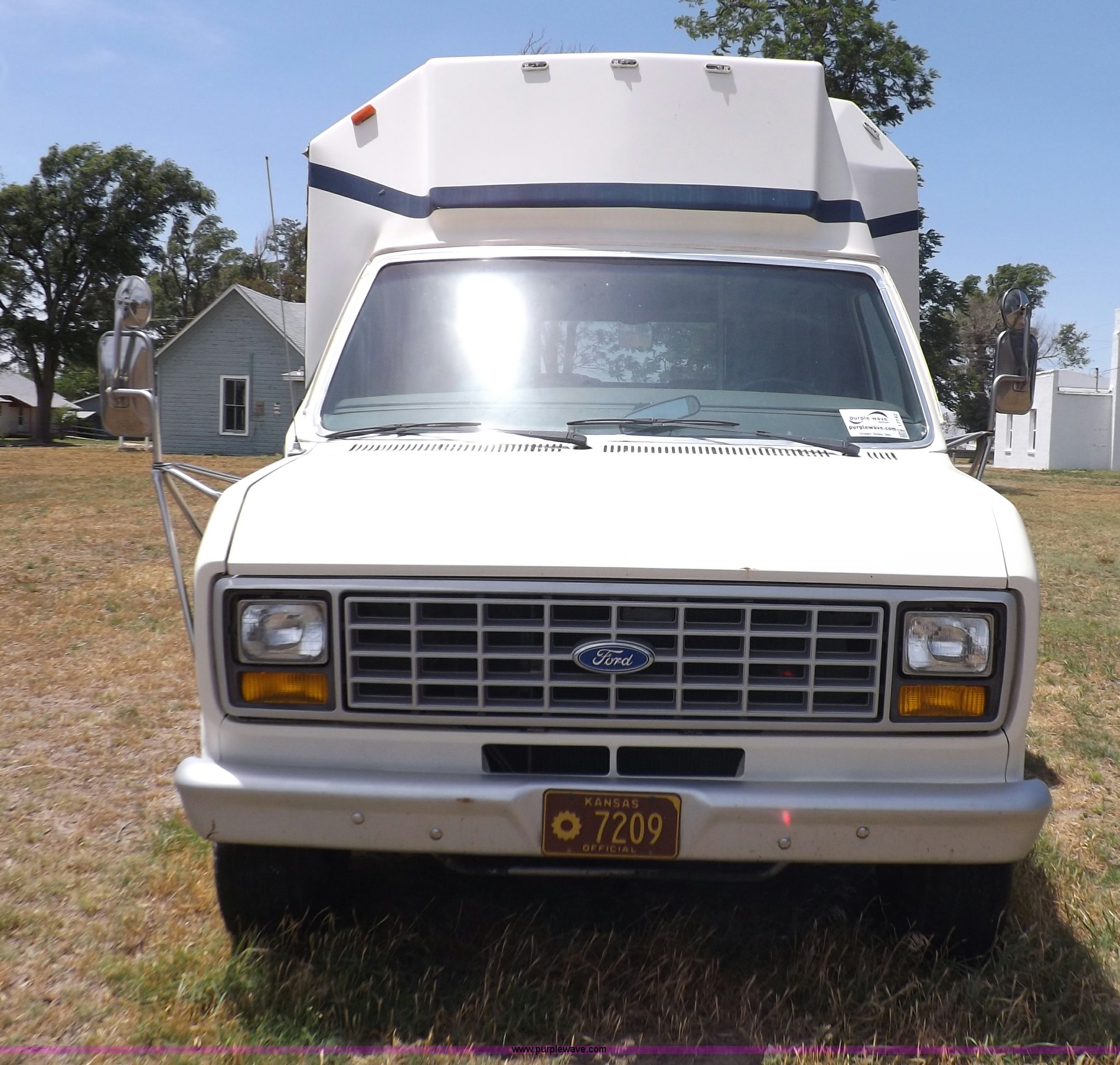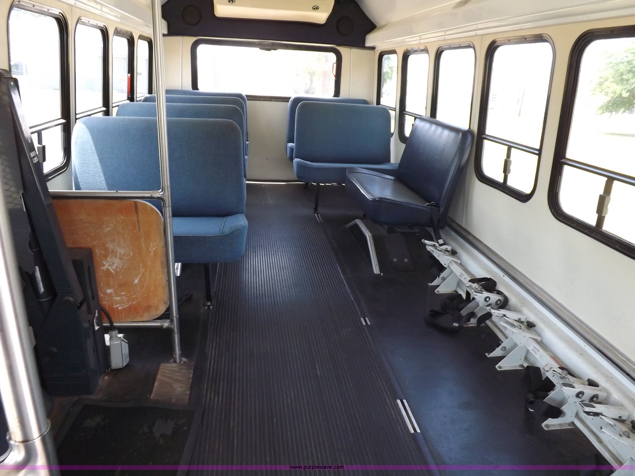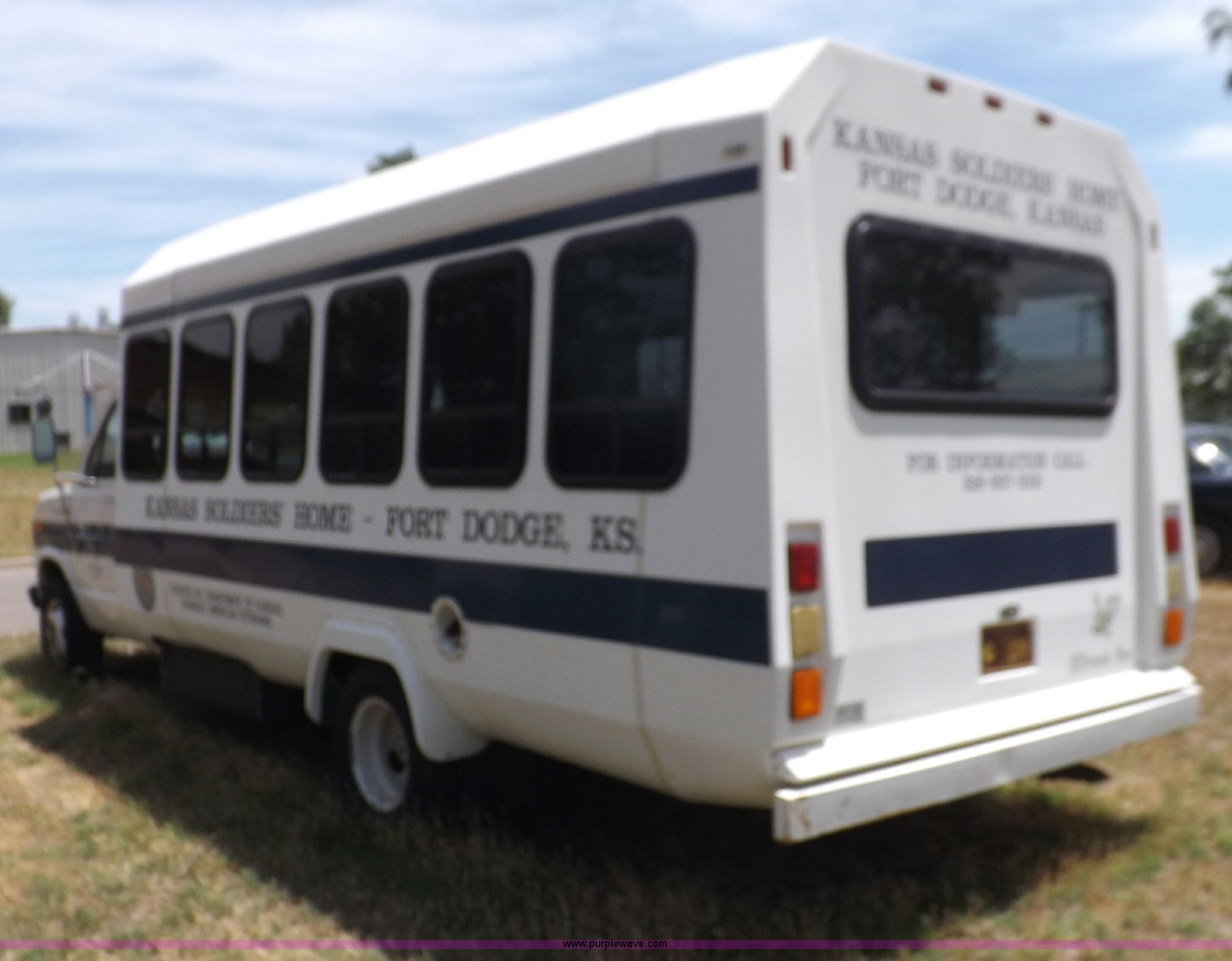 Purple Wave is selling a used Bus in Kansas. This item is a 1990 Ford Econoline E350 bus with the following: 60,041 miles on odometer, 7.5L V8 OHV 16V gas engine, Automatic transmission, AC and heat, AM, Manual windows and locks, Cloth interior, Ricon wheelchair lift, Two emergency egress, El Dorado bus package, 215/65R16 tires, Hail damage, Driver's door and fender damage