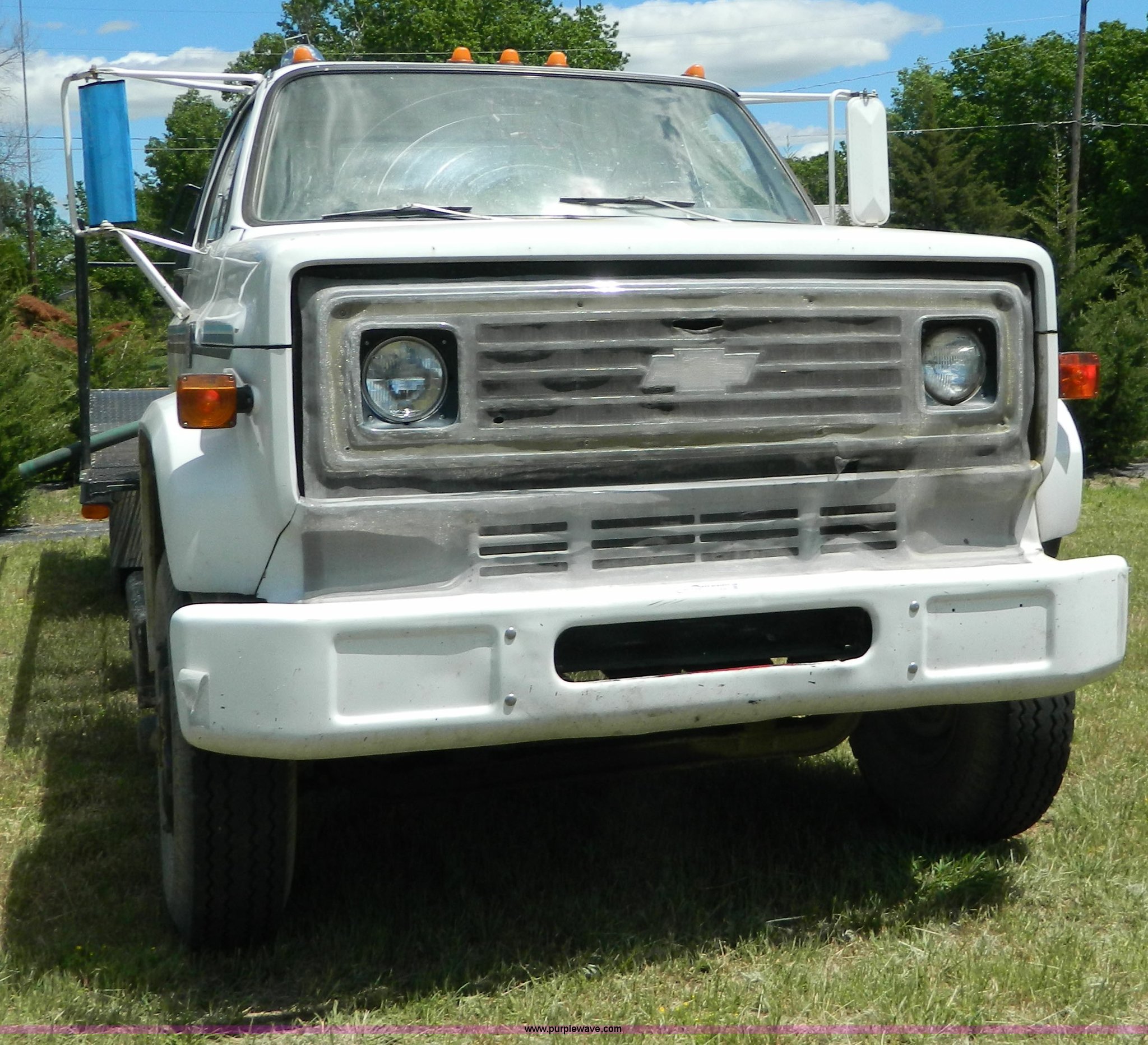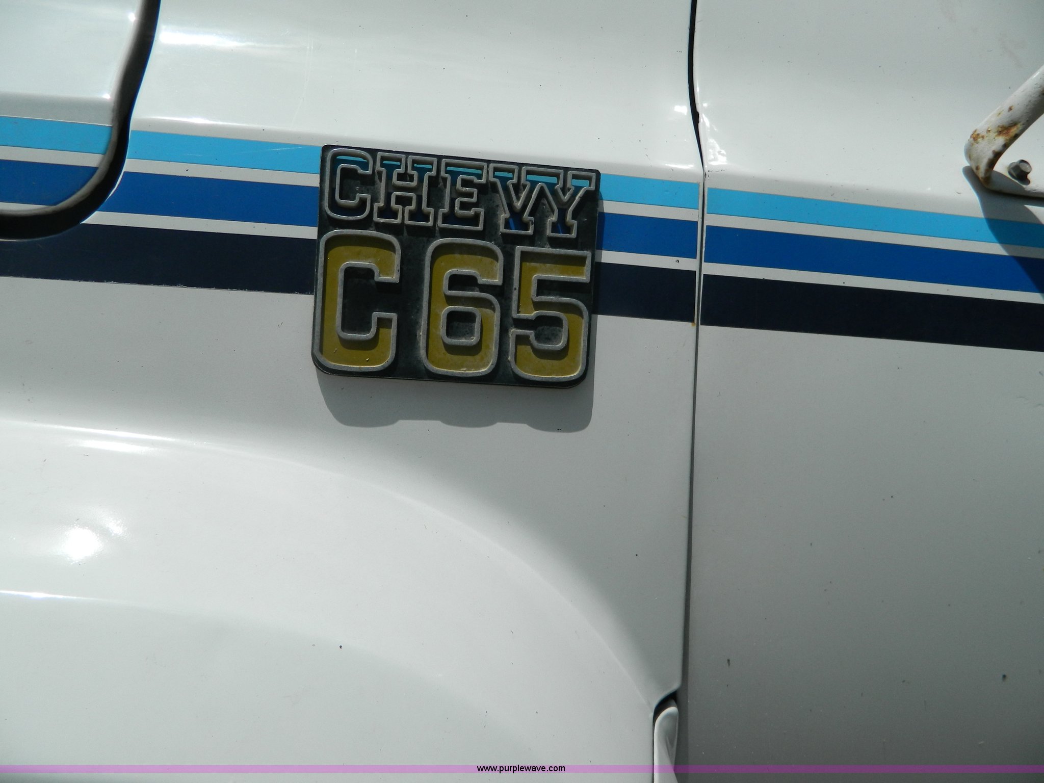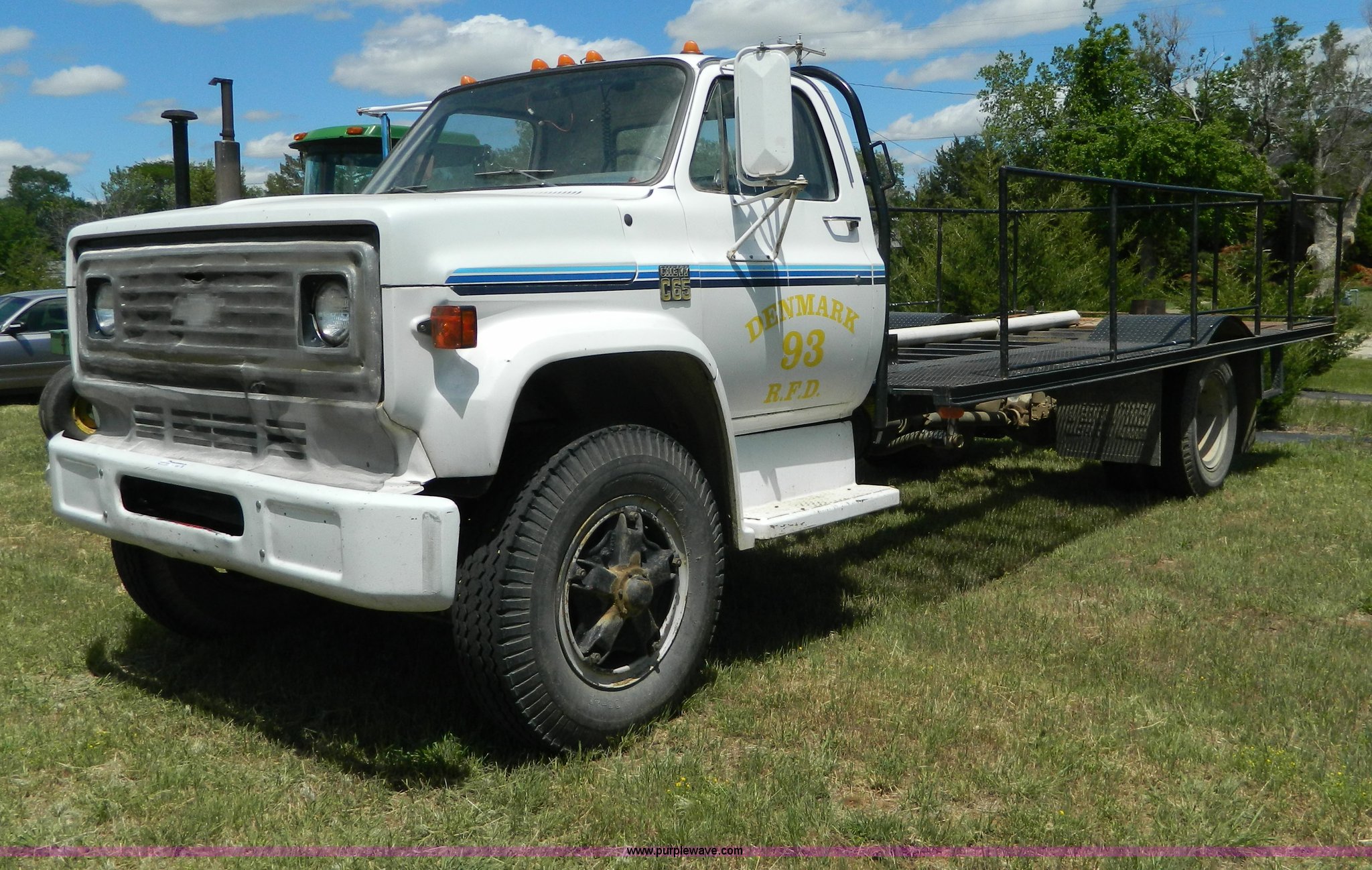 Purple Wave is selling a used Flat Bed Truck in Kansas. This item is a 1975 Chevrolet C65 with the following: 33,335 miles on odometer, 366 cu. in. V8 gas engine, Five speed manual transmission, Two speed rear end, Micro brake, Heat, PTO, 19' x 102" flatbed, 203" wheelbase, 9.00-20 tires, Windshield cracked