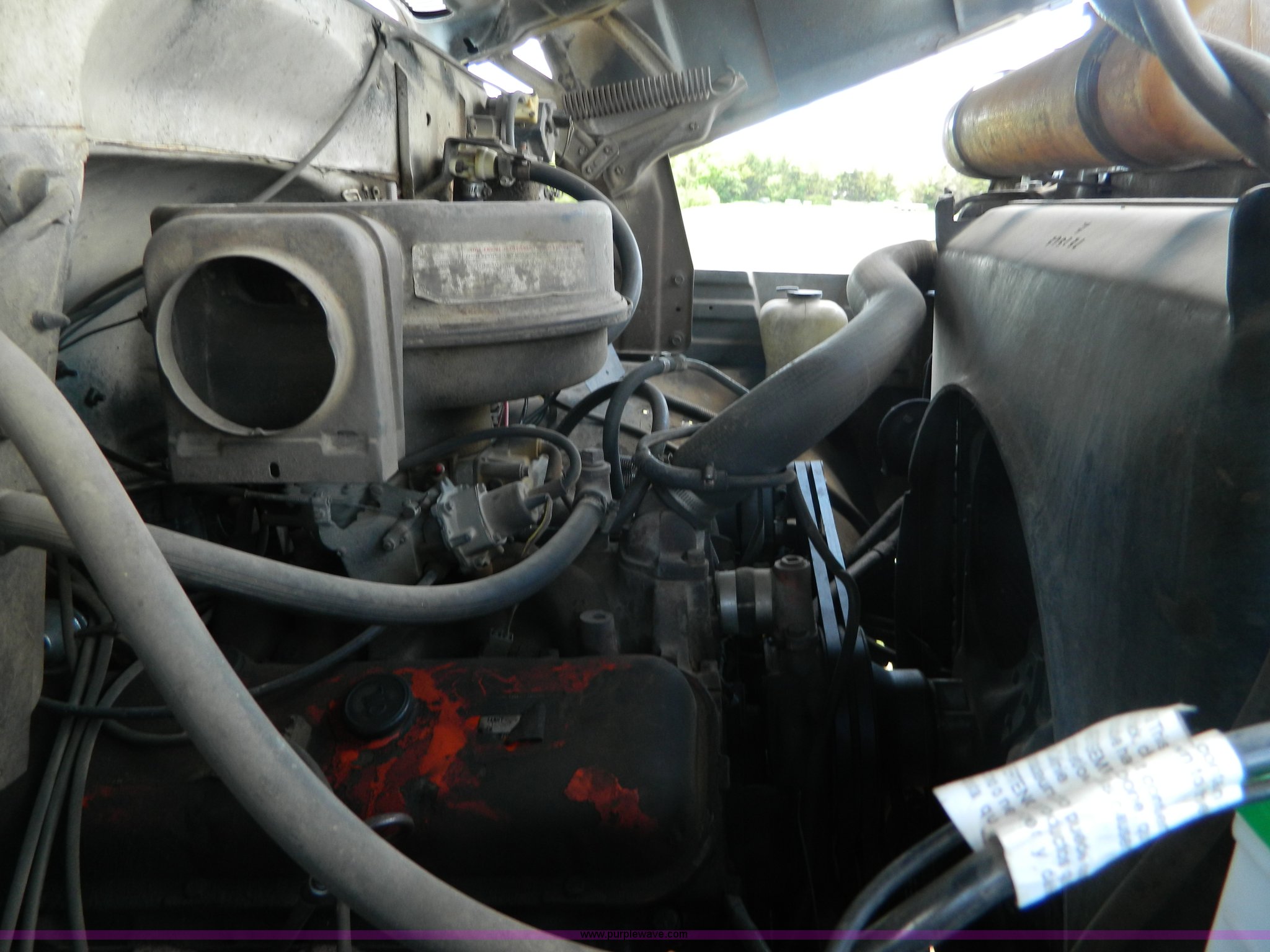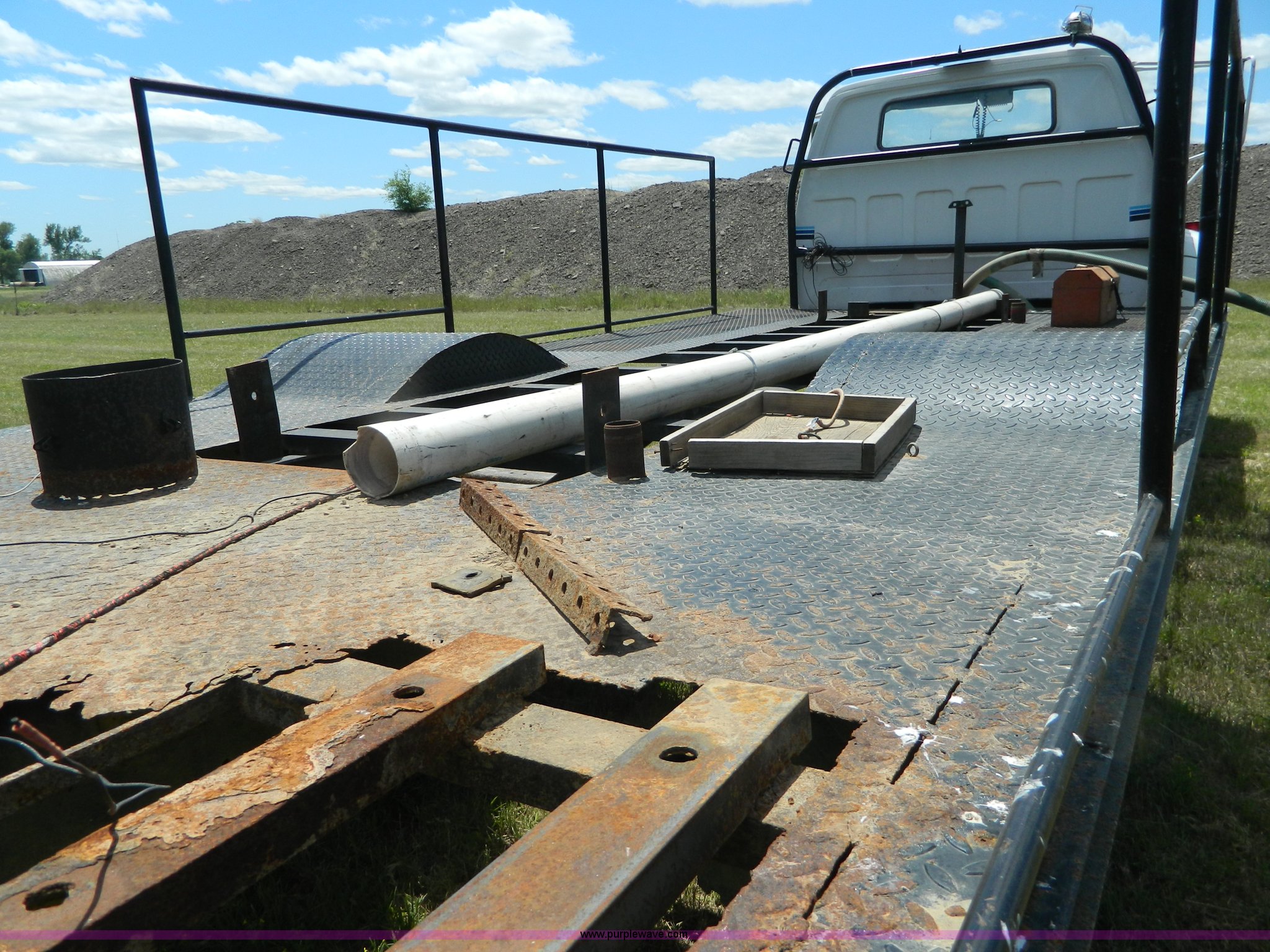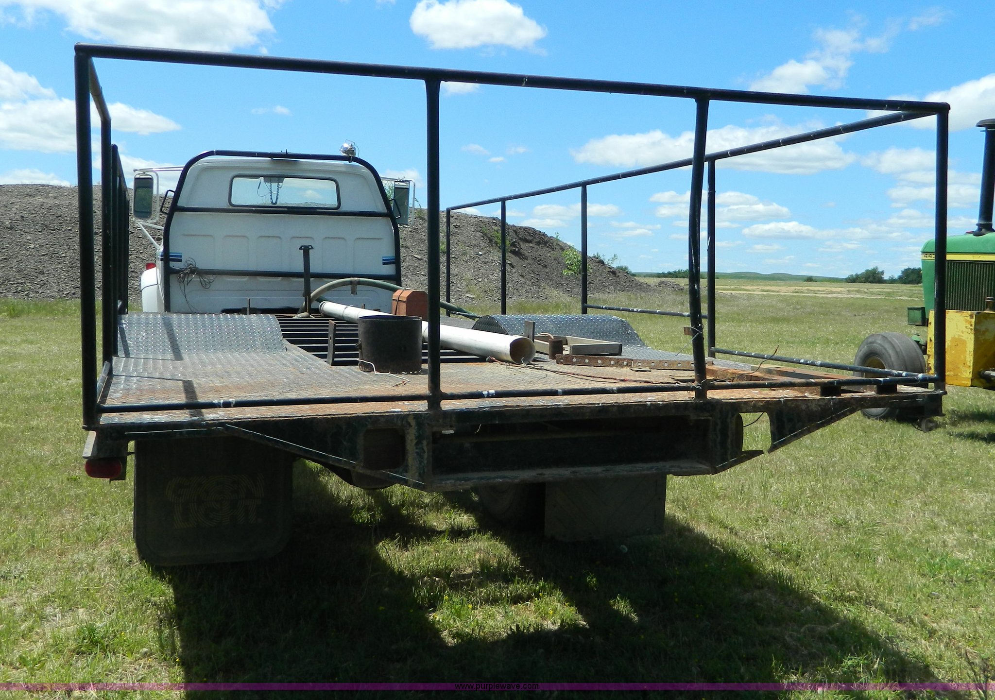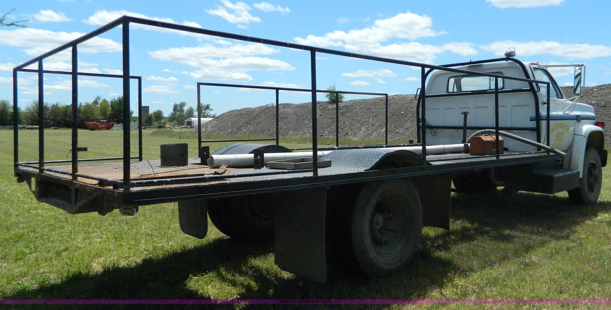Purple Wave is selling a used Flat Bed Truck in Kansas. This item is a 1975 Chevrolet C65 with the following: 33,335 miles on odometer, 366 cu. in. V8 gas engine, Five speed manual transmission, Two speed rear end, Micro brake, Heat, PTO, 19' x 102" flatbed, 203" wheelbase, 9.00-20 tires, Windshield cracked