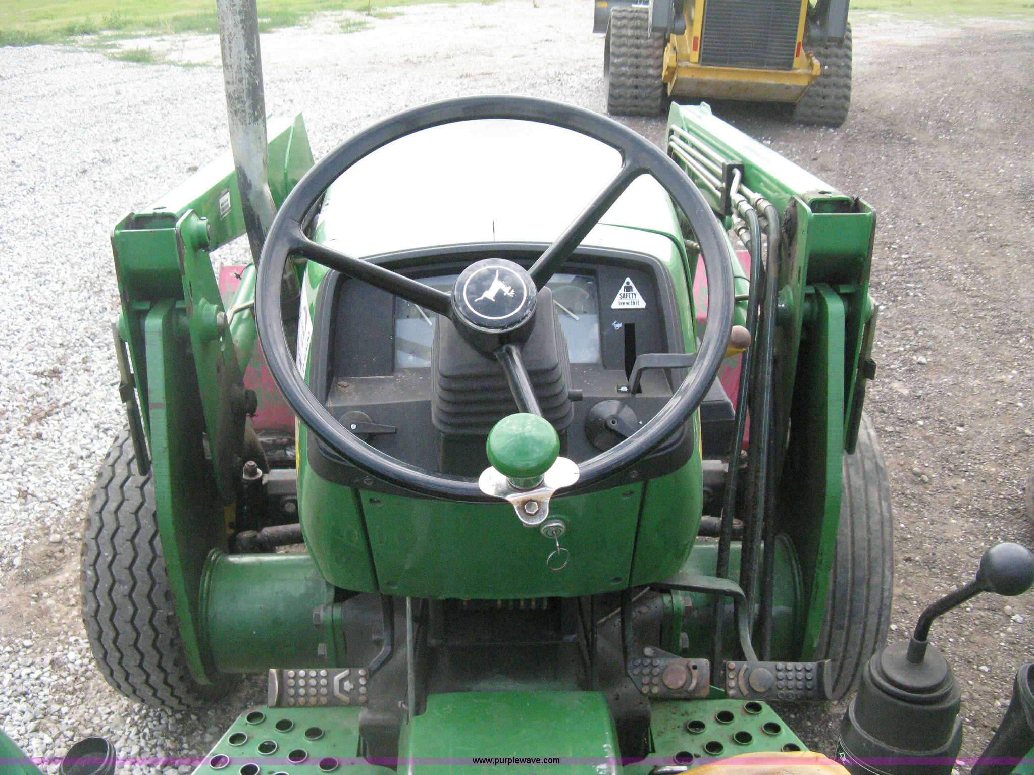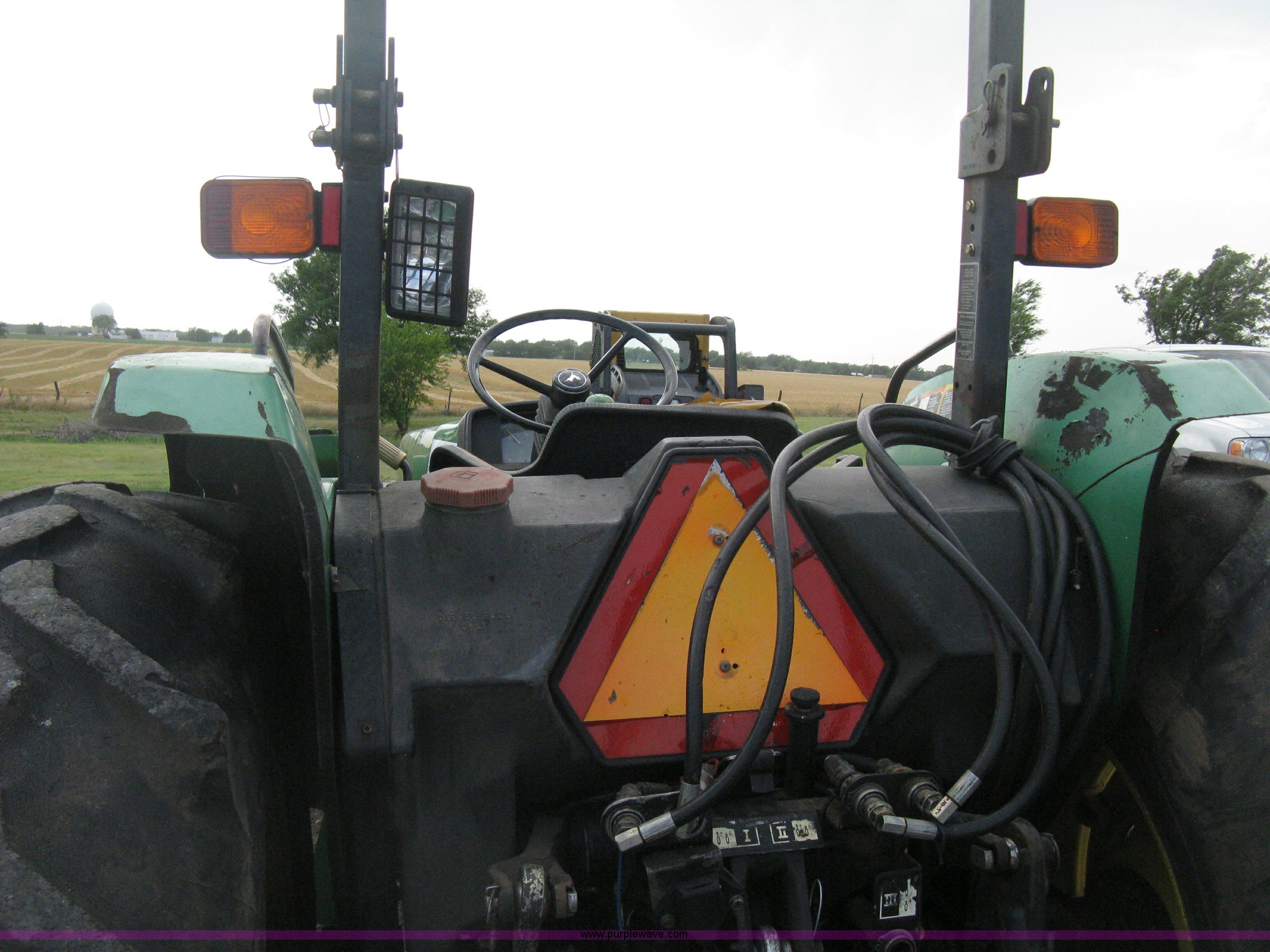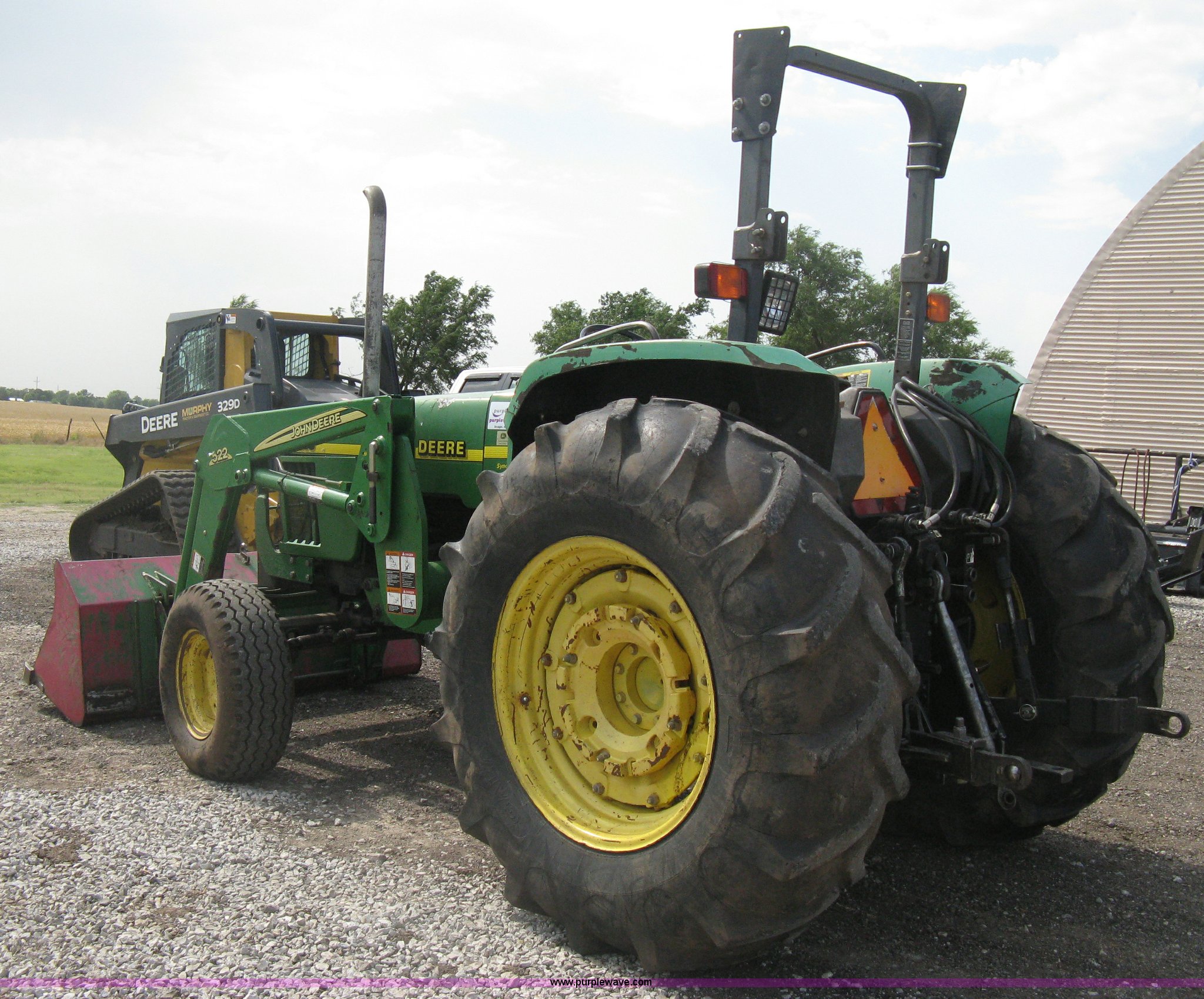 Purple Wave is selling a used Tractor in Kansas. This item is a 1998 John Deere 5510 tractor with the following: 6,213 hours on meter, John Deere four cylinder diesel engine, Serial PE4045T009129, Synchro shuttle transmission, 9F-3R gears, Suspension seat, Two post roll-over bar, Work lights, Caution lights, John Deere 522 loader, 6' bucket, Quick attach, Joystick loader control, Serial W00522X002038, Three point, Draw bar, Auxiliary outlet, 540 PTO, Single rear hydraulic remote, Front mount bumper style counter weight, (2) rear outer wheel weights, 11L-15SL front tires, 18.4-30 rear tires, (3) spare front tires, 11L-16SL unused, 11L-15 used, LT265/75R16 used, Recently replaced clutch, Serial LV5510S152084